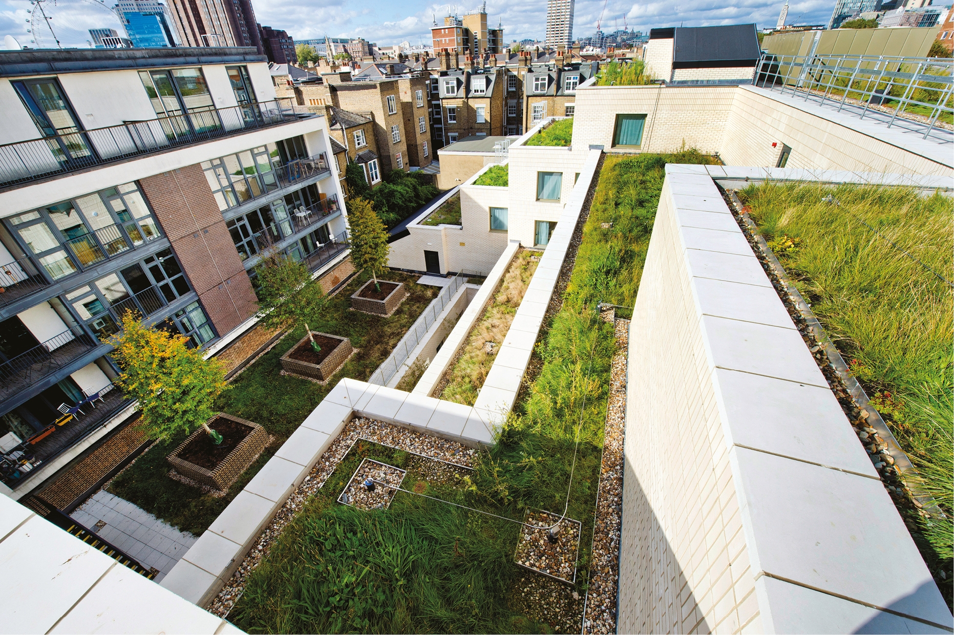 The hotel has two separate blocks of accommodation connected via an elegant lightweight glazed bridge link. A public route between the blocks leads through to a verdant pocket park with seating, sculpture, and abundant planting to create calm within the hubbub of city life. Diverse tree species will provide shade, as well as helping to improve local air quality. Native and ornamental plants will foster biodiversity throughout the scheme and a mosaic of wildflower and sedum green roofs will provide a habitat for wildlife.