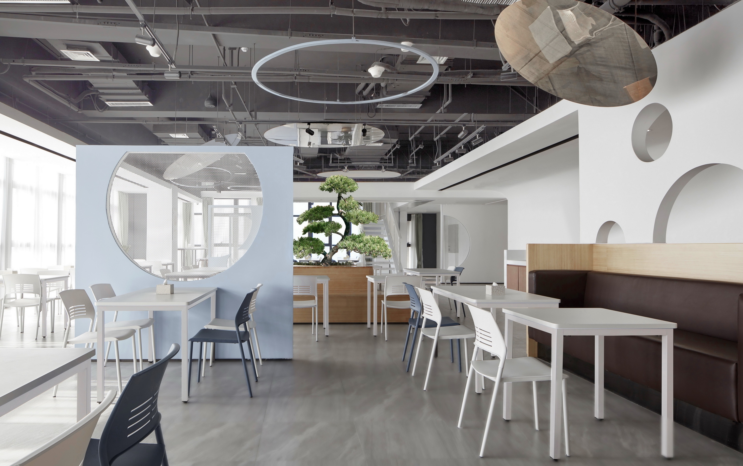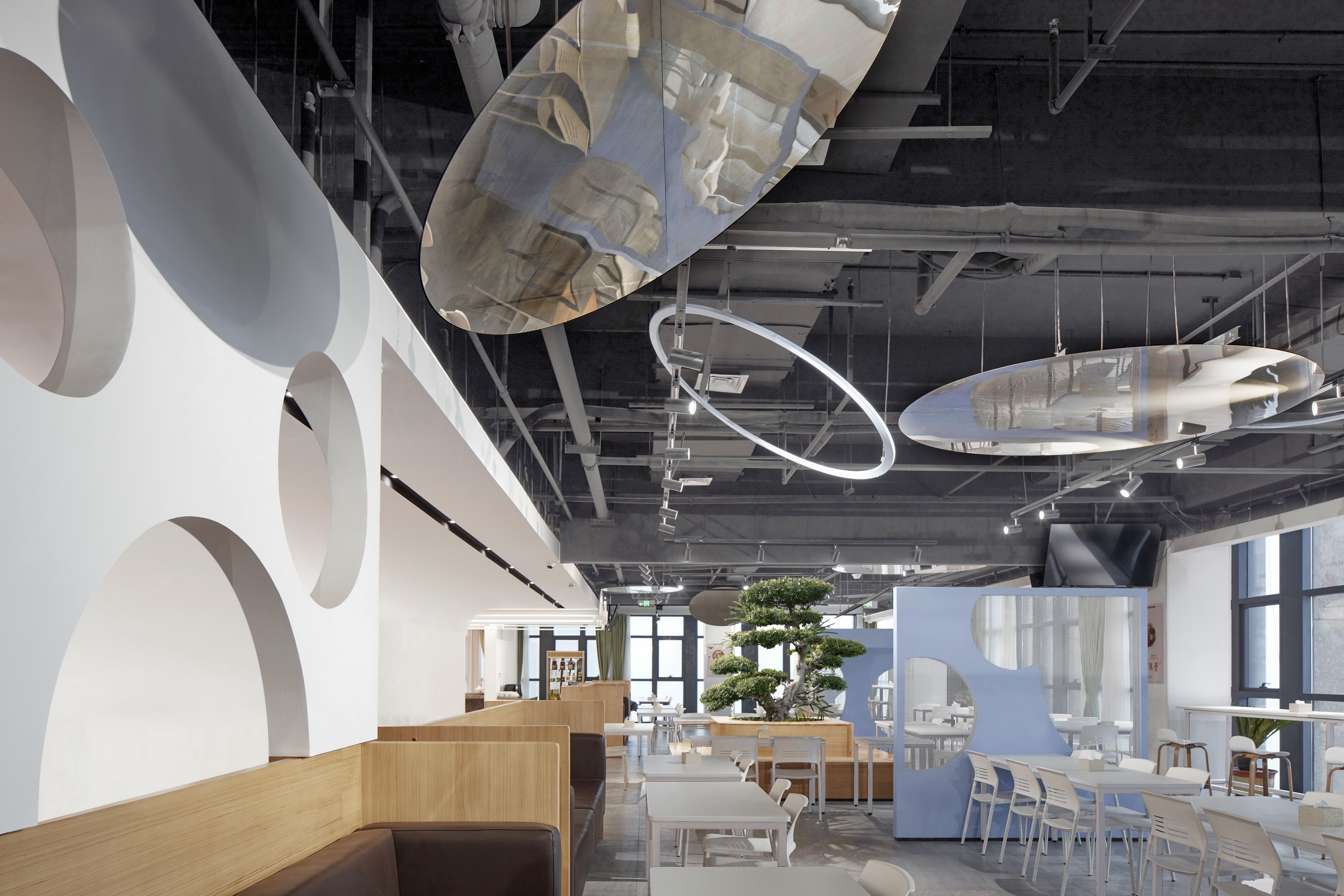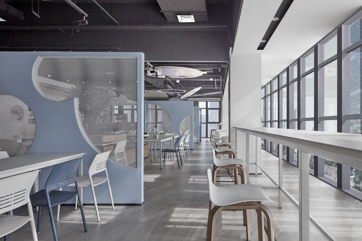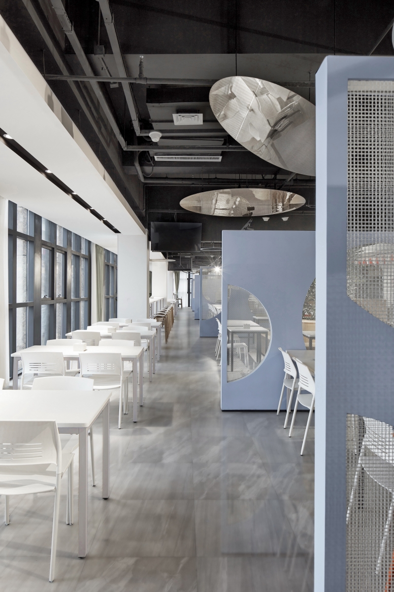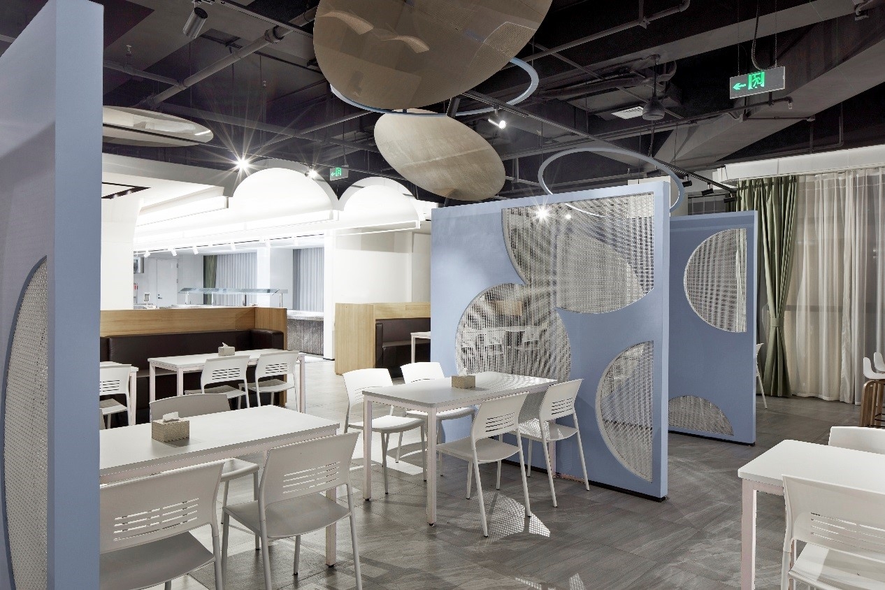 The difficulty of this design lies in the need to explore the space elements of the staff canteen, and implant the design from the line of sight and streamline.