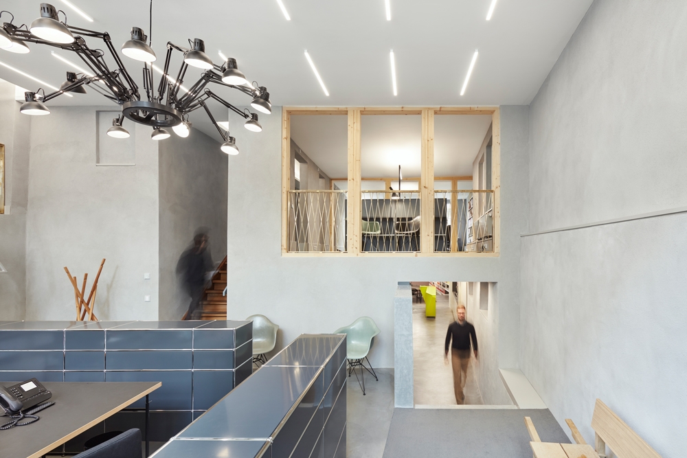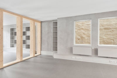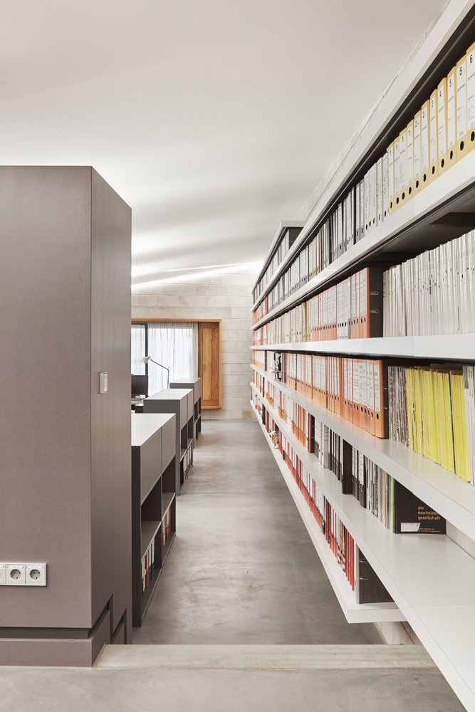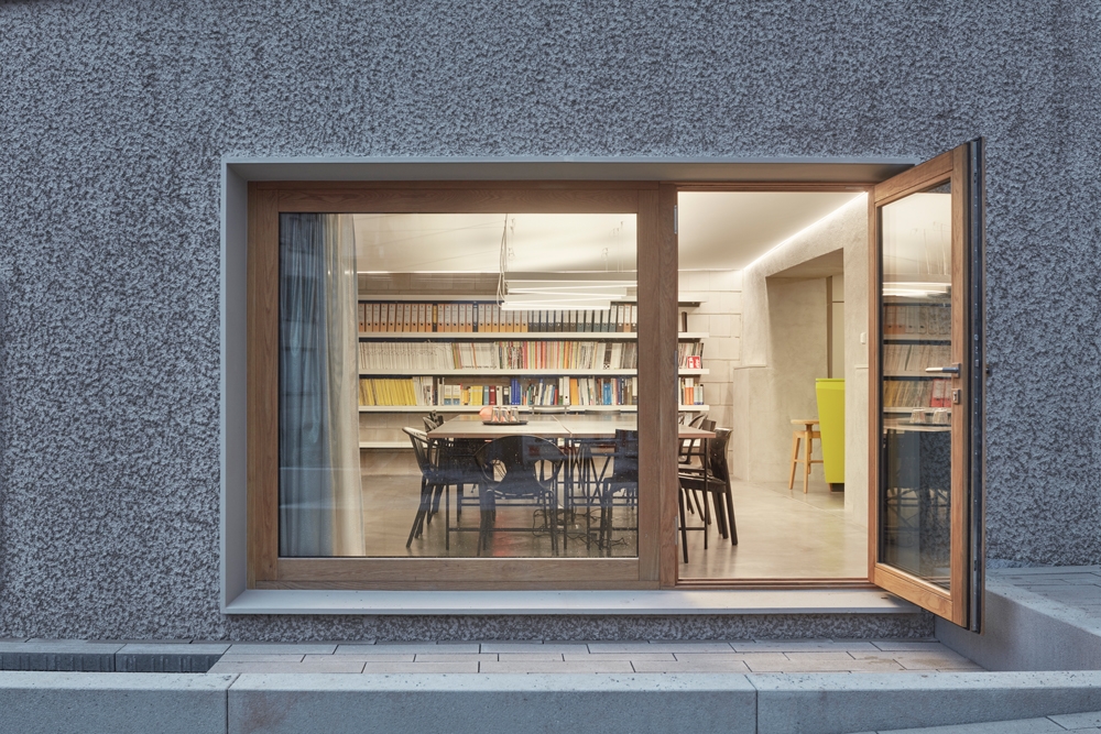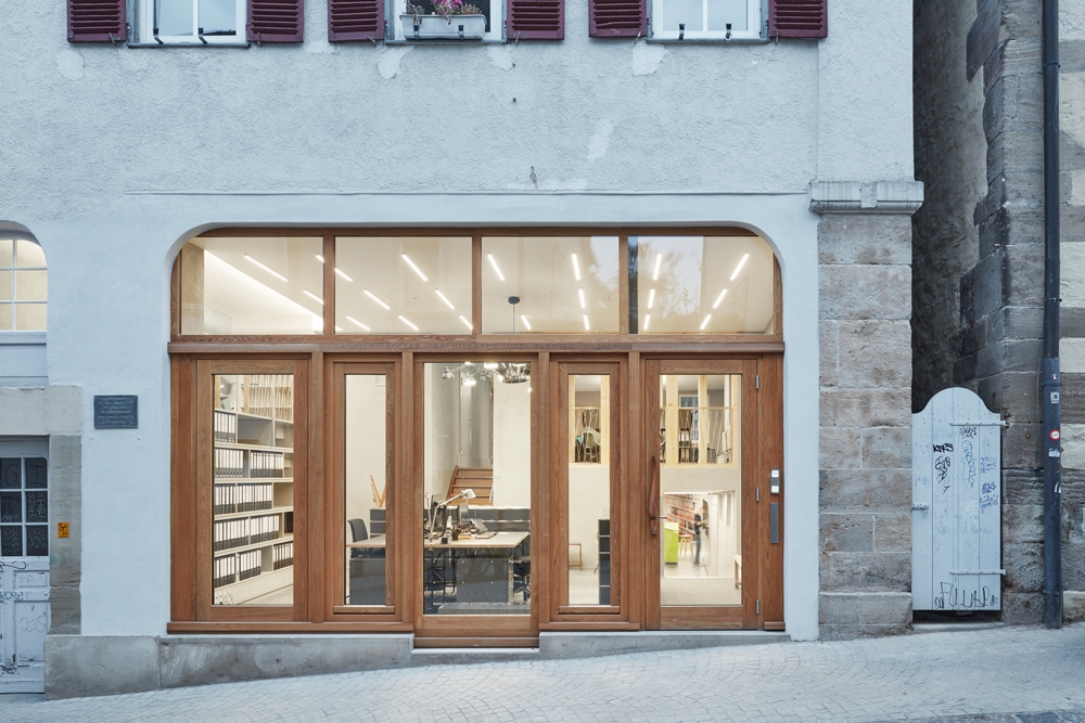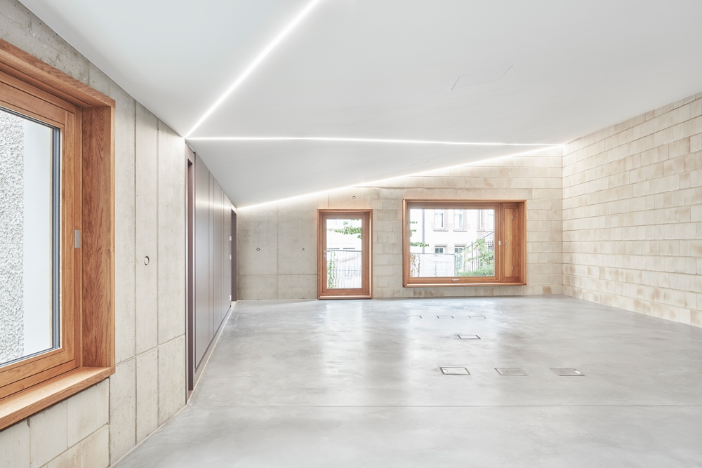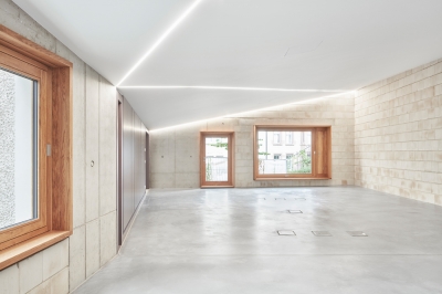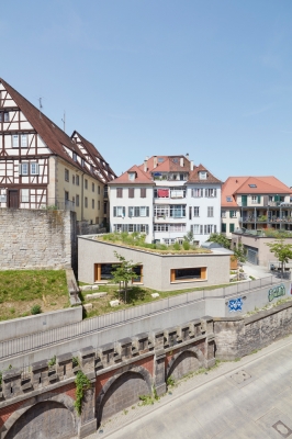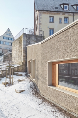 The neo-classical building conversion and extension blend into the historical context of the old town while retaining autonomy of style. The new building distinguishes itself from the old building with modern architecture language, yet forms a natural, integral part of the existing topography. Unfinished plaster matches the natural stone walls in the surrounding area. The green roofscape contrasts with the sculptural building structure, respectfully embedded into the terraced slope of Schulberg.