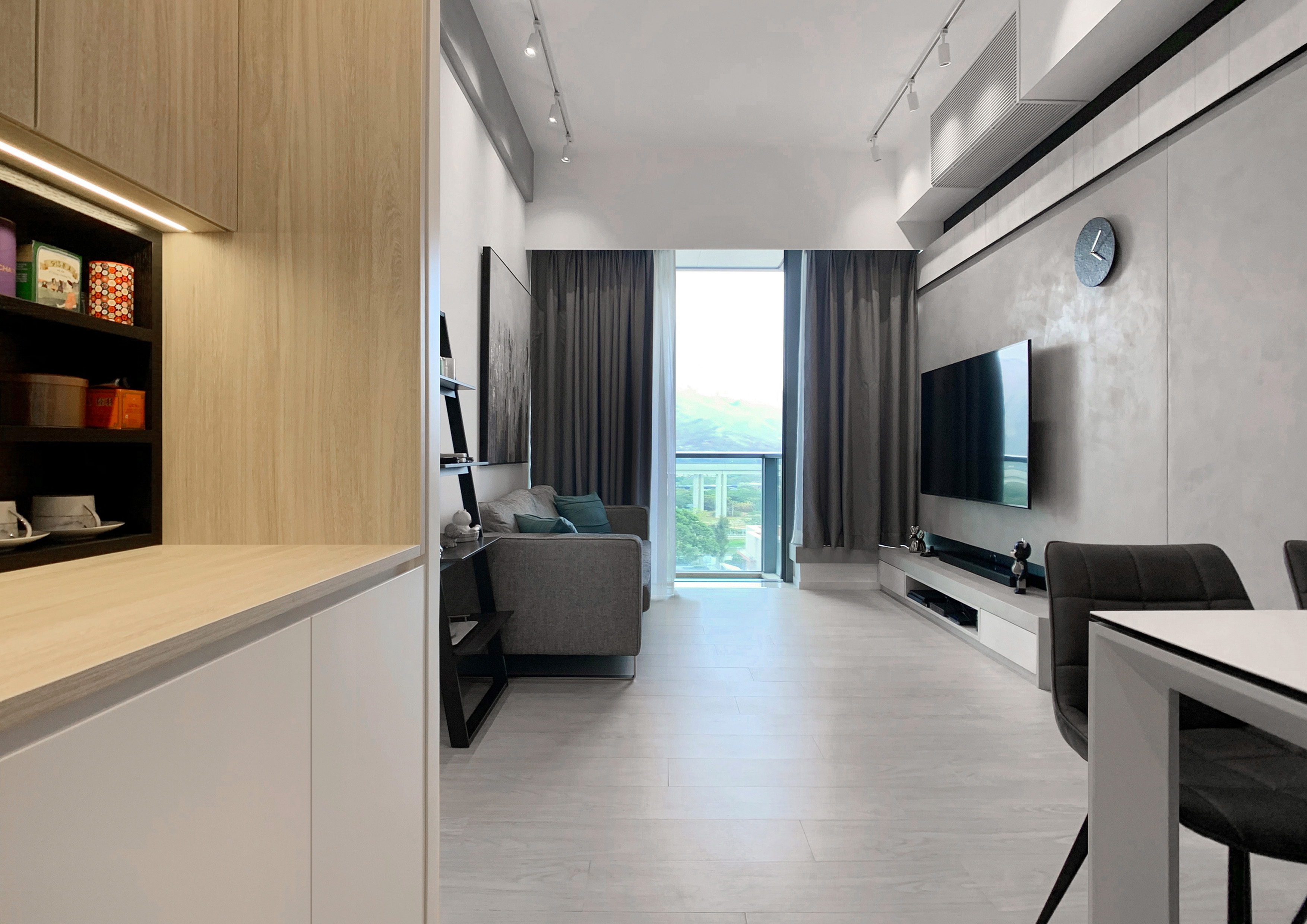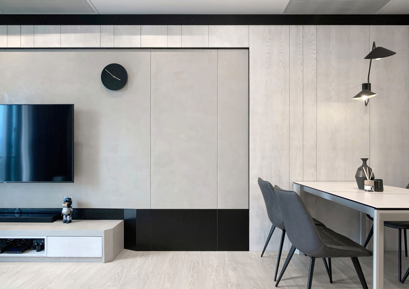 The relationship between the monotone (black, white, grey) and the vertical lines. It is a subtle way to divide a huge area into different levels and layers. The variation of the materials is not luxurious and complicated. But they will not make space have an empty or dull feeling. Distinguish the living room and the dining room perfectly.