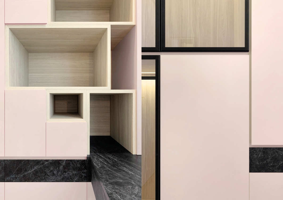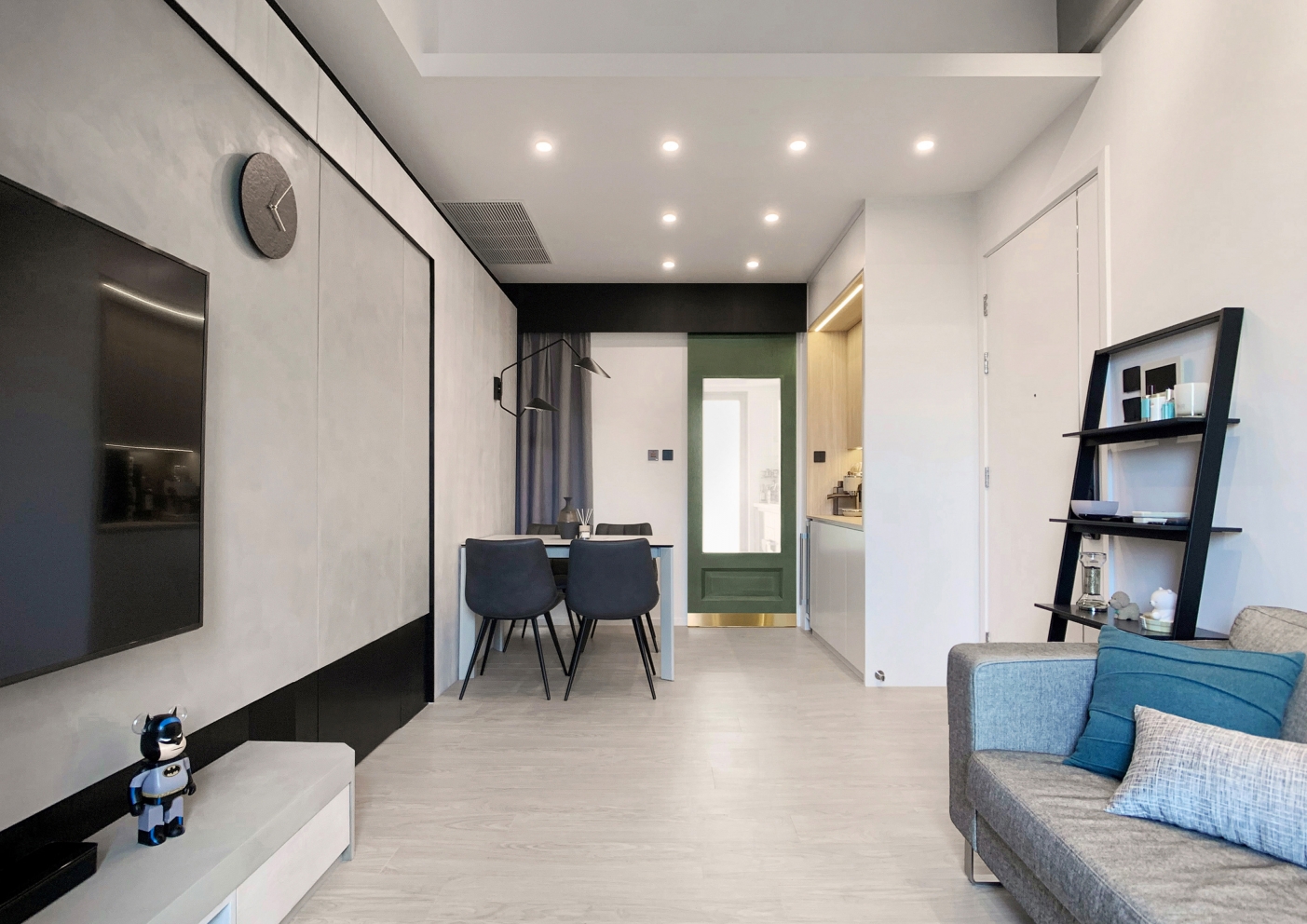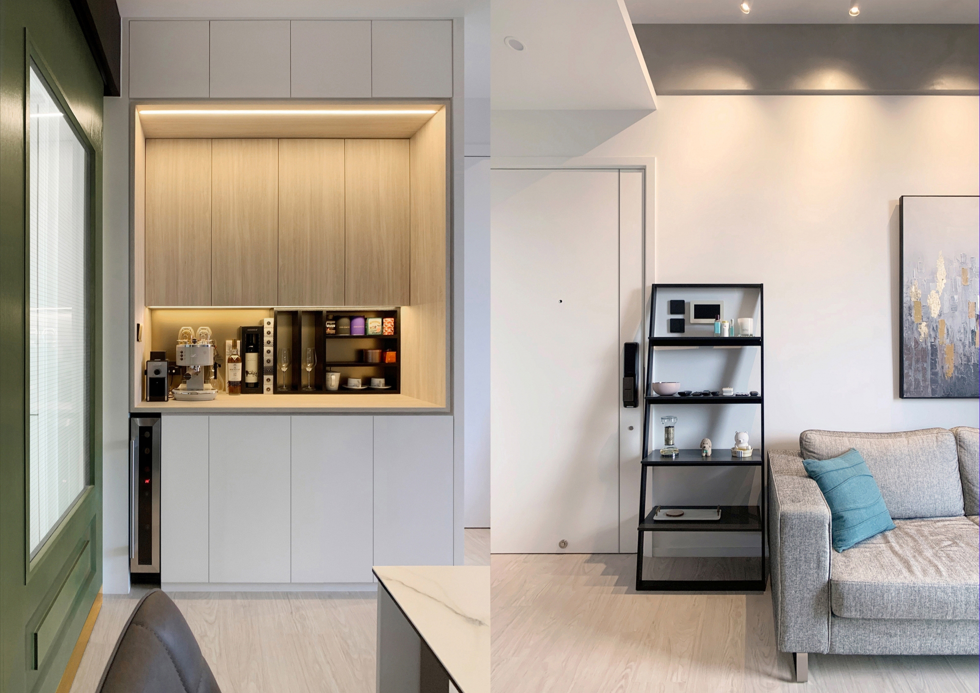 There has a kitchen door in military green to increase eye-catching. The upper part of the door in black color which is connected to the black part above the feature wall, makes the whole space feel more coherent.