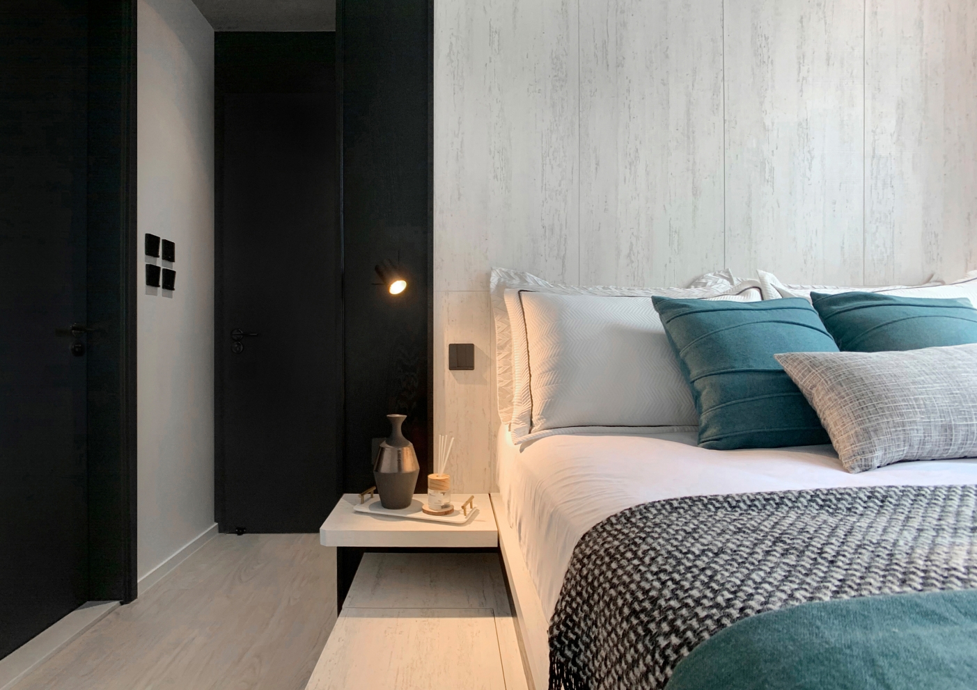 The headboard is a full-height design with a combination of light wood veneer in the middle and the black wood veneer on both two sides, making the area more stylish.
