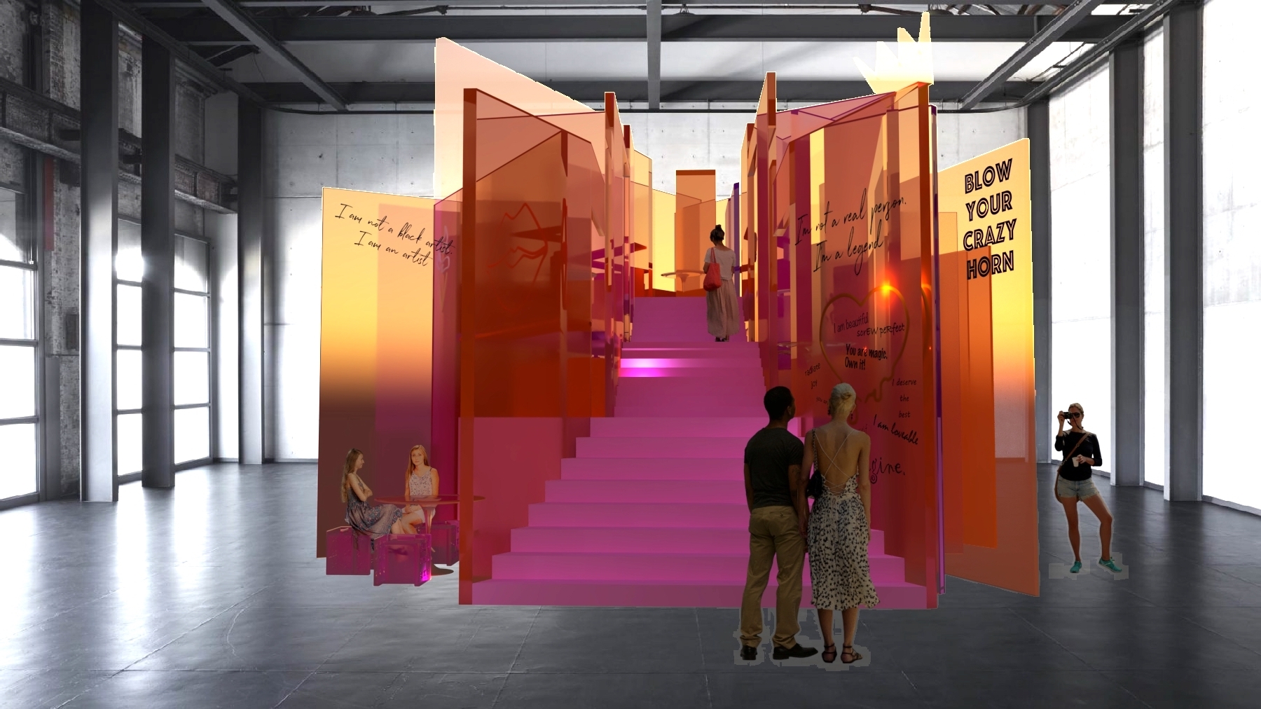 The design is transparent, colourful and vibrantly contemporary – a high contrast to the industrial host of the Carriageworks. Made of perspex acrylic, guests are invited to graffiti the walls of Ascend with messages of joy. Over time the concept cafe will evolve – a making of everyone who makes up Ascend.