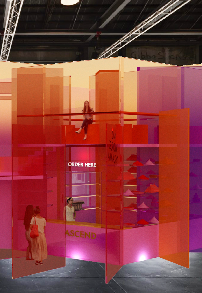 Ascend is a vibrant design solution for a pop-up cafe in collaboration with Sydney Festival and Carriageworks Sydney. Ascend to joy in this pop-up cafe – an inspiring collective of colour, art and amazing architectural cakes.