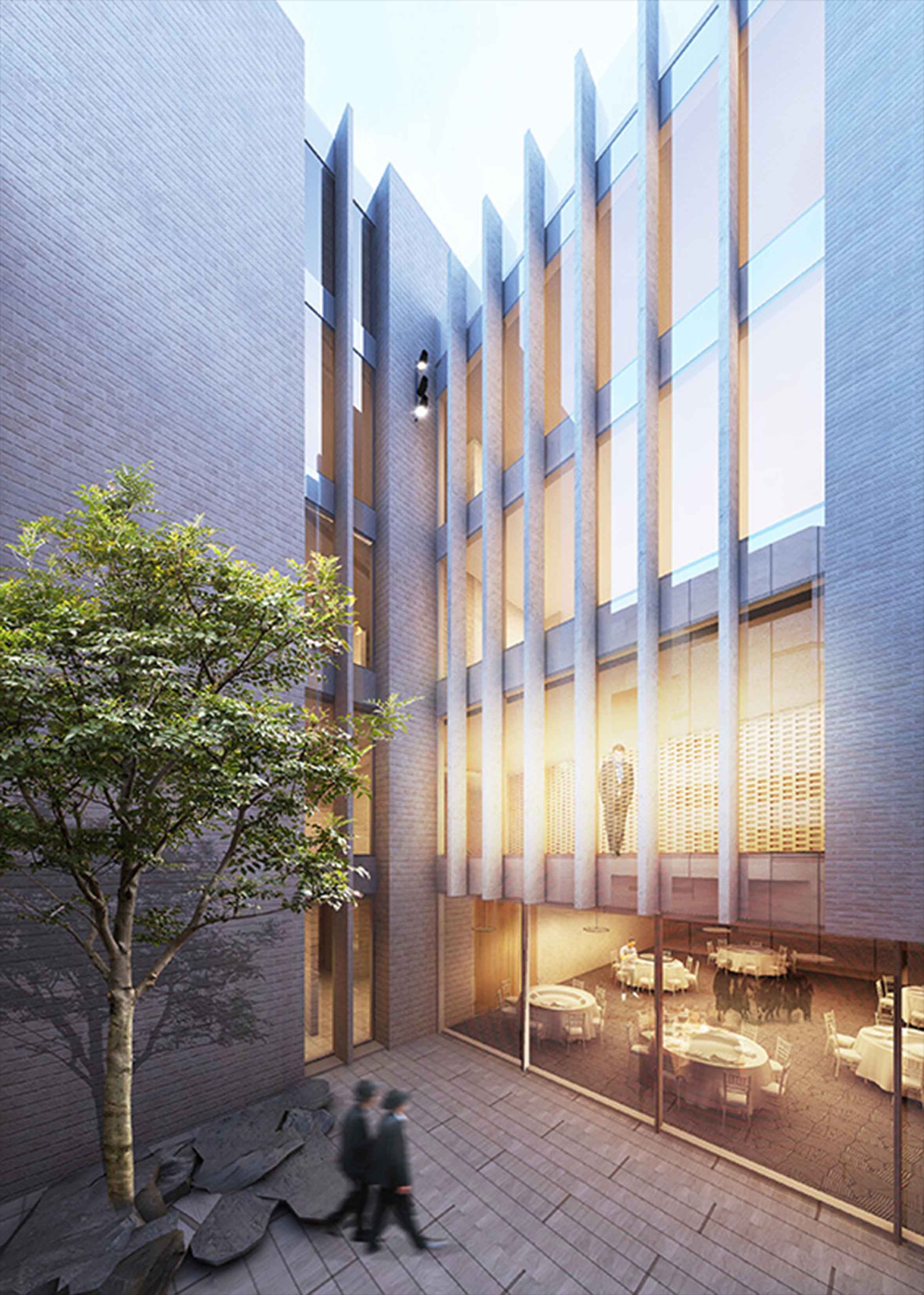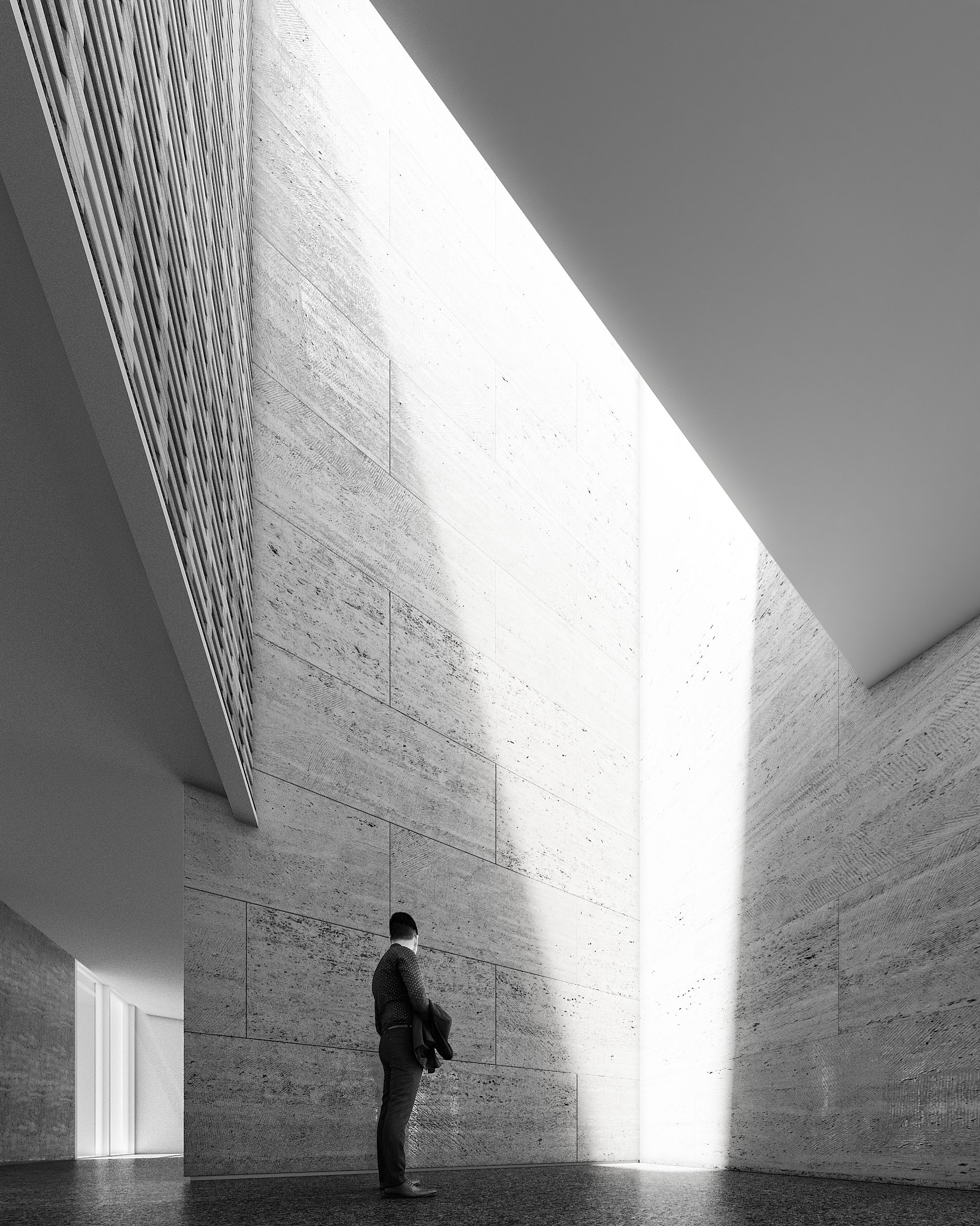 The concept is composed by the interaction of two bodies, one given by the rectangular shape of the land and another body that incorporates the main program of the building creating a bay that marks the access to the building; to the public and private spaces and their circulation. The program consists of a main temple on two levels and naturally lit from above through a translucent dome at the top of the temple, a small temple, a library, study area and cafeteria; all spaces in the building are naturally illuminated with vertical lights inputs.