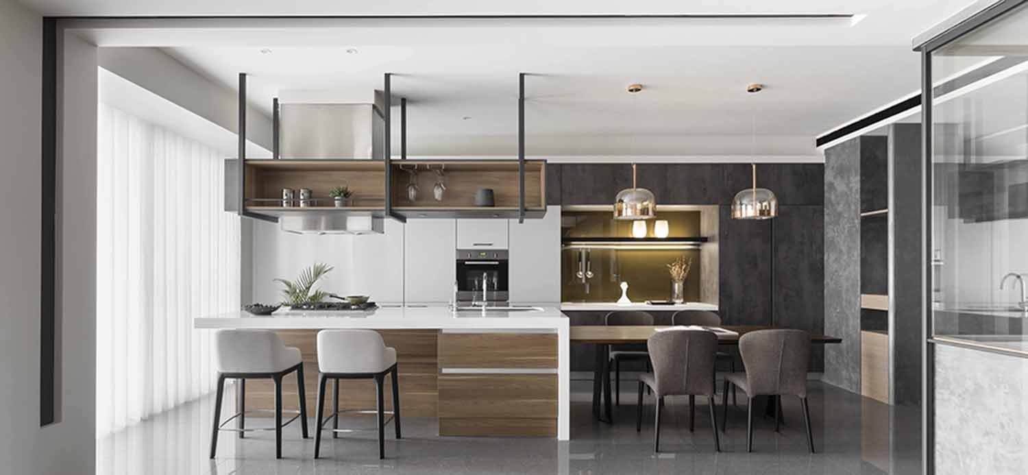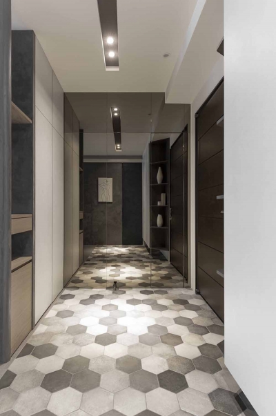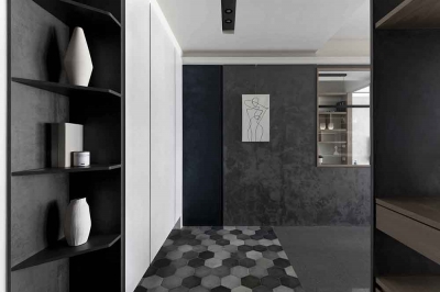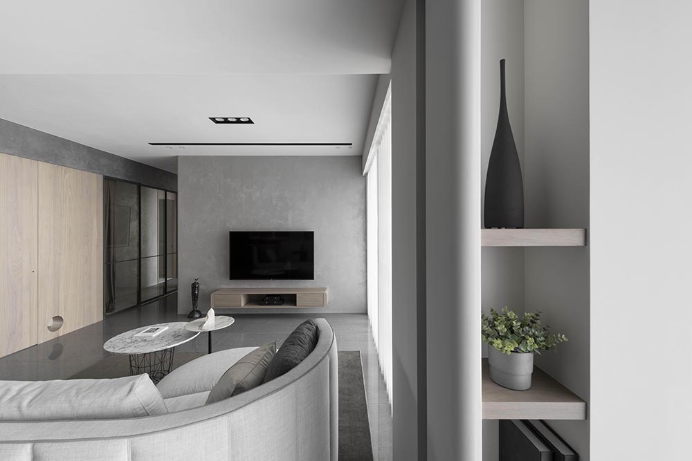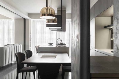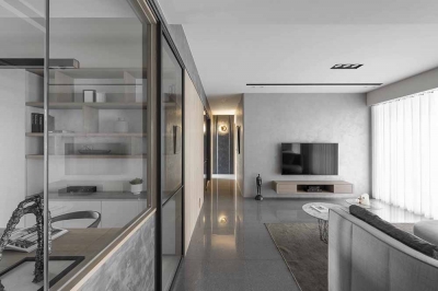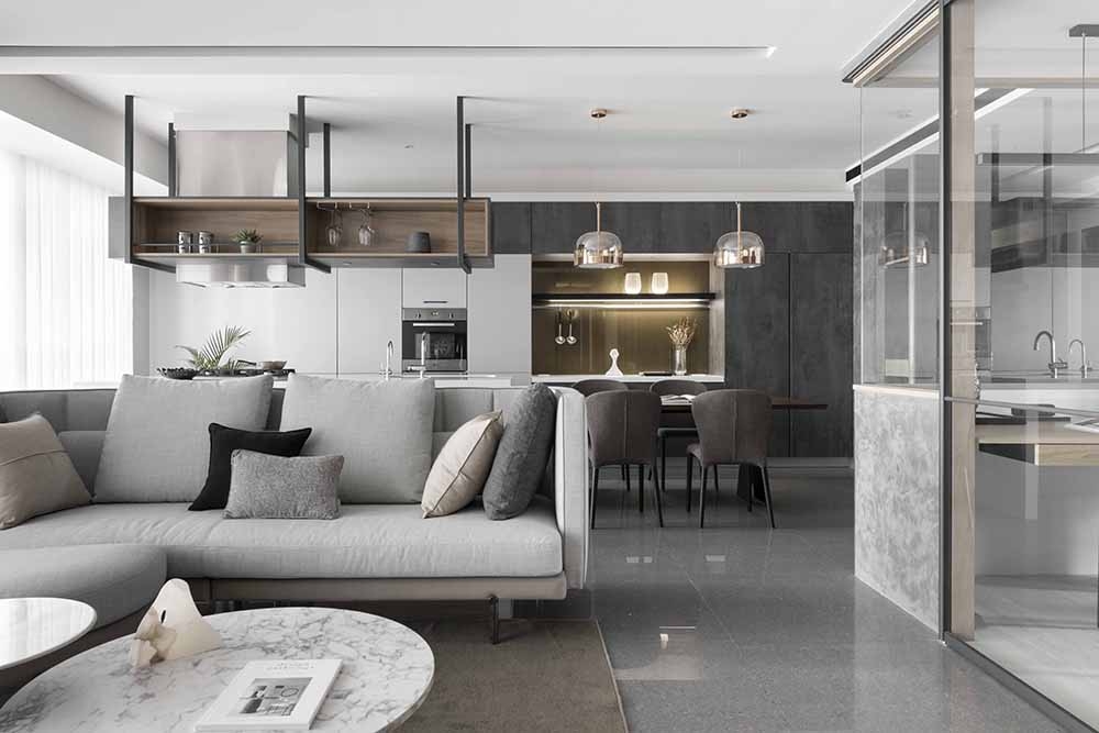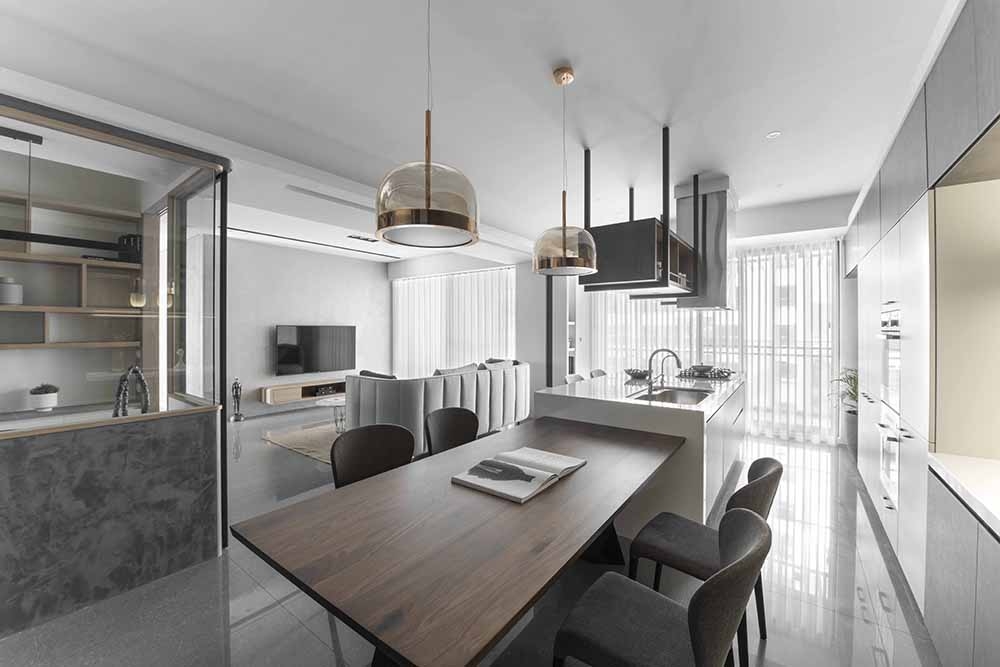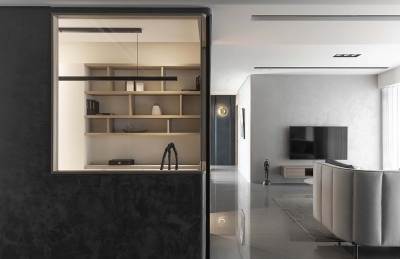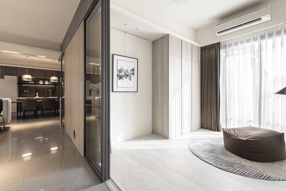 The public and private spheres have sufficient natural lighting in this project. The team utilizes this natural advantage, so they apply transparent glass in many ways to maintain the transparency and brightness of the balcony, study room, and bedroom in the residence. While at the same time, iron accessories, mirror materials, and wooden elements are adopted in this simple spatial tone. With metal chandeliers appropriately embellished, the space presents a warm, clear, and transparent atmosphere. Under the grayscale color system of black and gray and the dark moon, the space has a consistent adjustment of light and dark, and in the interlacing of different materials, it shows an elegant and calm spatial tone, giving the family a warm, fresh and comfortable feeling. In the planning of traffic flows, a cat hole space that pets can move freely has been added to create a pet-friendly and comfortable environment. In addition, the team ensures the health of the clients, so the F1 low-formaldehyde building materials are used in the space to achieve a safe and non-toxic living environment.
