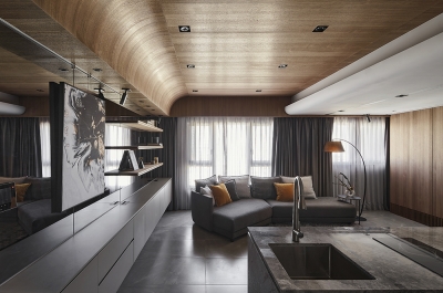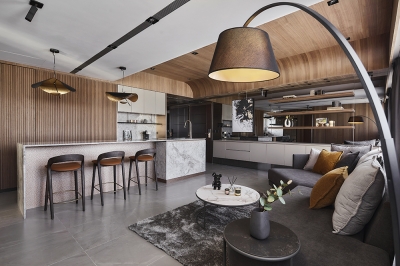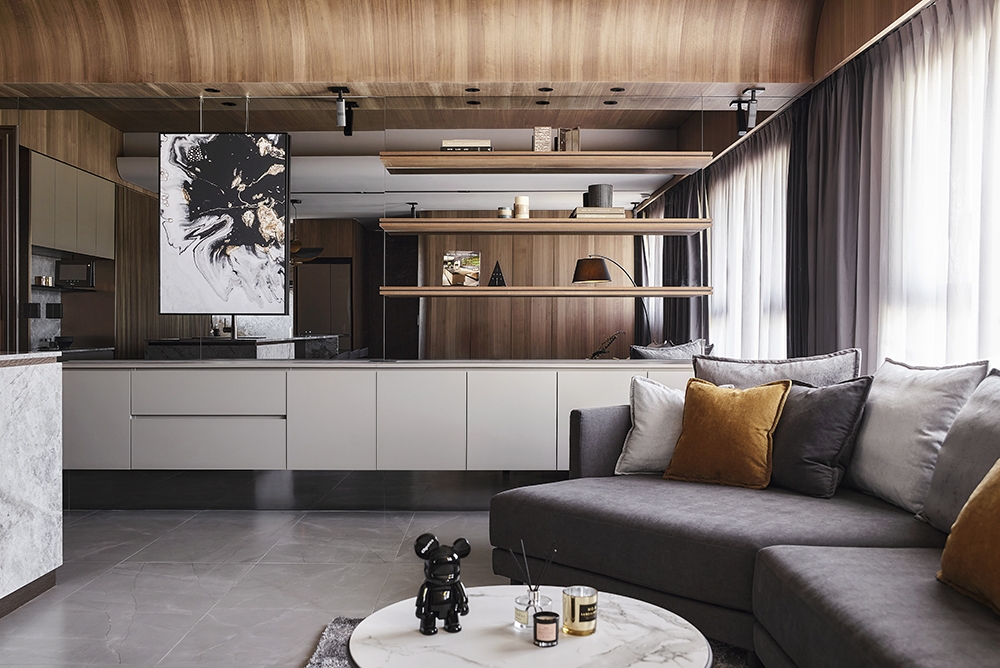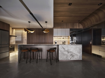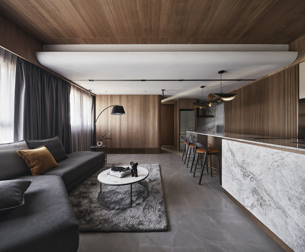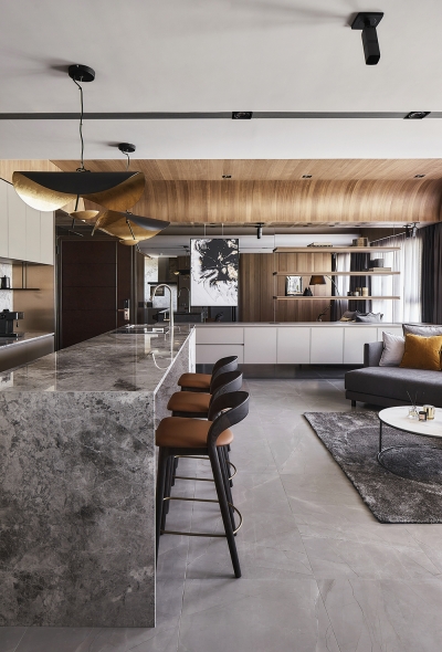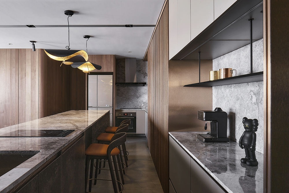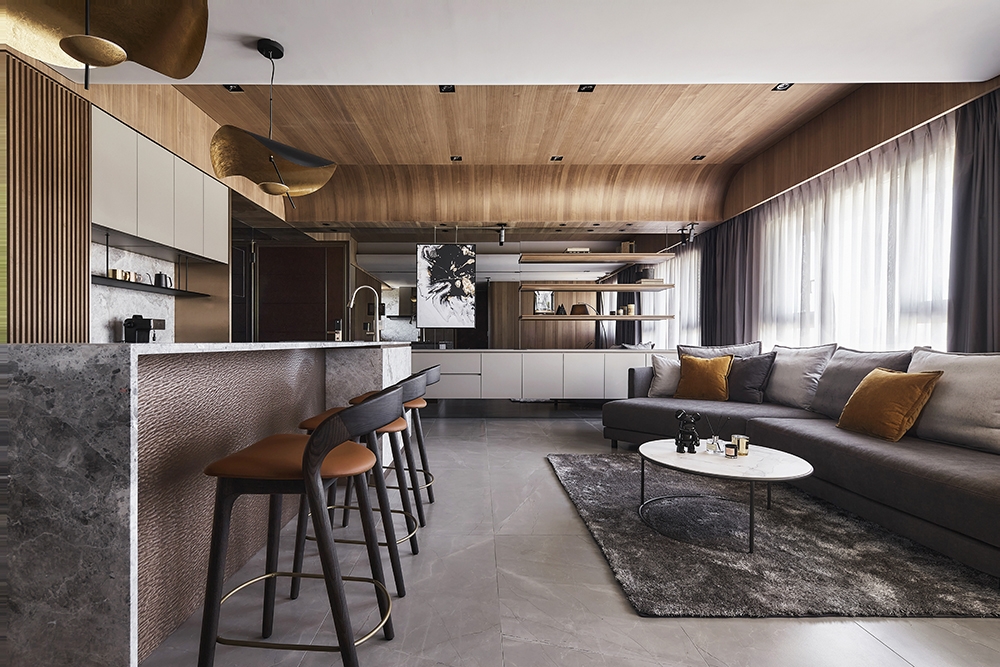 “Among all nature gifts, time is the most precious.” A good design should embrace the trajectory of time and the lifestyle and trace of its user. The owner of the house is in his early 20s and values friendship, social connections, and a metropolis lifestyle. Within 65 m² of space, the house is divided into two parts. A low-key luxurious public area and a serene private area to keep the privacy of the owner. The public space is to serve the owner's metropolis lifestyle with low-key luxuriance. The heart of the area is an elongated island function as a lounge, a dining table, and a kitchen island bar. The living room and kitchen are centered by the island that conjoined the spaces to an open club scenario where the house owner and his guests can comfortably interact through space. The focus of the project is to balance between low-key luxuriance and a sense of serenity of residence space.