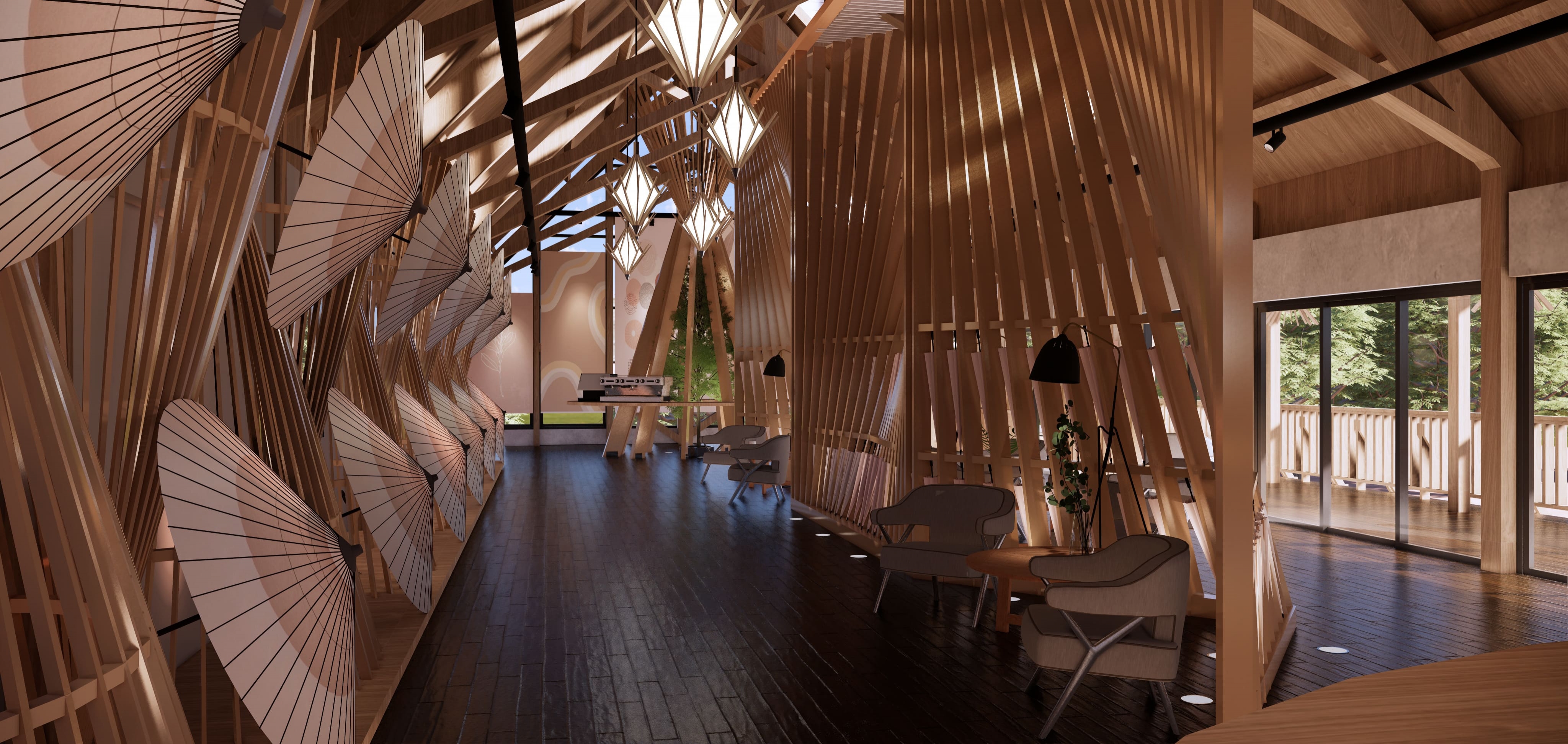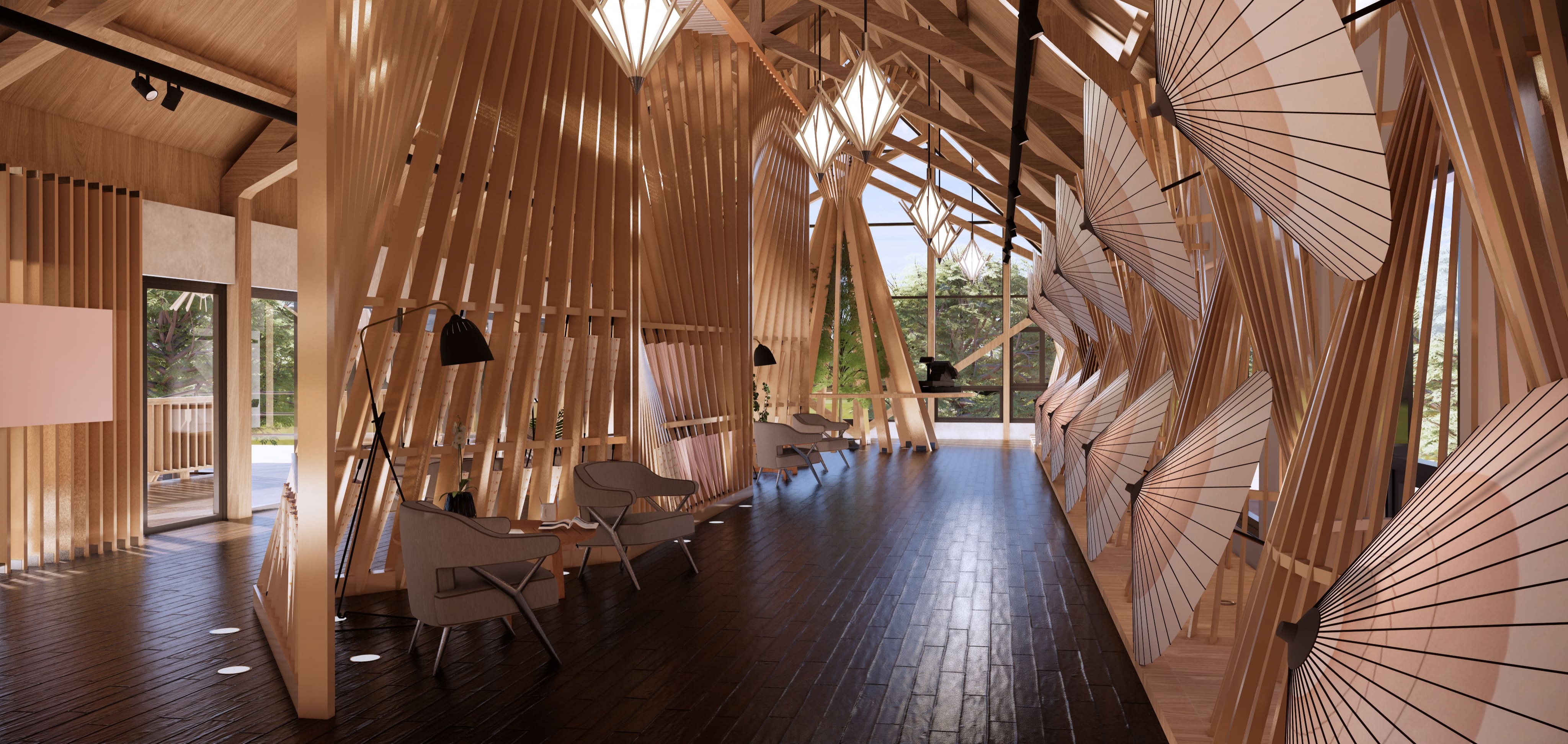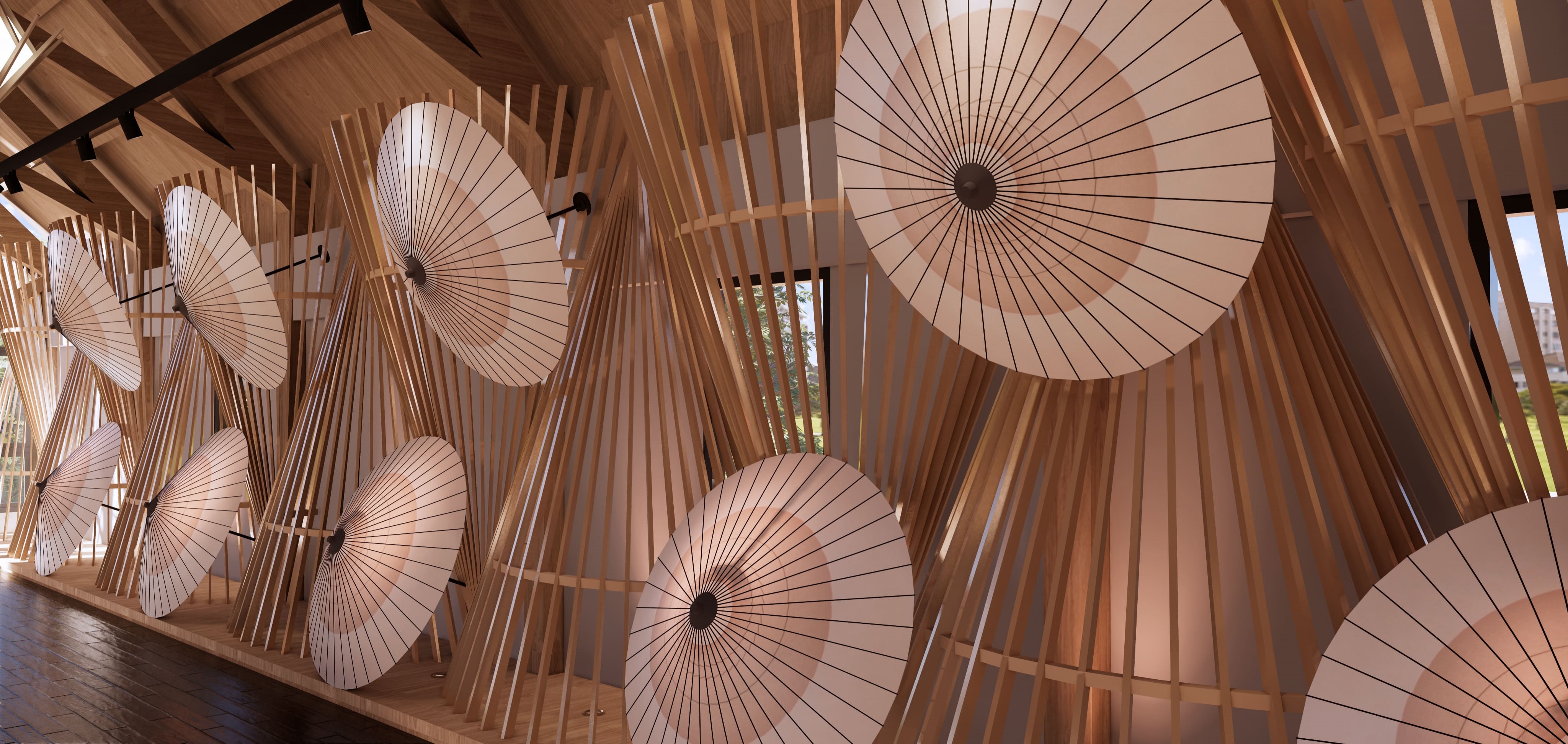 This shop is located in the suburb area.The building is surrounded by forest. By early afternoon sunlight. Which is more quiet and slow-pace.The focus of interior design is to show the effect of modeling cabinets.This design is inspired by the backbone of an oiled umbrella.The beautiful and orderly modeling section is formed by the arrangement of wood skeletons.The continuous pattern and product could smoothly merges into the display stands inside the space. Furthermore, soft light has enhanced the beauty of this design and also created a warm and relaxing environment.