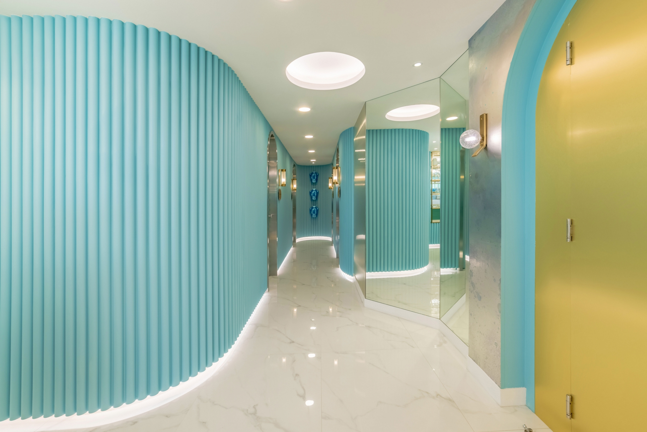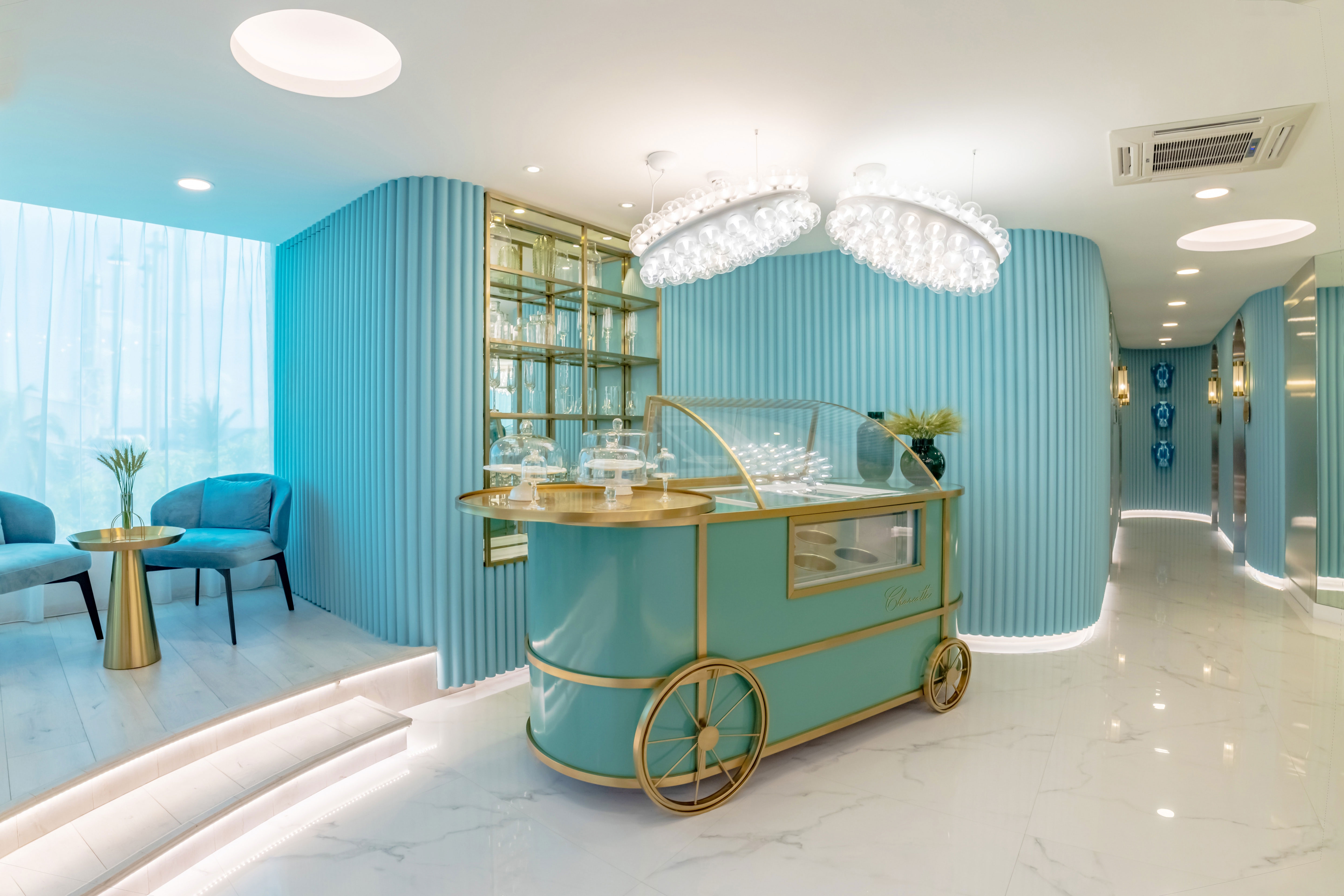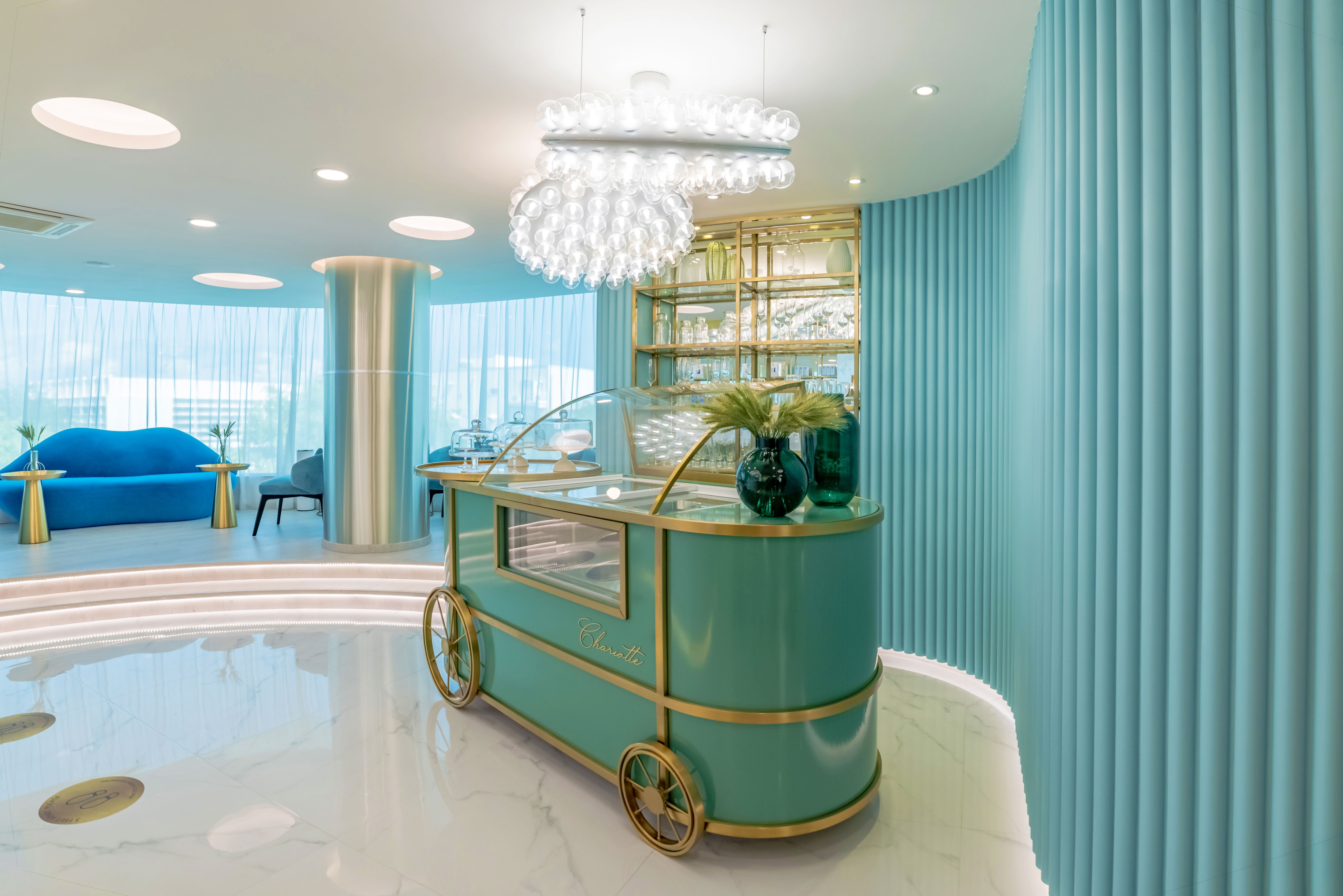 The surfaces feature contrasting materials such as metal and lush velvety fabrics. This pairs with the soft comforting lighting, maximised by mirrors. The textures involved have been conscientiously picked with the intention of fascinating the tactile senses, while the refreshment cart serving delicacies allows the visitor to indulge their olfactory and gustatory senses.
