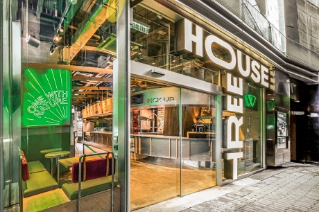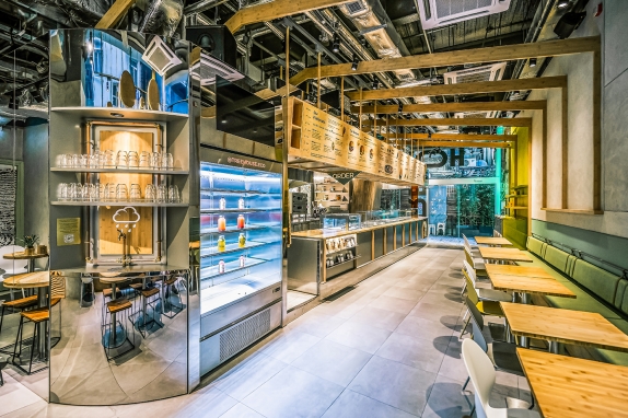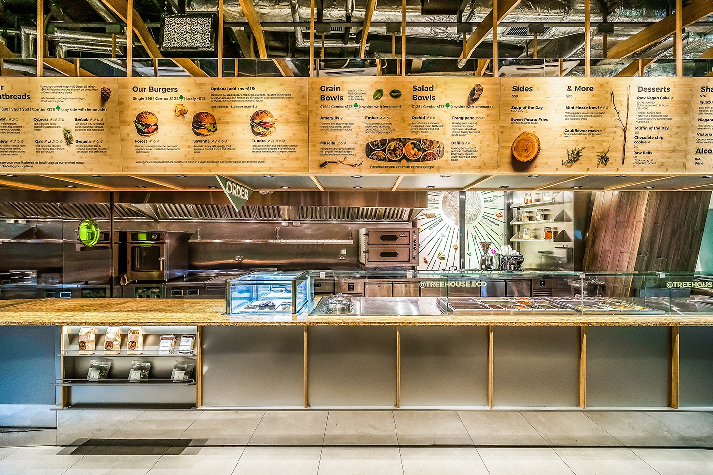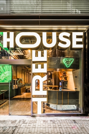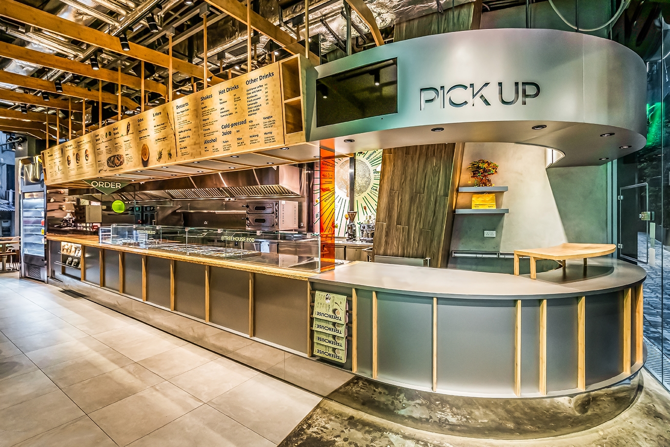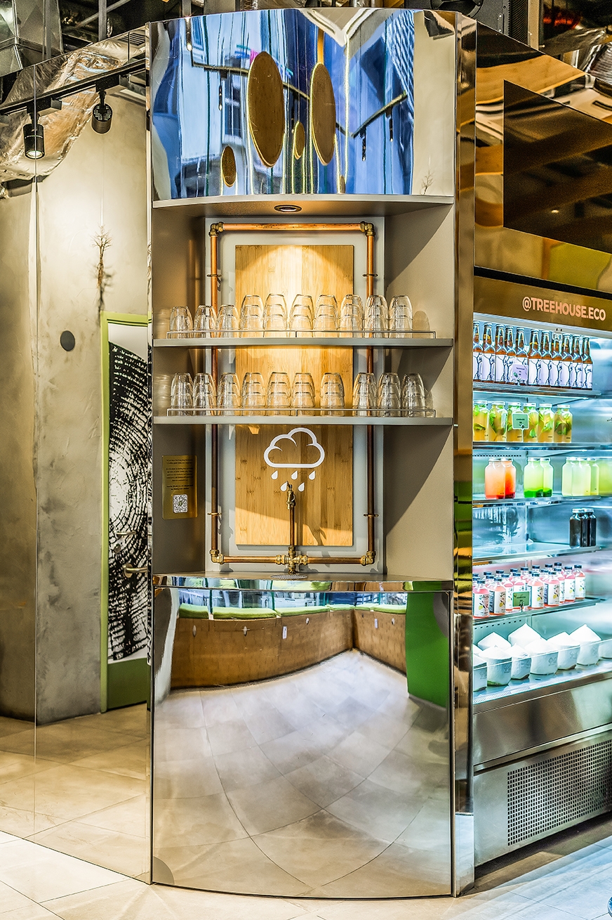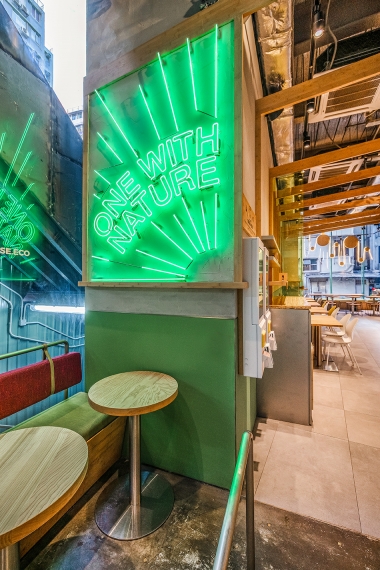 The design of the 170-square-meter restaurant centers around the concept of a treehouse through the use of various organic plant-based materials, offering customers the opportunity to connect with nature while navigating the city life. The wood-lined interior features Kirei wood and bamboo furnishings on table-tops, slates, wall coverings and many other decorative details. The material palette uses materials in their original colour and finish wherever possible. Such approach is both environmentally friendly and sustainable, while evoking the feeling of a homely and cozy hideaway.