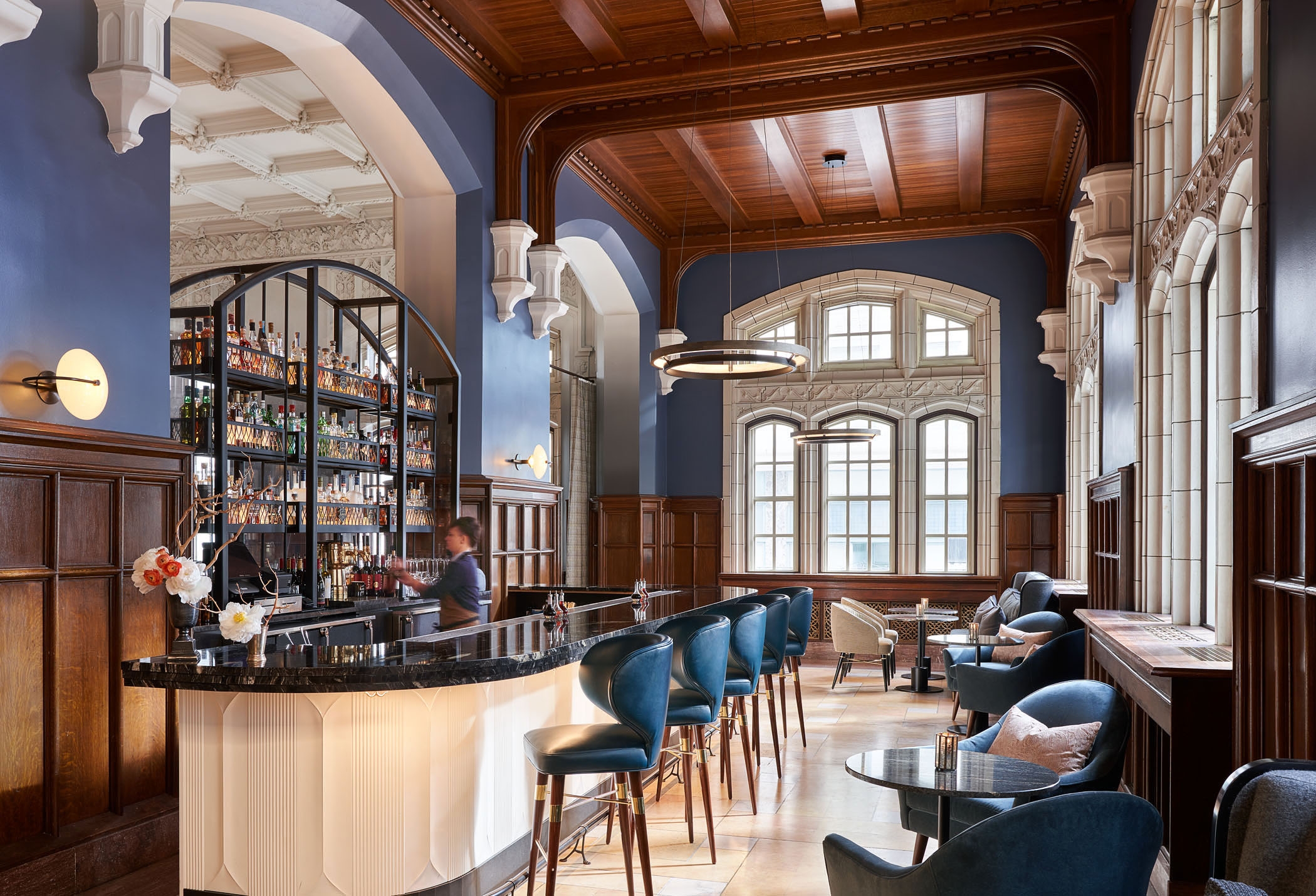 Woven throughout the lobby is a mix of contemporary and original chandeliers, gothic details, and a punctuating staircase – all serving as reminders of the iconic club that once was. With natural woods, stones of yellow, and jewel-tone accents, the color palette is classic yet spirited.