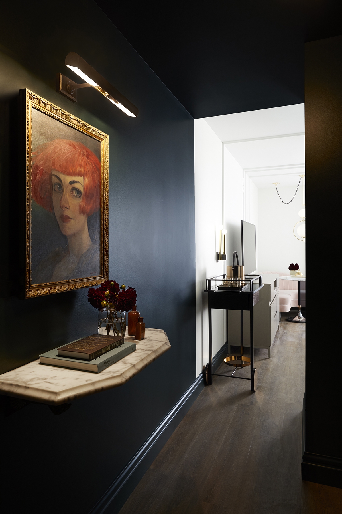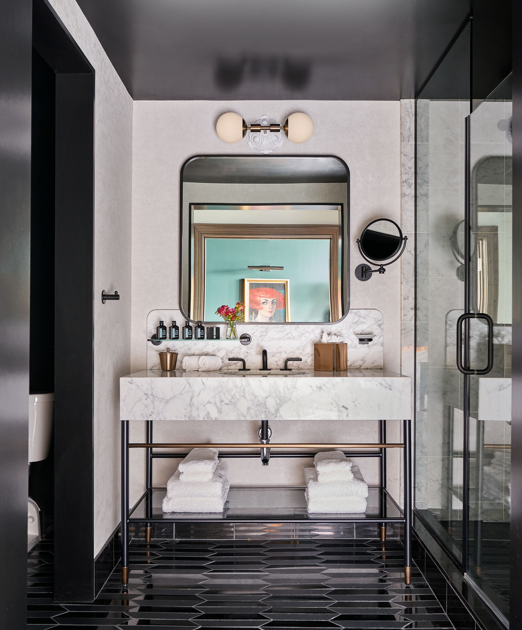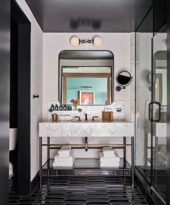 Victorian-inspired guestrooms were designed to evoke whimsy through elements of surprise and unexpectedly magical moments while balancing timeless styles with unconventional twists. Drapery resembles dress necklines, side lamps mirror skirt hoops, and bathroom double doors mimic armoires, while soft, feminine shapes contrast the antique masculinity of the building’s architecture.