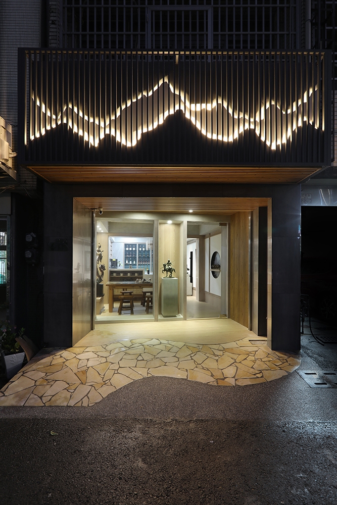 In accordance with the owner’s wish, a makeover has to be launched to make up for the unusual location and layout. Adjacent to old buildings on either side, the presence and aesthetics of the guesthouse has to be highlighted. Installed on the façade is a picture of overlapping hills made of iron parts. Paired with light projected outward, the image of mountains constructs a countenance of composure and magnificence, leaving a deep first impression on its viewers.