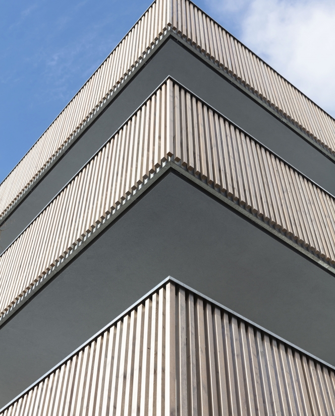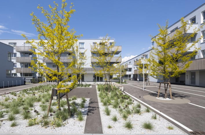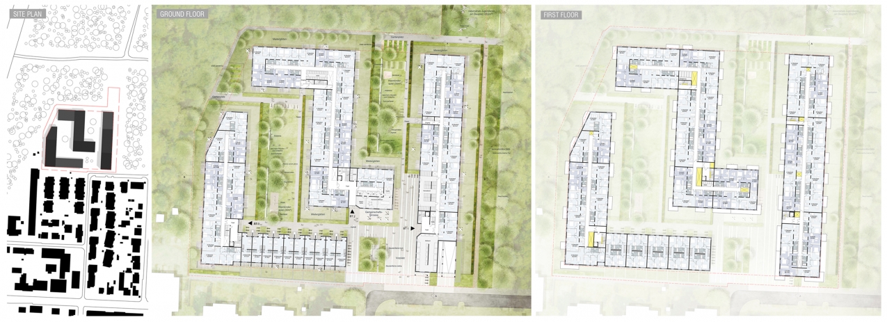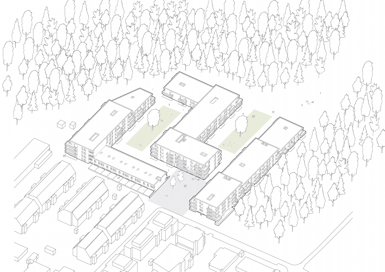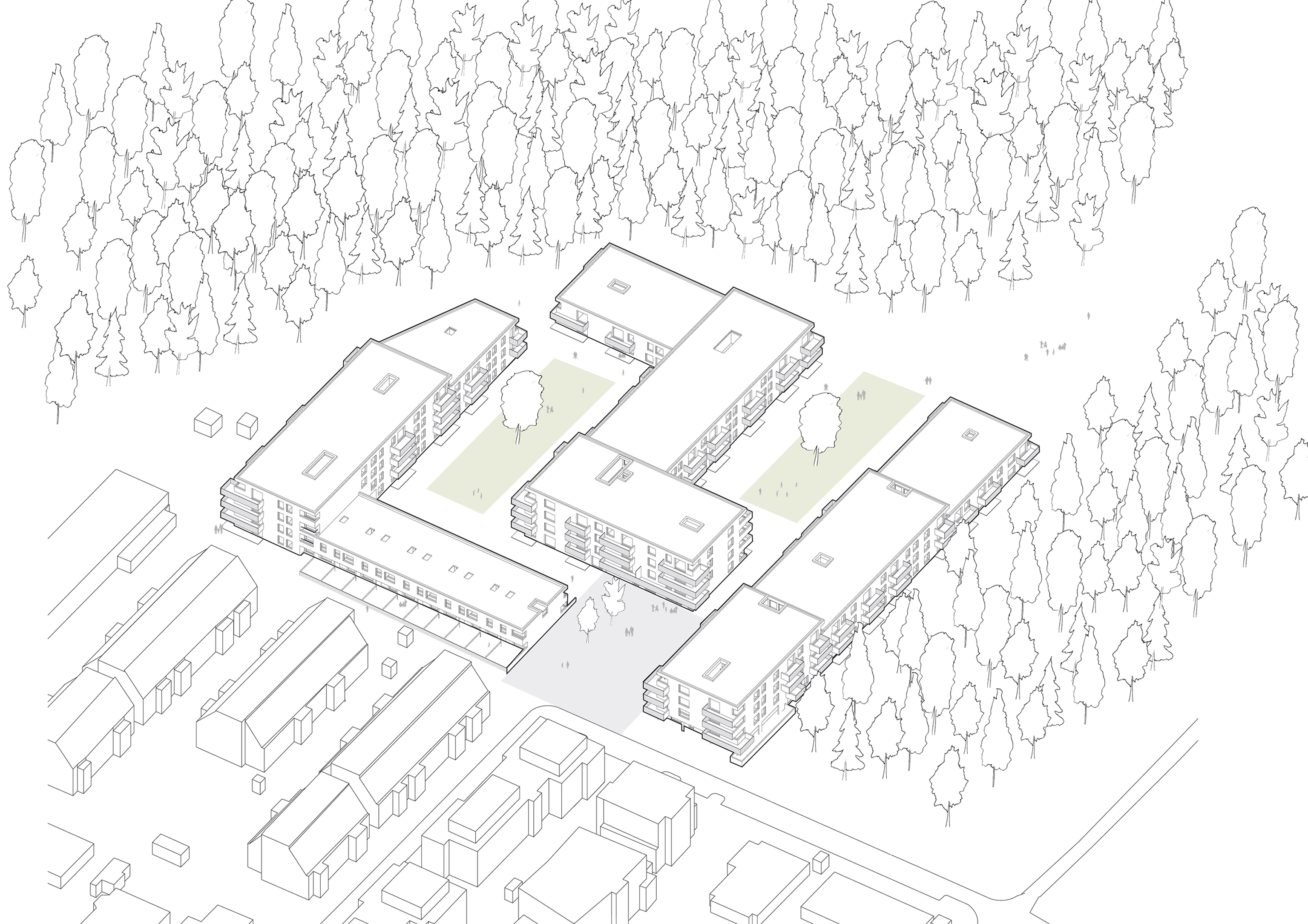 The site plan of the 151 apartment, family-friendly housing estate mediates between city and woodland, creating a contextually sensitive addition to the existing garden city, as well as an intimate connection to the adjacent woodland. Three stepped building masses generate three well-proportioned outdoor rooms. To the south, three-story high facades frame an urban forecourt. In the center, two green courts, open to the forest in the north, form the residential heart of the complex.