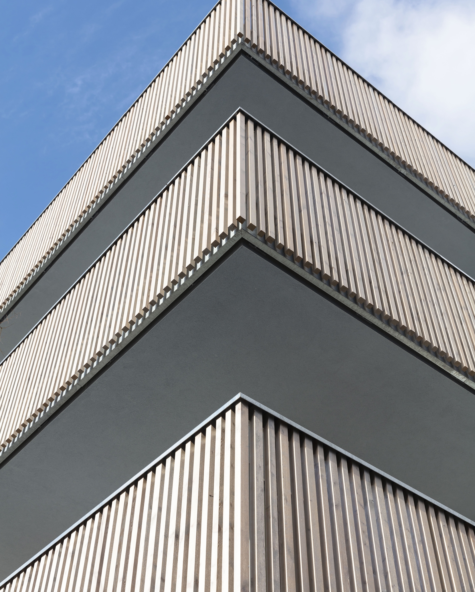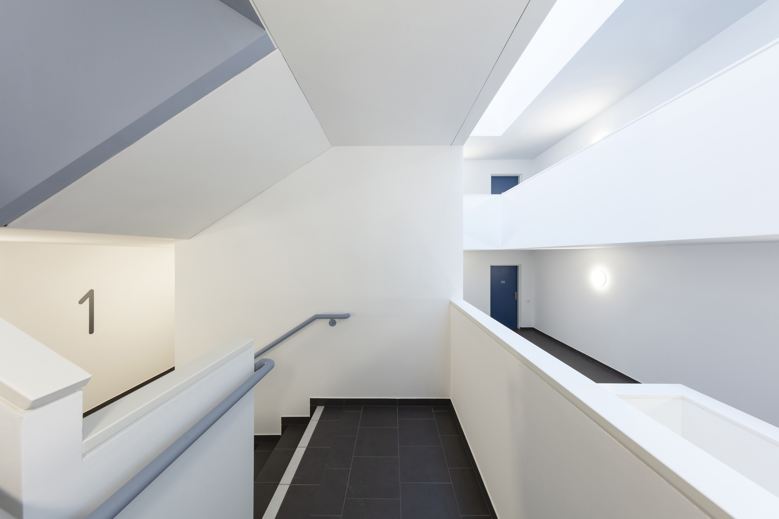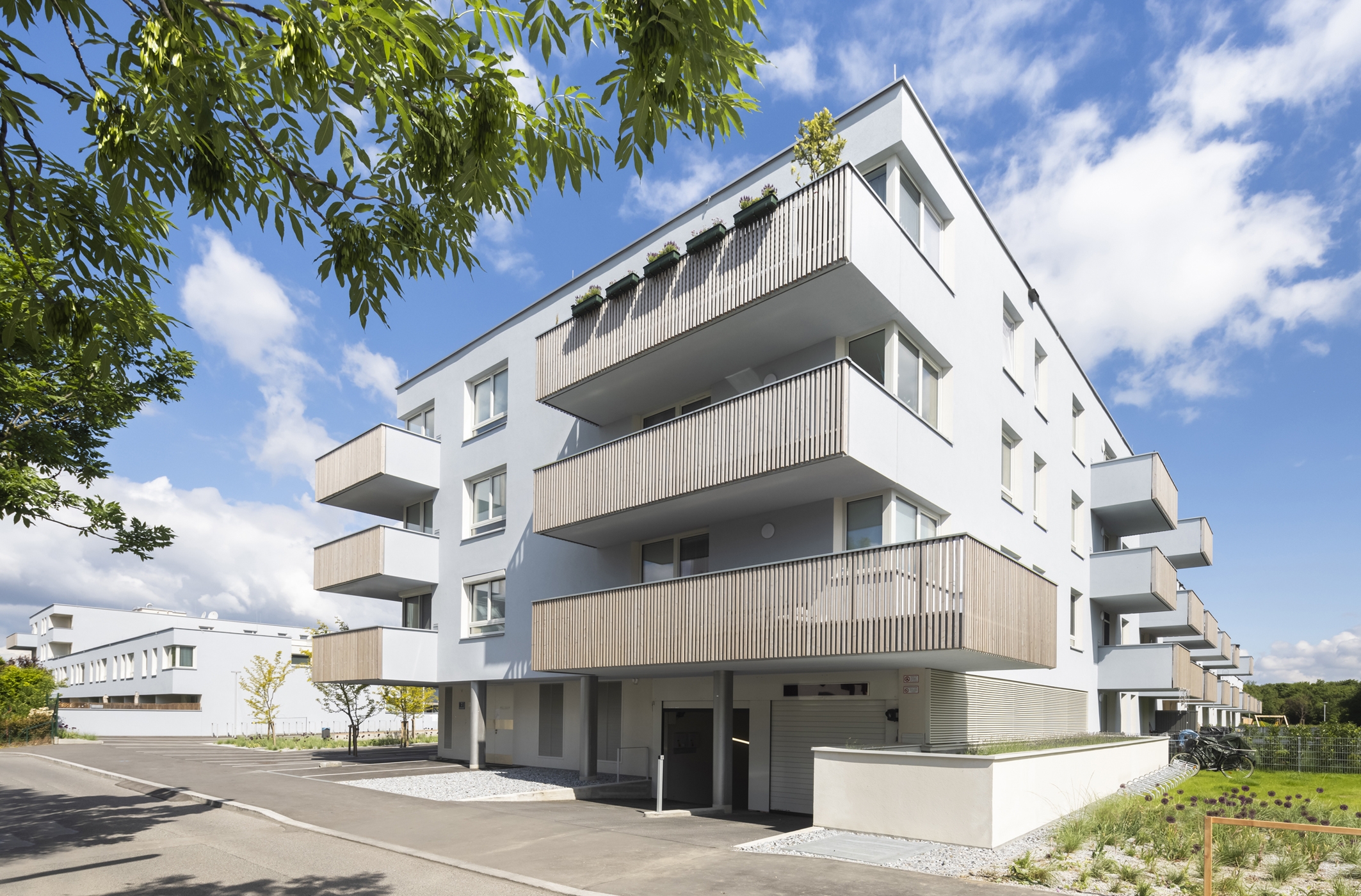 The architectural language is modest, laconic, assured. Corner windows and cantilevered balconies lend sculptural complexity to the otherwise quite strict lines. The stucco surfaces of the estate’s crisp forms are rendered in a soft blue tone; the warm white of the flared window jambs provide a harmonious tonal contrast and fine-tunes the buildings’ proportions. The subtle metallic glaze of the wooden balustrades infuses the ensemble with luminosity and enriches its ambience and atmosphere.