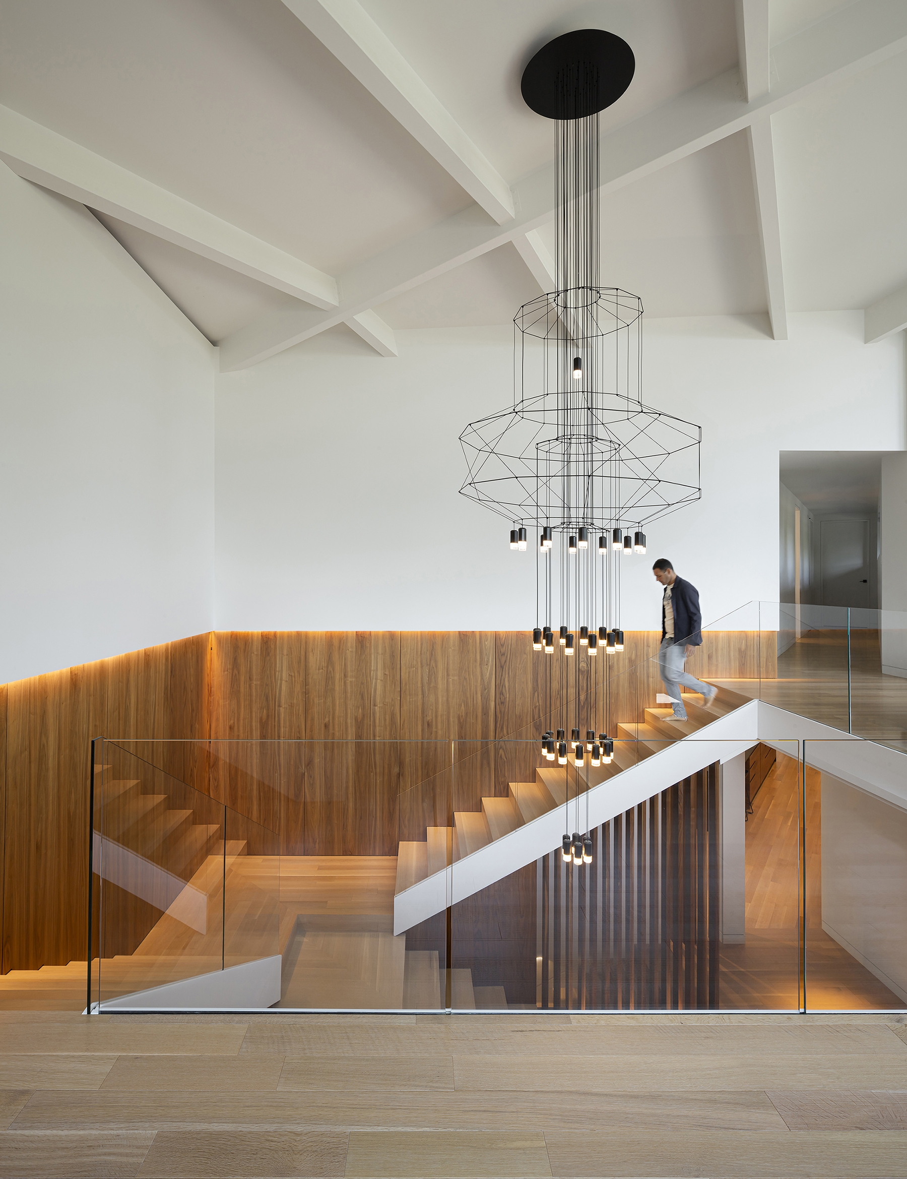 The atrium, a true centerpiece, unveils a double staircase adorned with extensive walnut paneling leading to the mezzanine and overlooks a bar area with a fireplace adjoining the living room. From the Half-level landing of the main staircase, a large solid wood door conceals the master quarters. The new rich hues of the ground floor contrast with the whiteness of the second floor and its atrium mezzanine. The kitchen and the dining room directly lead to a large refurbished courtyard with swimming pool.