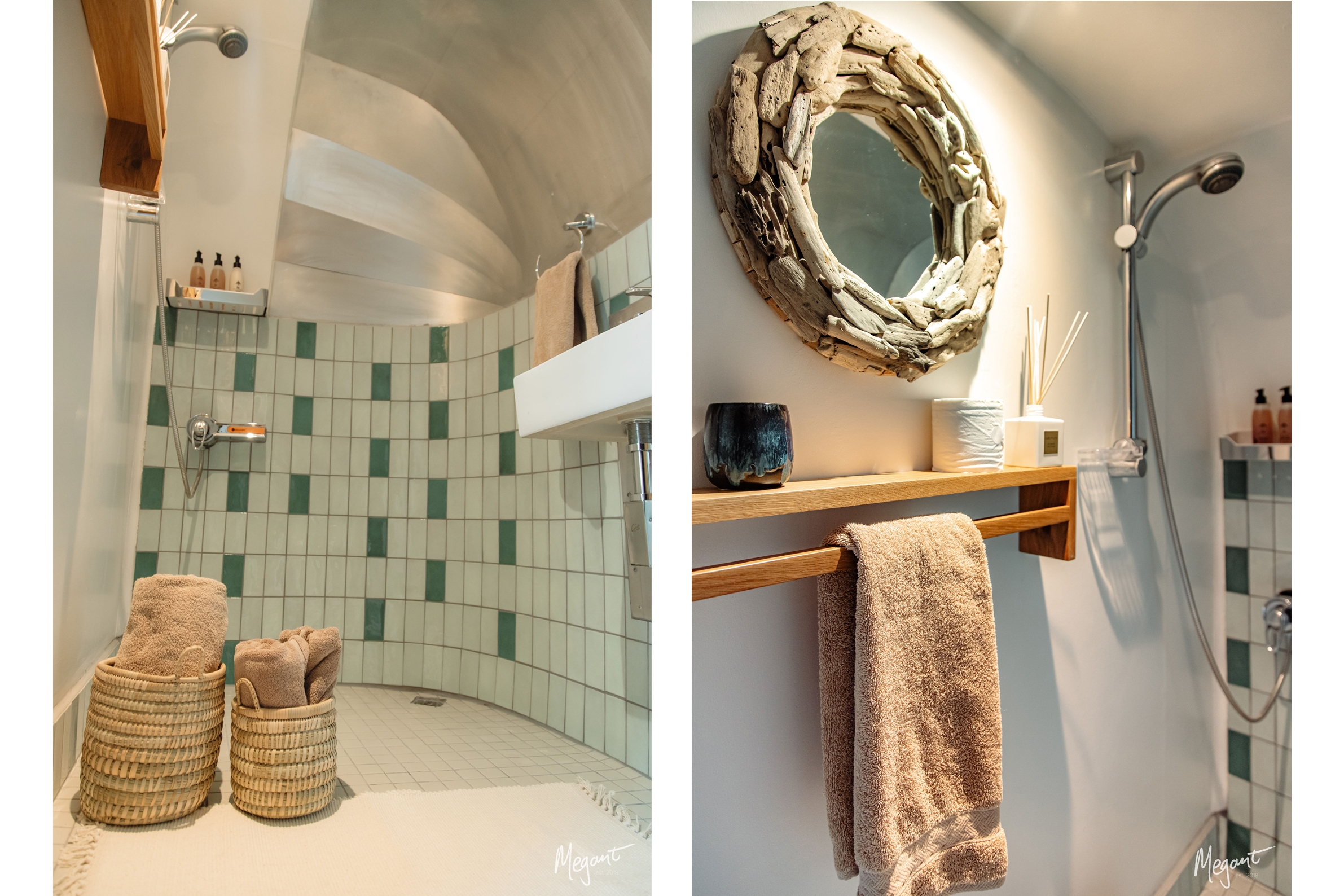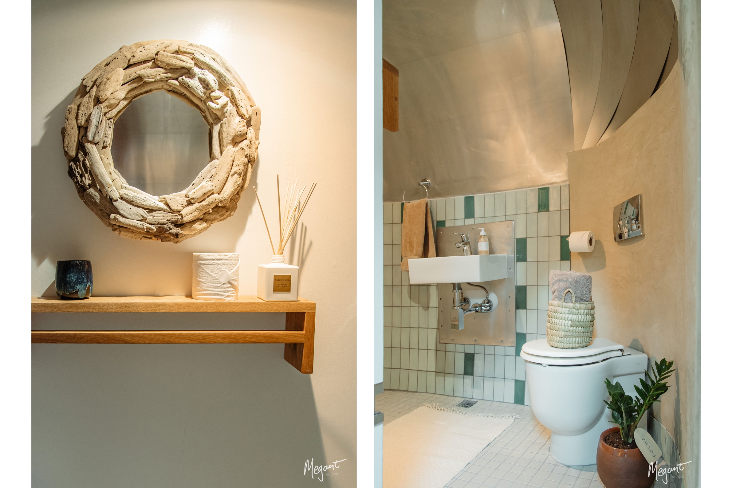 Custom designed wallpaper evokes the sense of walking in a vineyard. The grape leaf motive on the wallpaper is repeated in the framed pressed vine leaf artwork and printed leaves on scatter cushions. A more abstract reference to grapes and leaves can be found in the green tones of the feature wall, wall tiles and blinds.