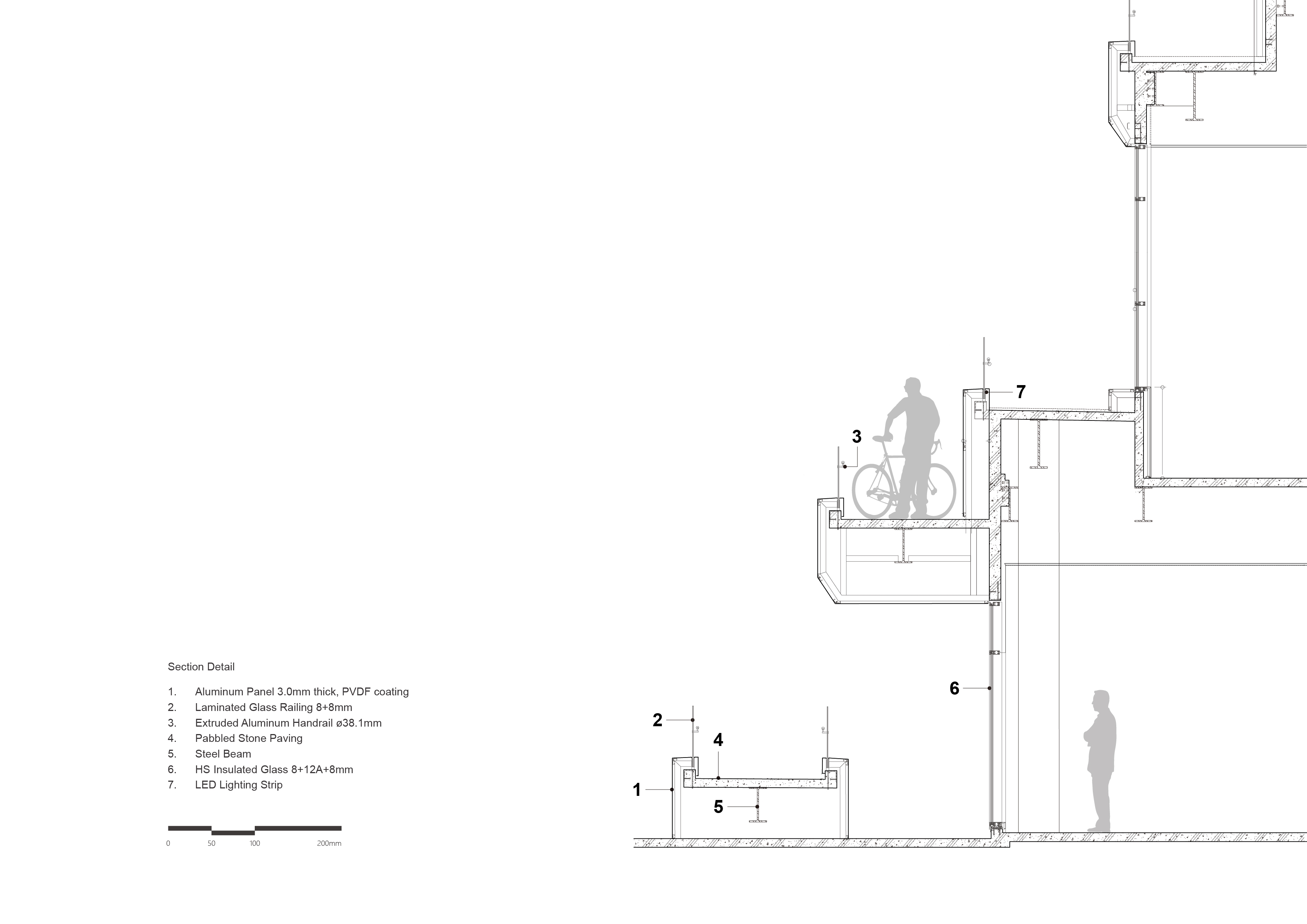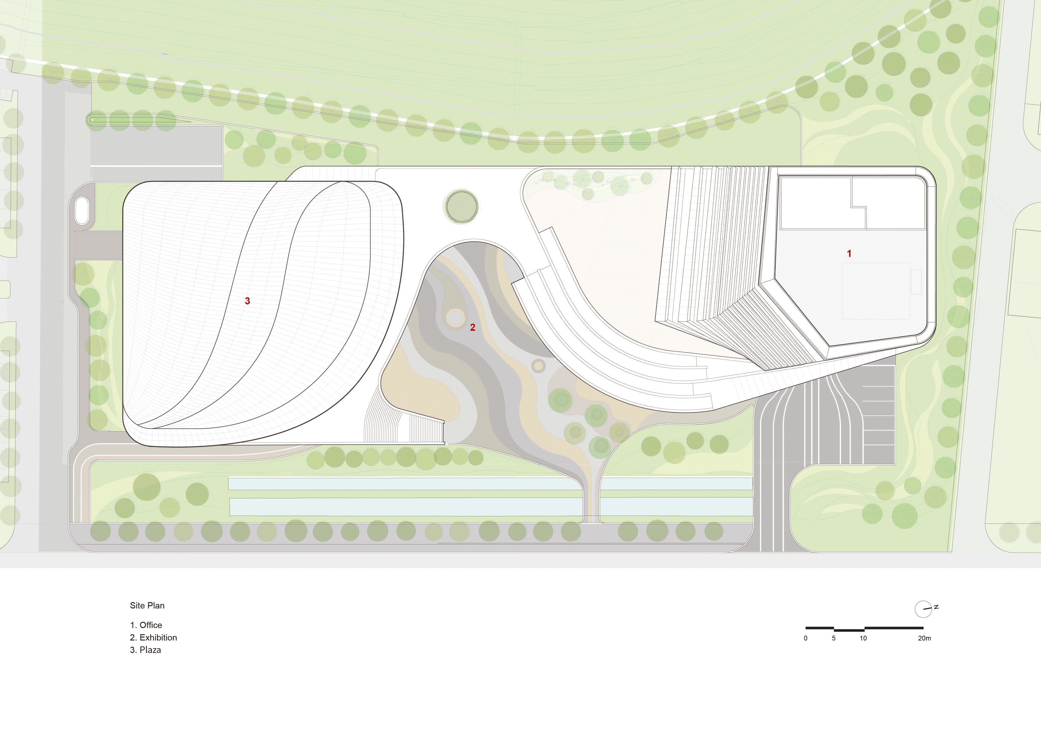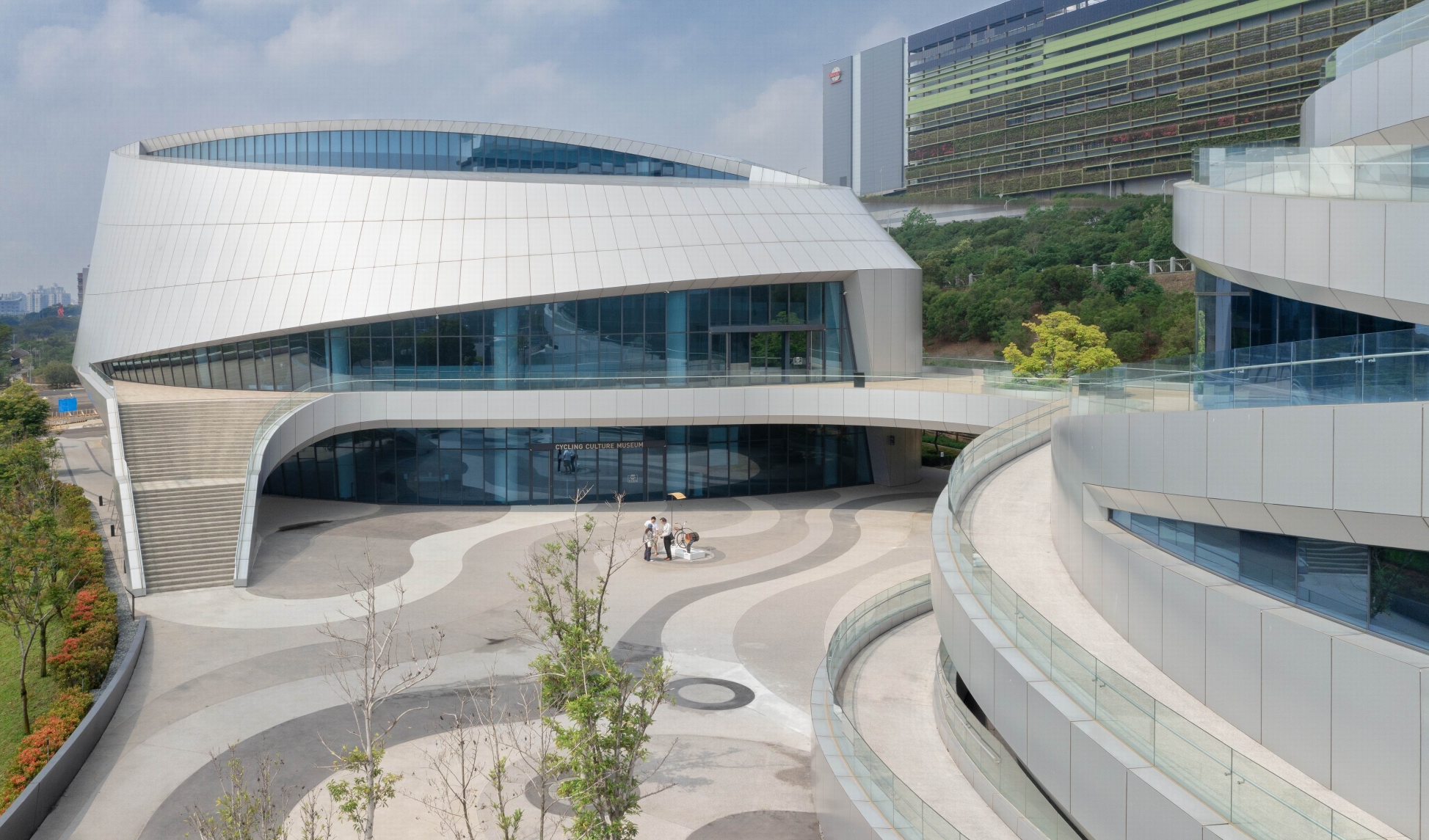 Landscape elements include flowing pebble paving patterns and a set of curved exterior stairs around an outdoor plaza that is reached from the sidewalk via a pedestrian/cyclist bridge formed by z-shaped bent steel plates.