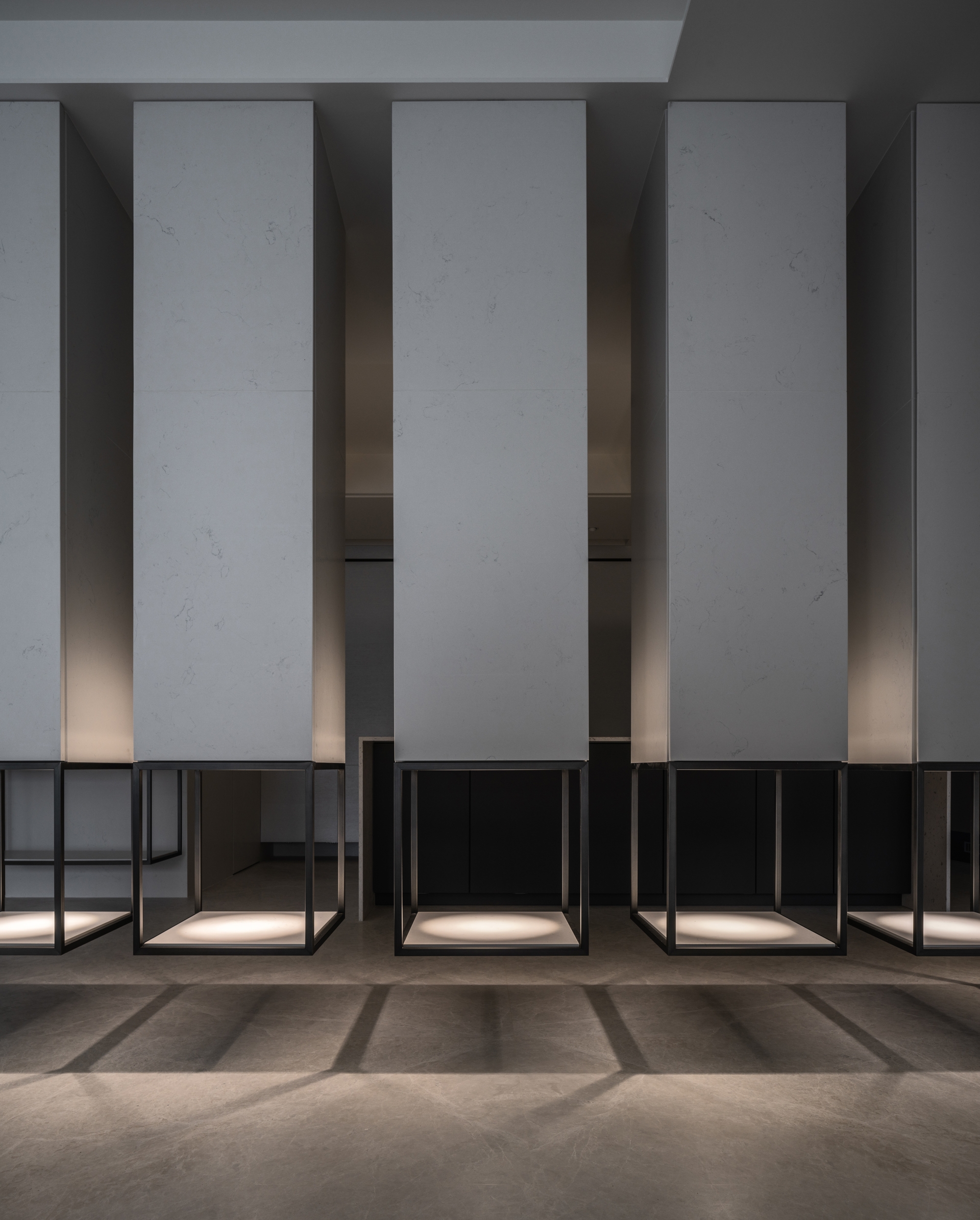 The gaps of the array colonnades do not hinder the penetration of light, and the light from the sunlight reflected by the floor extends on the ground without obstruction, forming a gradual light fade. Without blocky shadows and its separation, the floor has a wider sense of depth and width.
