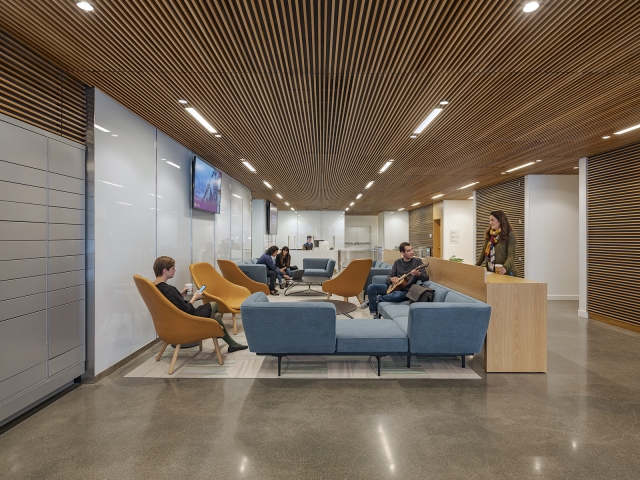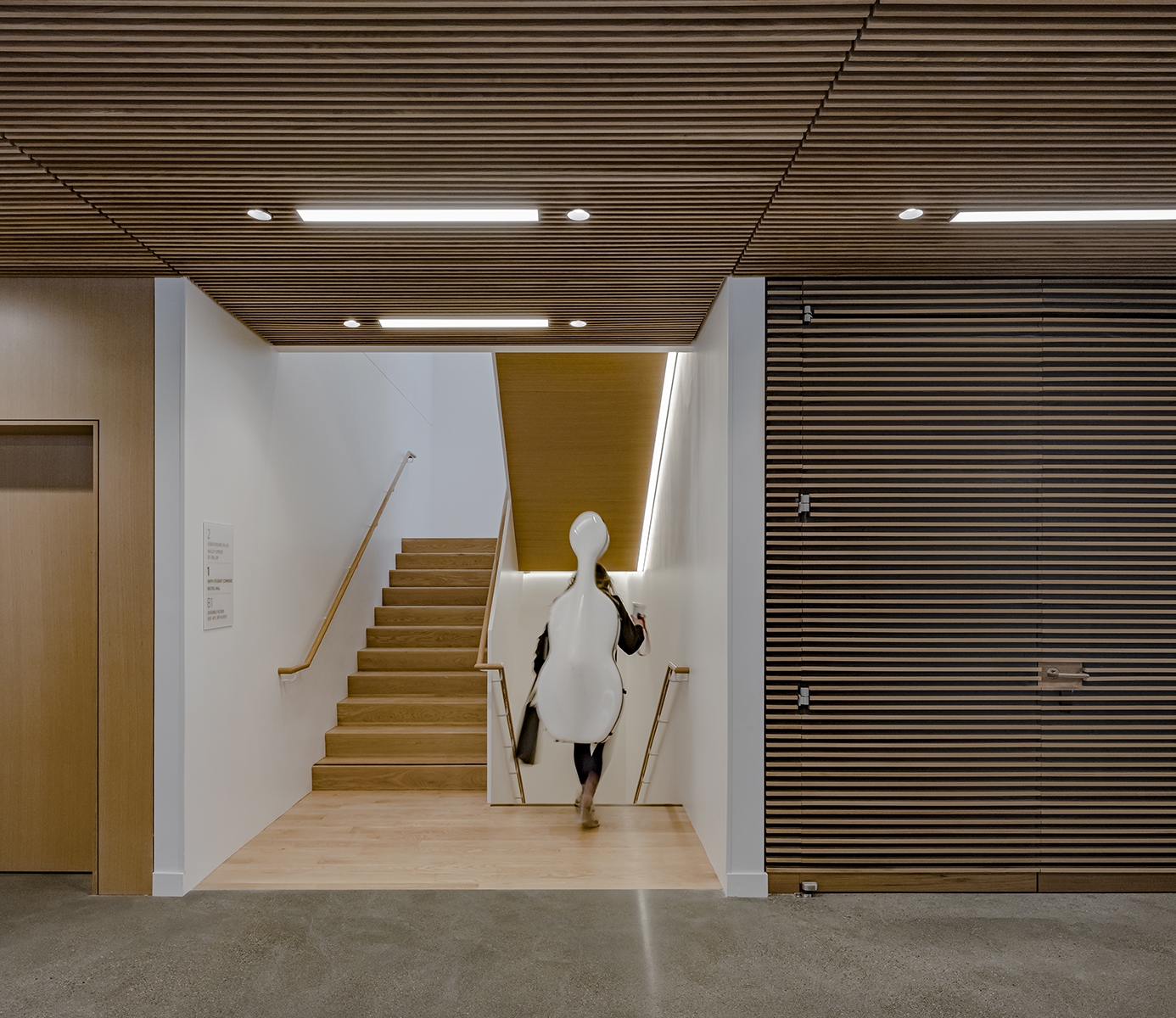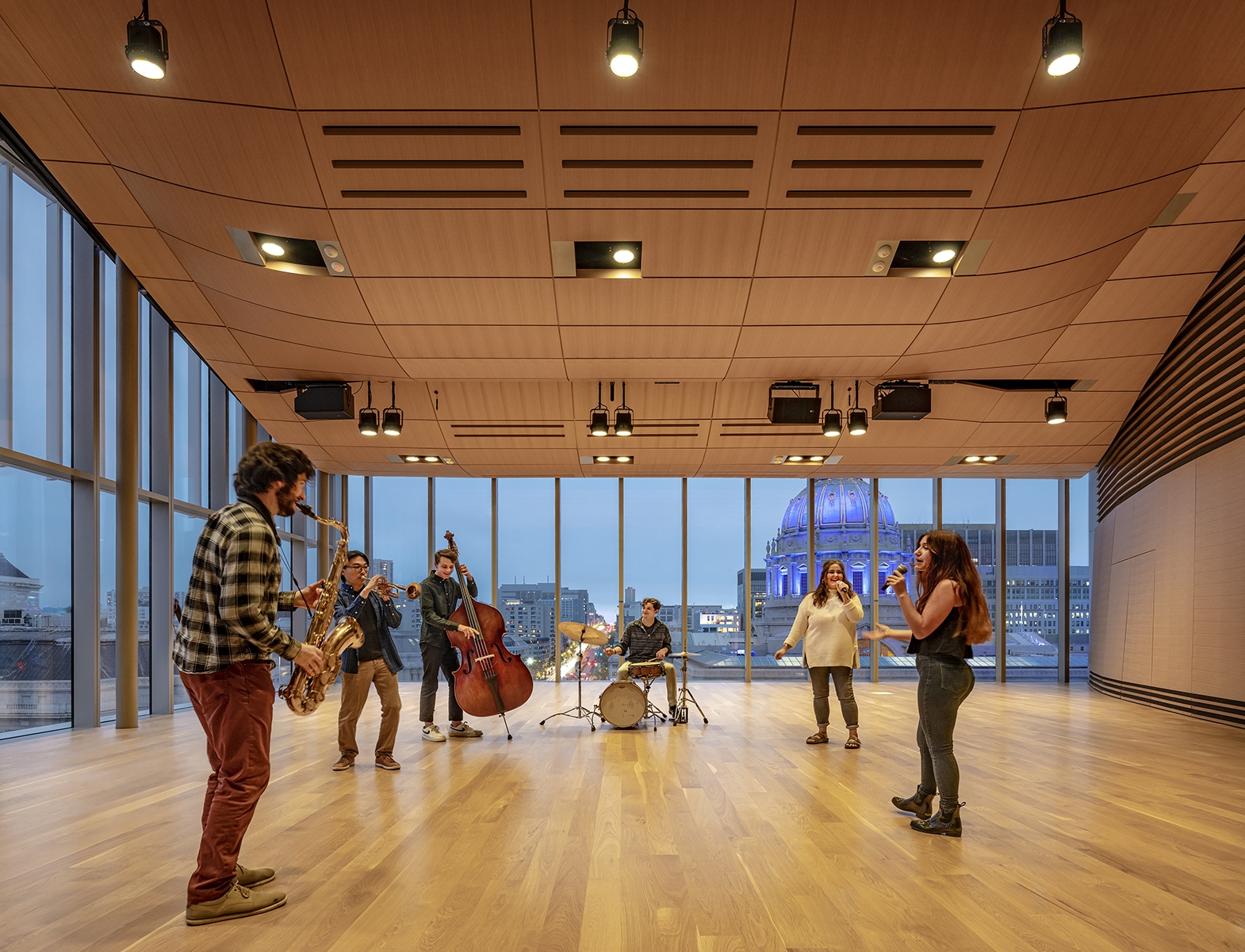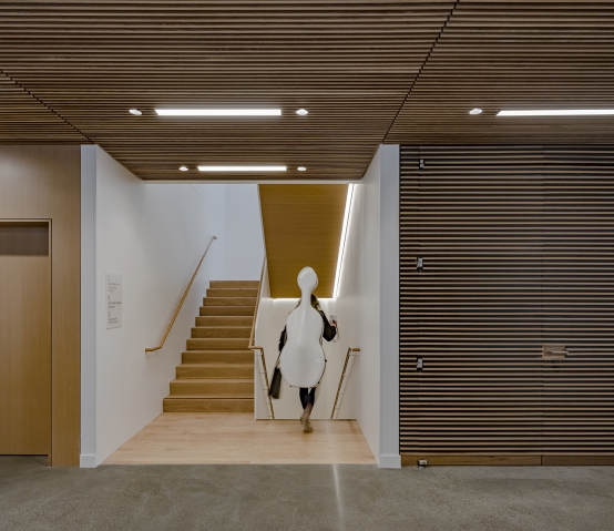 The base of the new building is lined with highly transparent low-iron glass to reveal the creative activities occurring within and draw the public in to hundreds of free performances each year. The central lobby is a porous, community-oriented entrance, anchored by three major programmatic spaces – a café, student lounge, and a glass-enclosed recital hall – all visually accessible to passersby. On the top floor, a double-height performance space connects visually to the city.