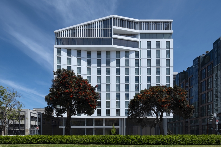 The San Francisco Conservatory of Music’s Bowes Center is a dynamic social and cultural destination that melds musical education, performance, and public experience. The new building is designed as a “vertical campus” that incorporates housing, dining, classrooms, rehearsal rooms, performances spaces, faculty offices, and a radio station under one roof. This rich program uses the latest in acoustical innovation and is consciously stacked in opposition to urban sprawl in a growing city.