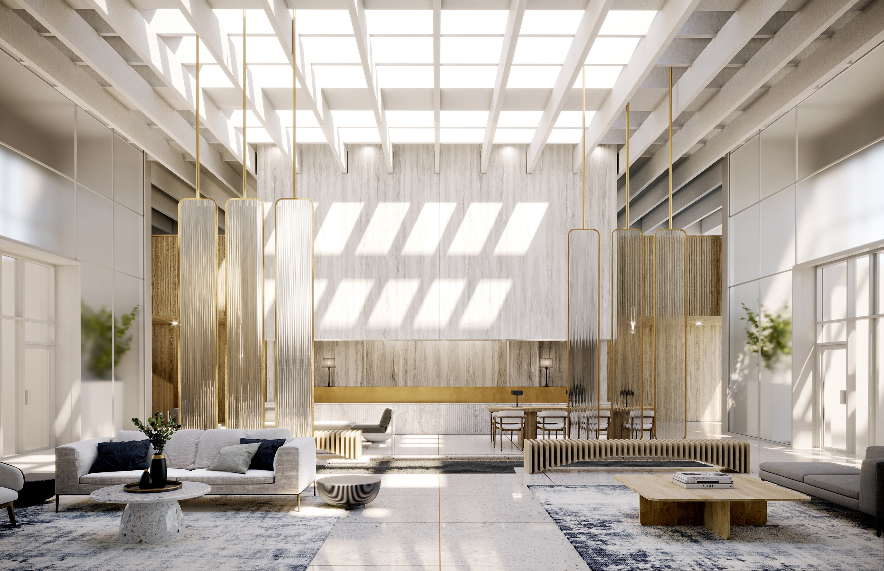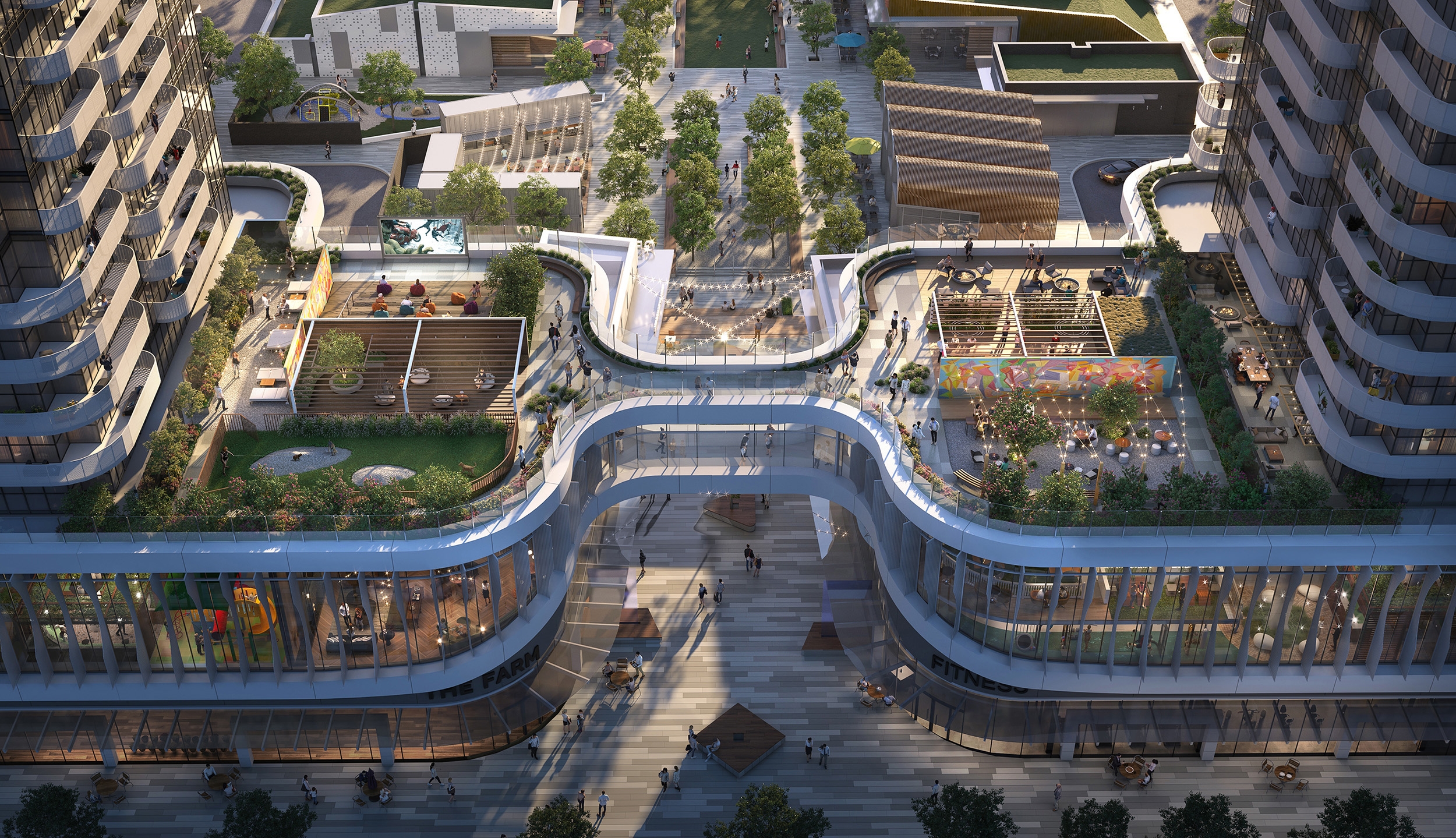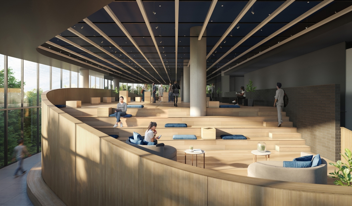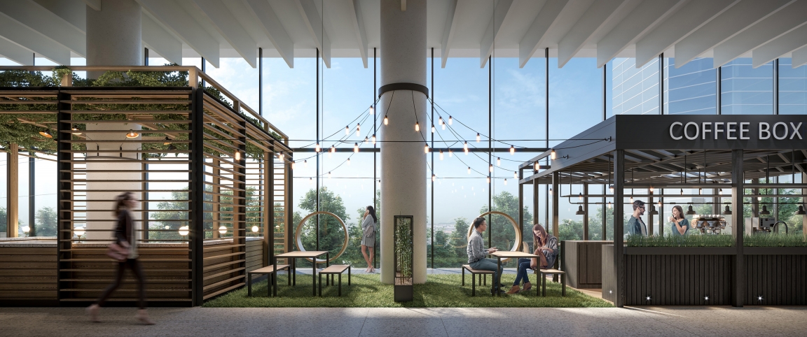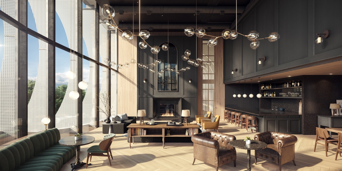These condos 20,000 sf of amenities were designed to establish a four-seasons lifestyle and blur the lines between interior/exterior. The amenities are not cordoned off into a separate part of the complex, rather, from the moment you step into the lobby of the future four-tower site you become part of the lifestyle experience. Most of the spaces remain open and visible, unique pods designed to feel welcoming rather than isolating. Walking through will feel like strolling along a retail strip, watching the people ebb and flow, no matter what time of year it is. The focus of the public spaces is a linear indoor park. It’s lined with a coffee shop, playground, and a grand pavilion designed with gentle curves and cascading wood seating. There are gathering spaces and greenery which help bring the feeling of outside in. Other amenities include music/arts studios, theatre, dog area and pool. Most remain accessible for view, adding to the sense of energy. The design choices used throughout have a shared sense of materiality connecting each space; they are just at home outside as in, including wood, metal and stone. The furniture and lighting, meanwhile, differentiate and define each pod.