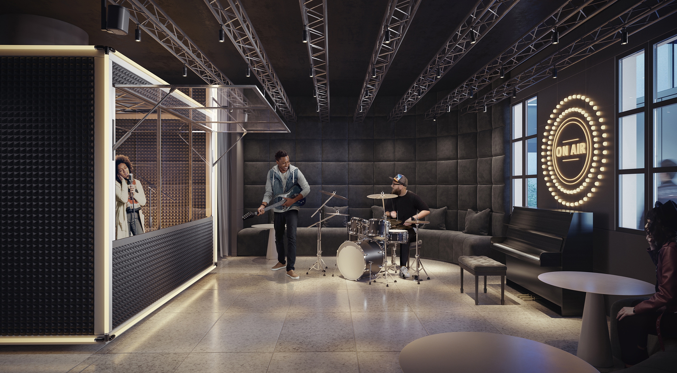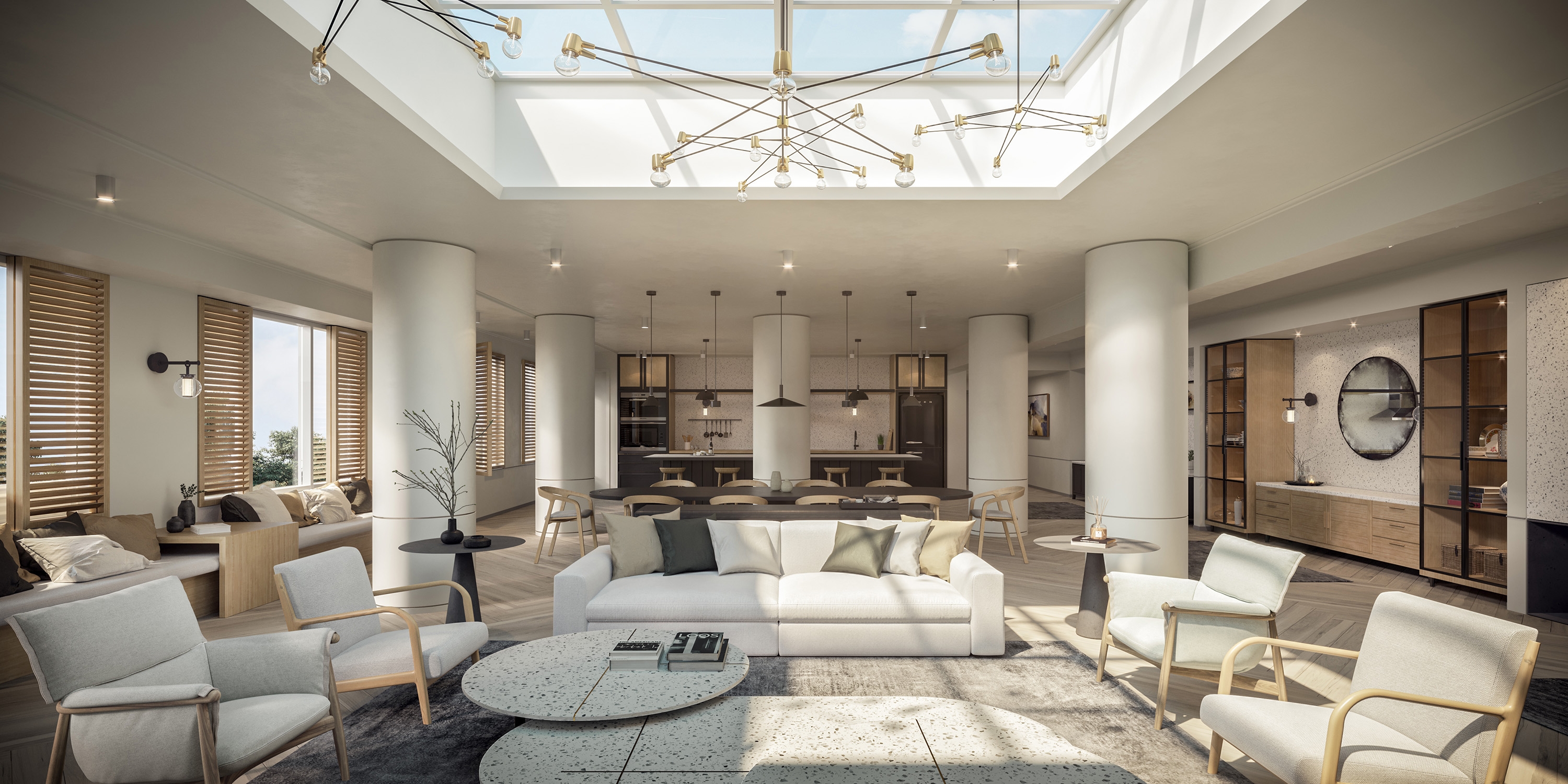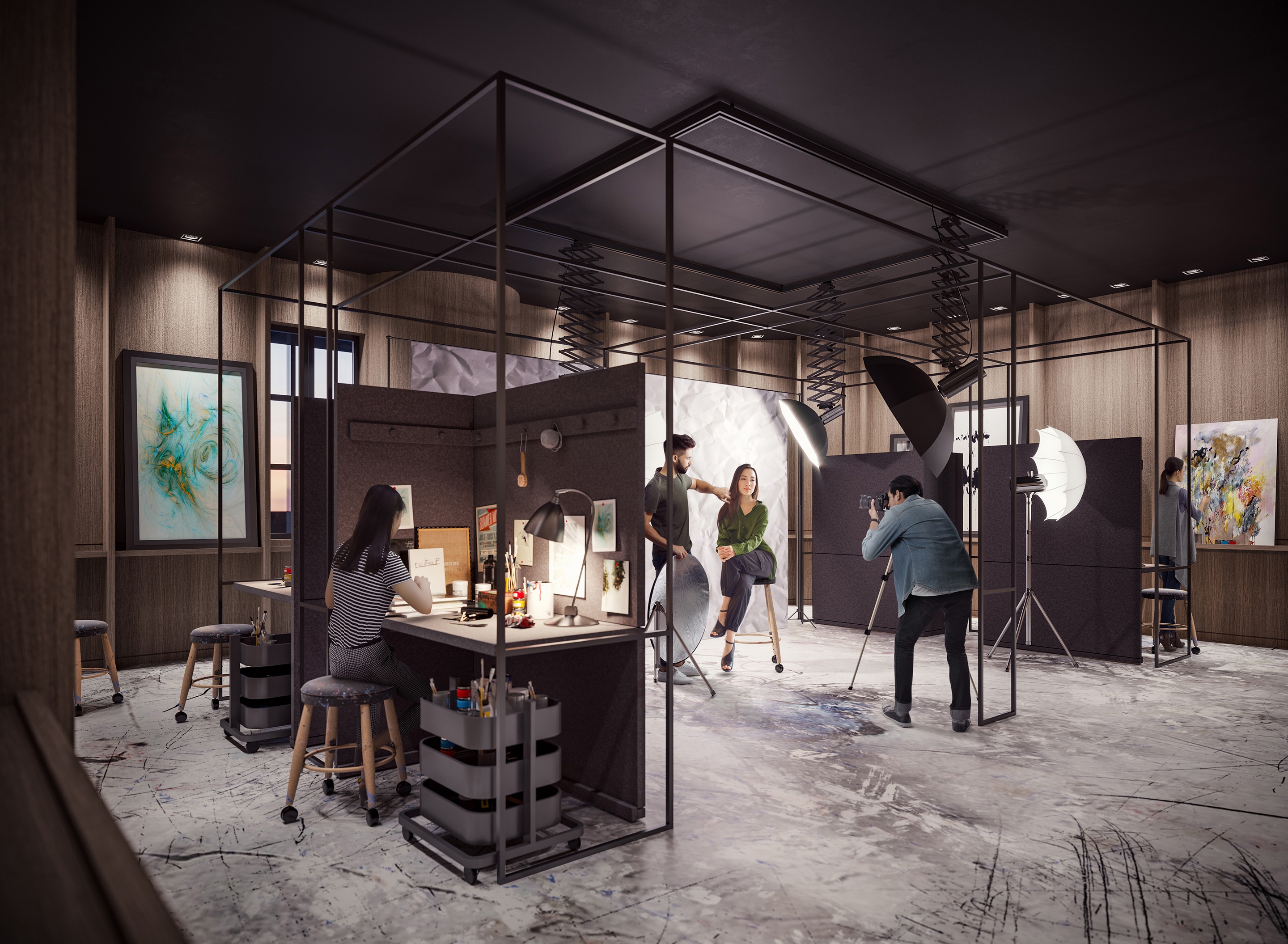 These condos 20,000 sf of amenities were designed to establish a four-seasons lifestyle and blur the lines between interior/exterior. The amenities are not cordoned off into a separate part of the complex, rather, from the moment you step into the lobby of the future four-tower site you become part of the lifestyle experience. Most of the spaces remain open and visible, unique pods designed to feel welcoming rather than isolating. Walking through will feel like strolling along a retail strip, watching the people ebb and flow, no matter what time of year it is. The focus of the public spaces is a linear indoor park. It’s lined with a coffee shop, playground, and a grand pavilion designed with gentle curves and cascading wood seating. There are gathering spaces and greenery which help bring the feeling of outside in. Other amenities include music/arts studios, theatre, dog area and pool. Most remain accessible for view, adding to the sense of energy. The design choices used throughout have a shared sense of materiality connecting each space; they are just at home outside as in, including wood, metal and stone. The furniture and lighting, meanwhile, differentiate and define each pod.