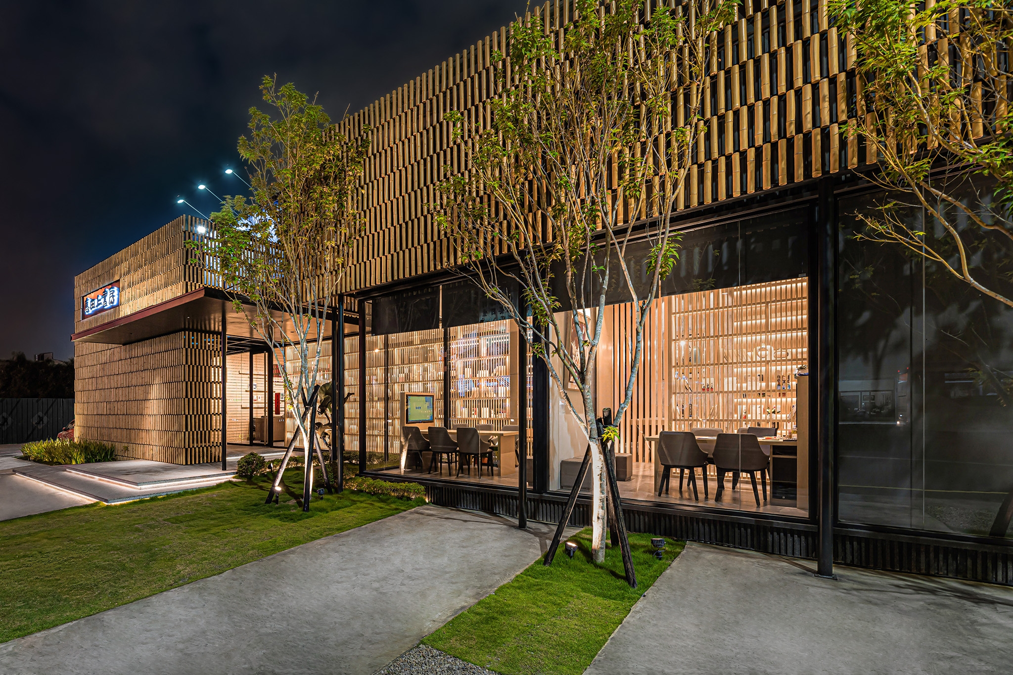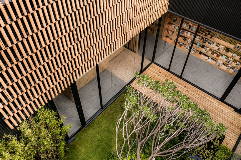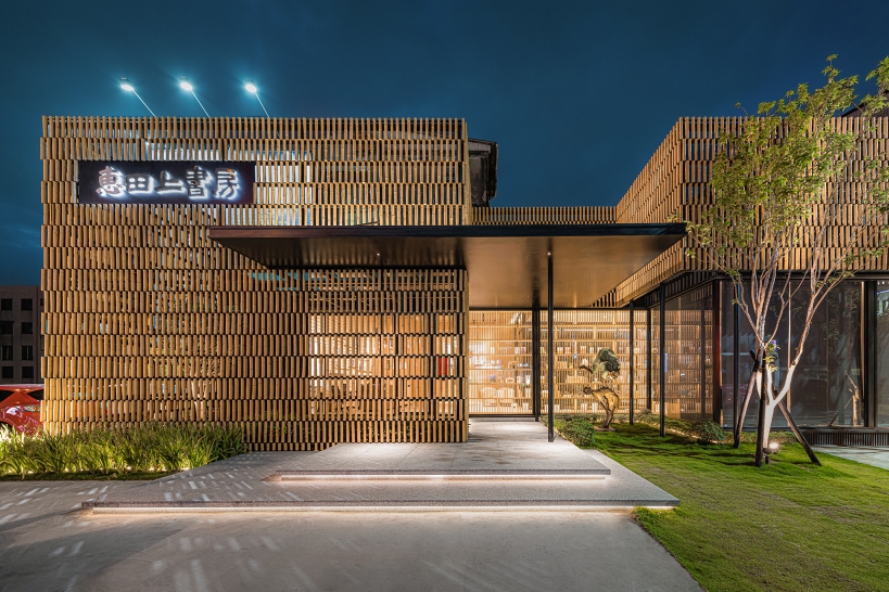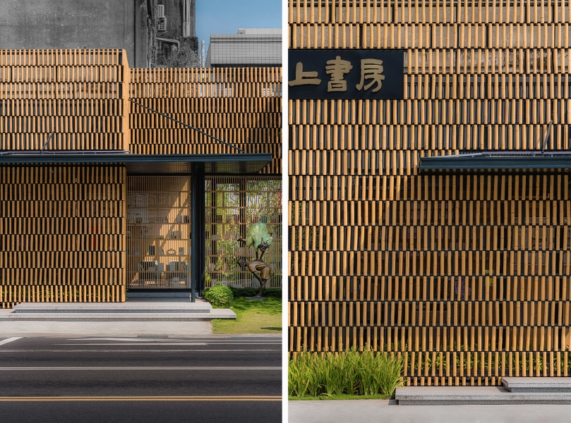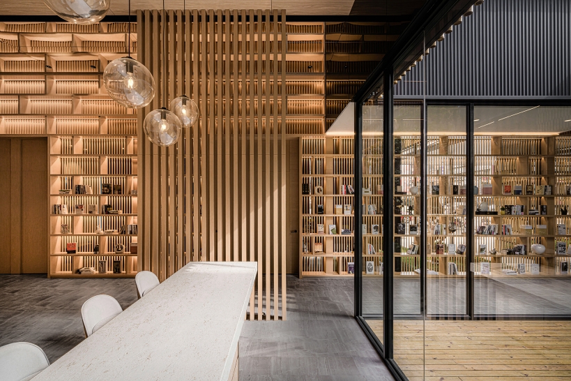 It not only blocks the noise from the street, but you can still vaguely feel the flow and movement of the street scene. The meeting area is the only space seen from the street. With the lattice bookshelf as the background and the people in the meeting room conversing, it is as they are the main characters of a show.