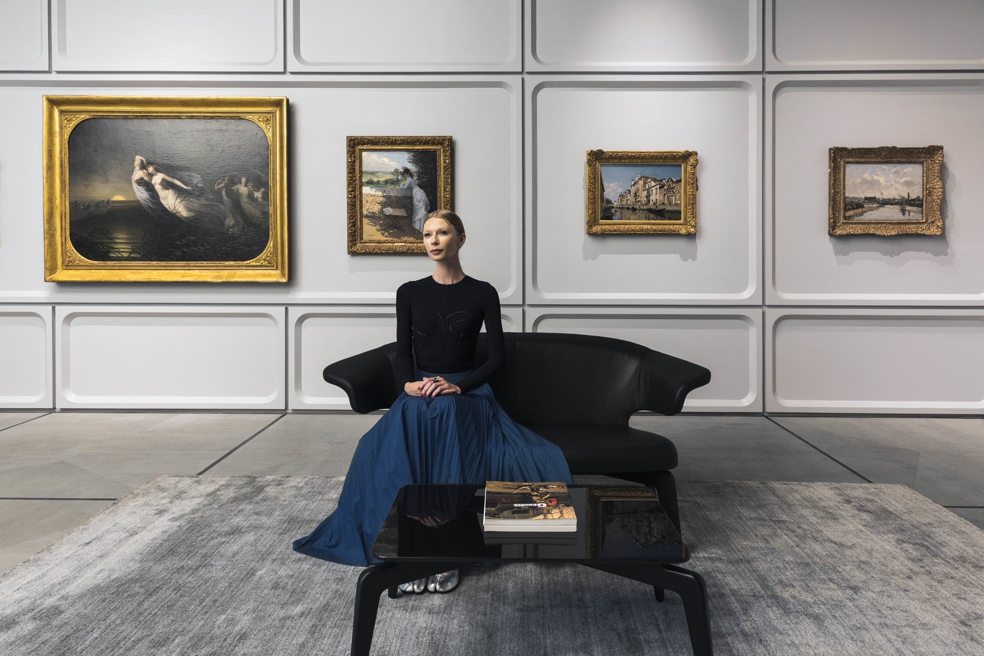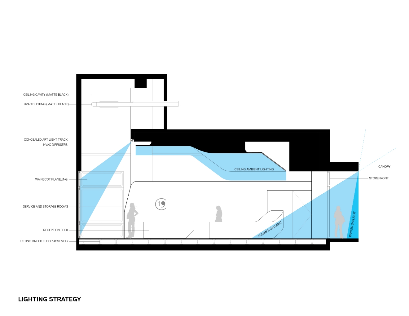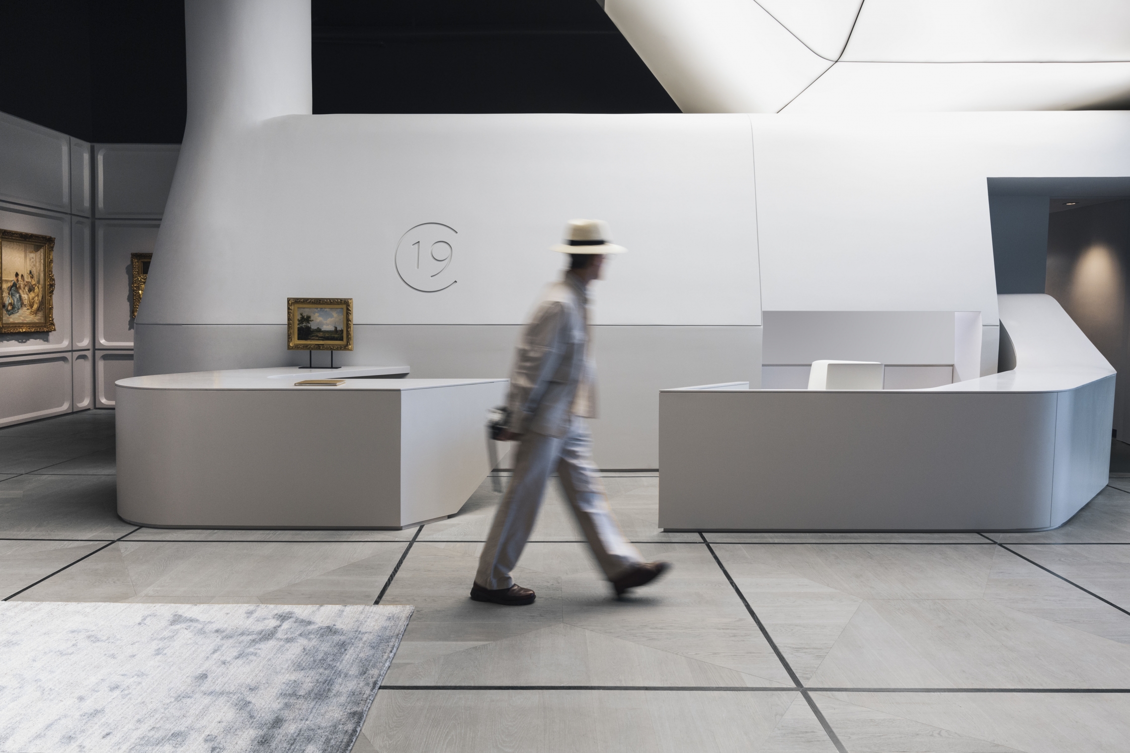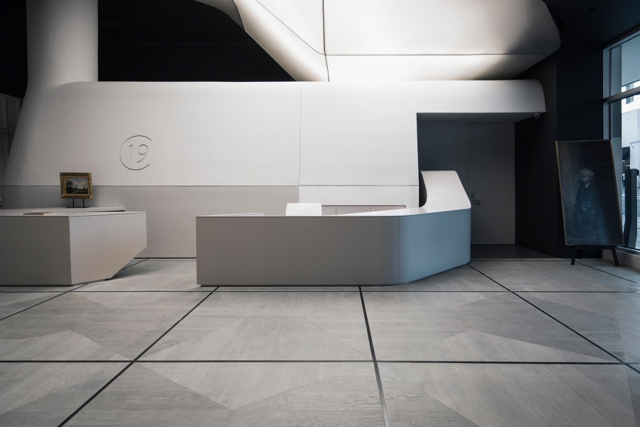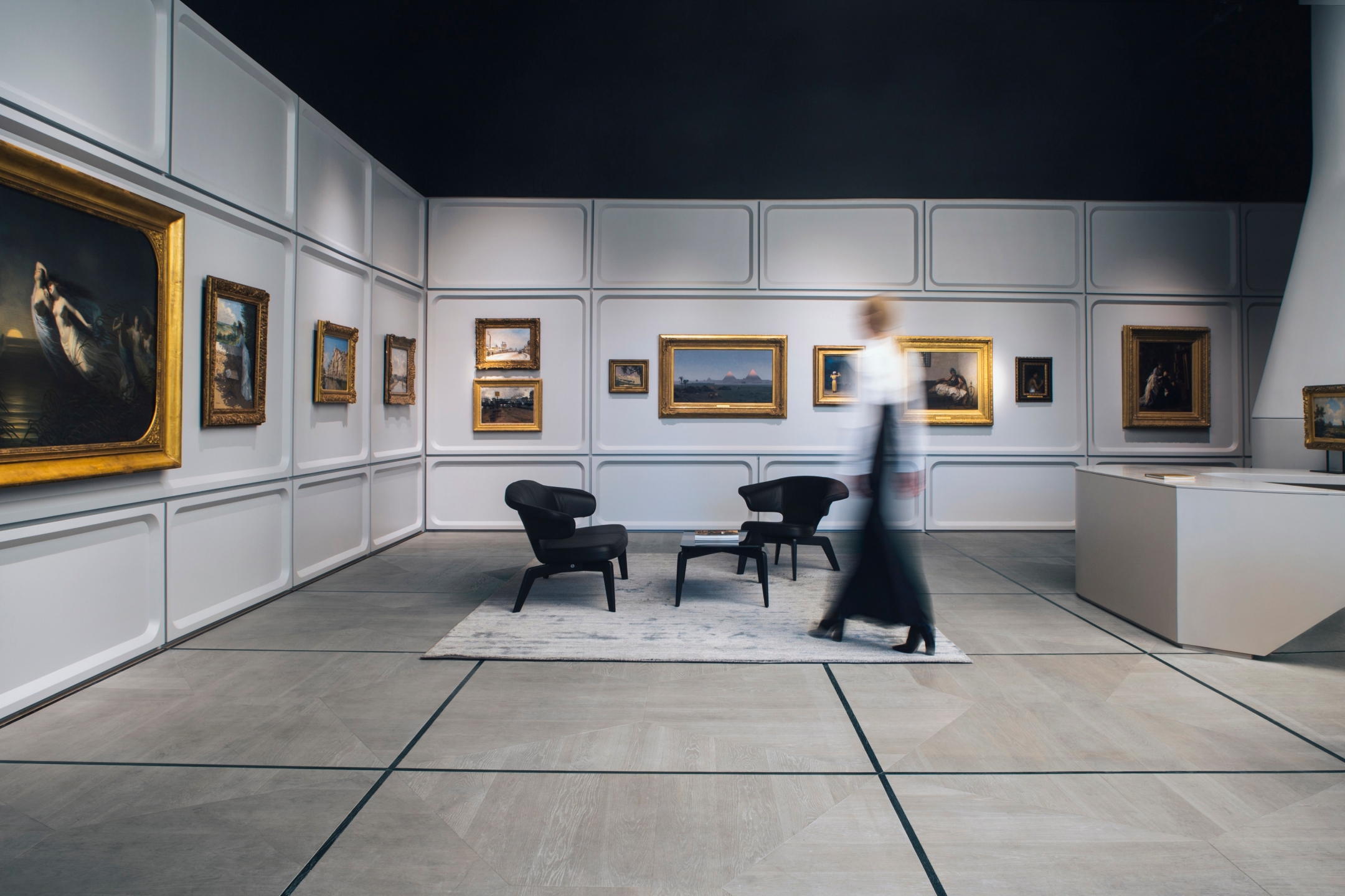 The wall paneling of the gallery is created as a vogue concept to classical wainscoting. These panels present opportunities for displaying art as precious and unique artifact. The size and stacking of these panels allow for the arrangement of artwork in multiple configurations, including stacked “Salon Style”, the prevalent style of art display until the late 19th Century.