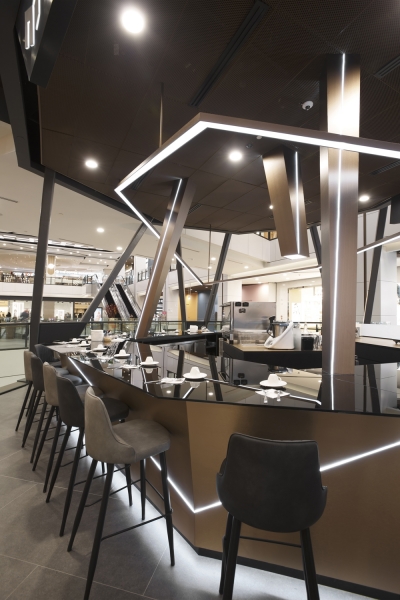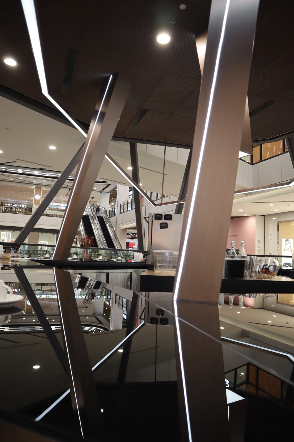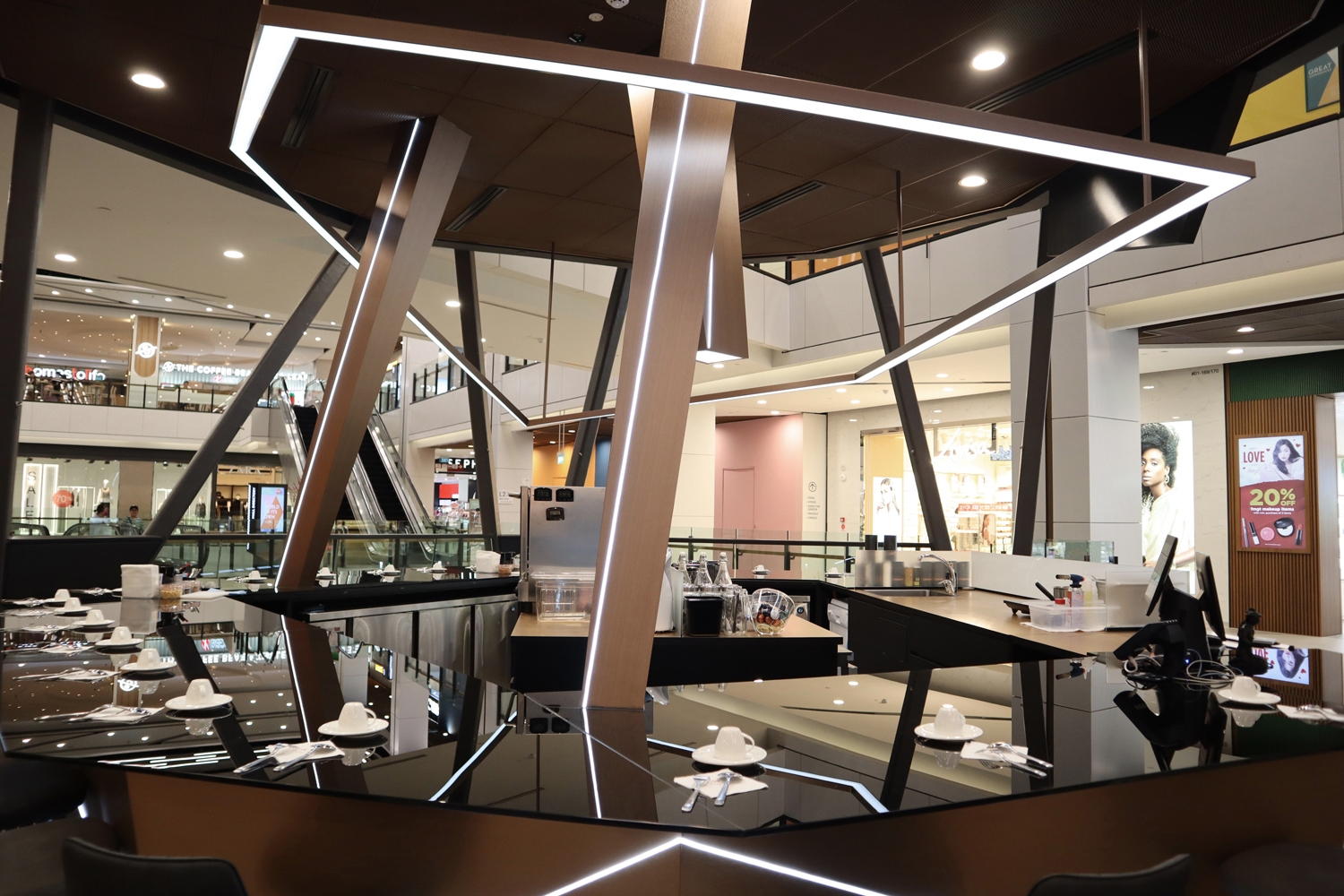 The enigmatic of the moon has always baffled us in awe. Imagine living in the cosmic space without weight and force, the typology of anti-gravity and imbalance naturally surfaced. Devised as a space age architecture formed by fragmented objects from the cosmic world. Two shards punctuated into the duplex resulting in a continuous connection between the two floors and onto a base which is core foothold of the design, therefore it formulated the main dining space on the lower level. Other random pieces behaved like floating objects around the dining space and upper floor which is designated as an extension of the core base. Black glass is used for the bar countertop to create a deep but muted reflection of the structures and its lighting effects. The reflection adds on to the and bizarre visual connections to the surroundings.