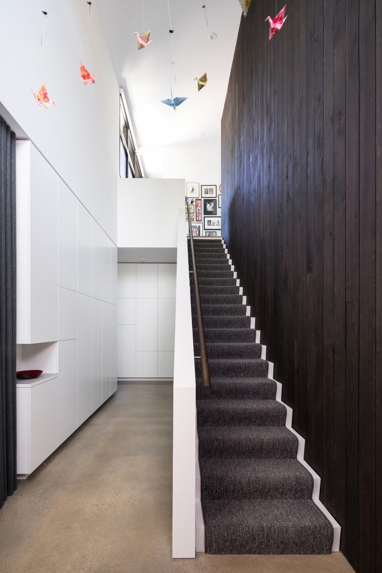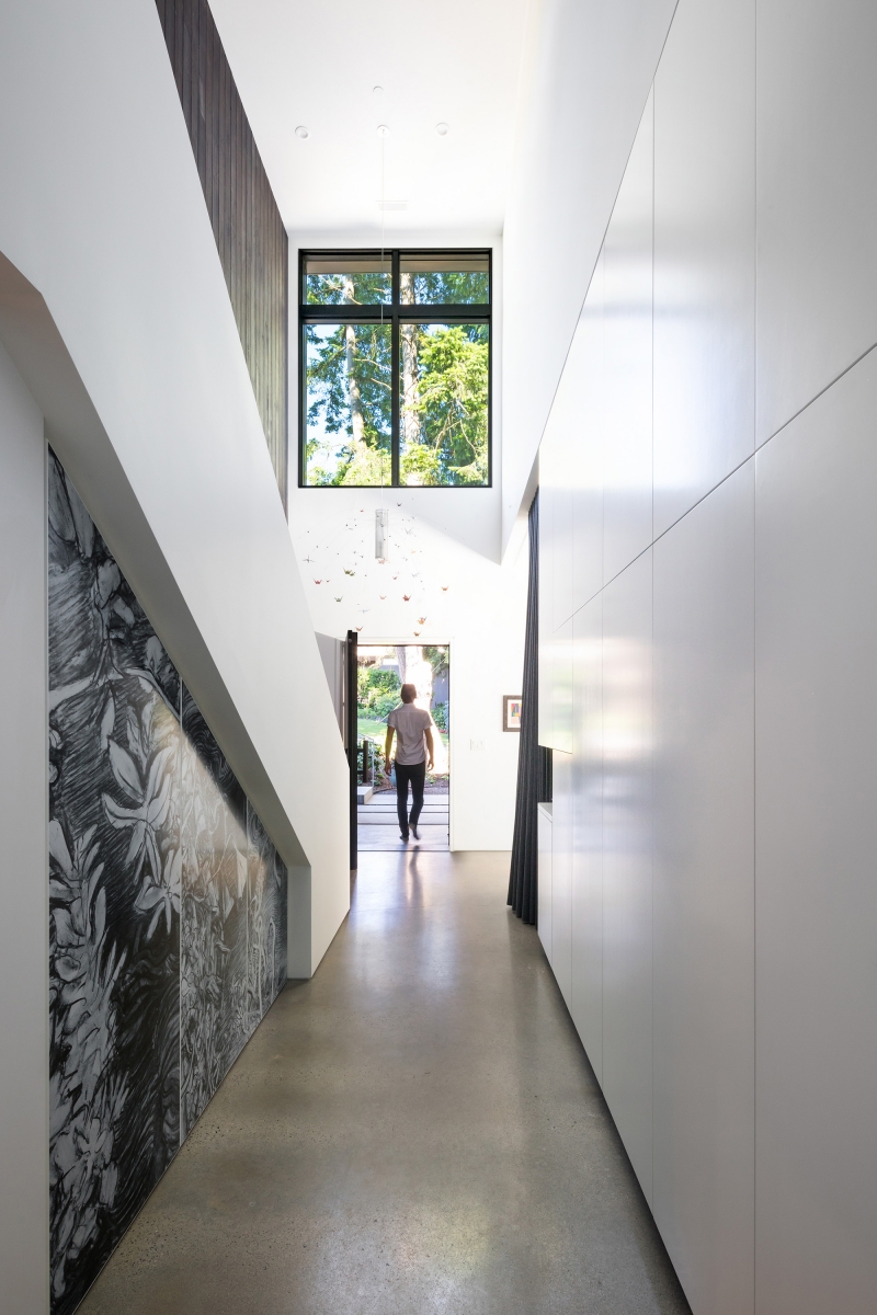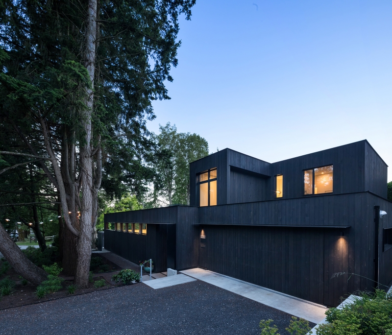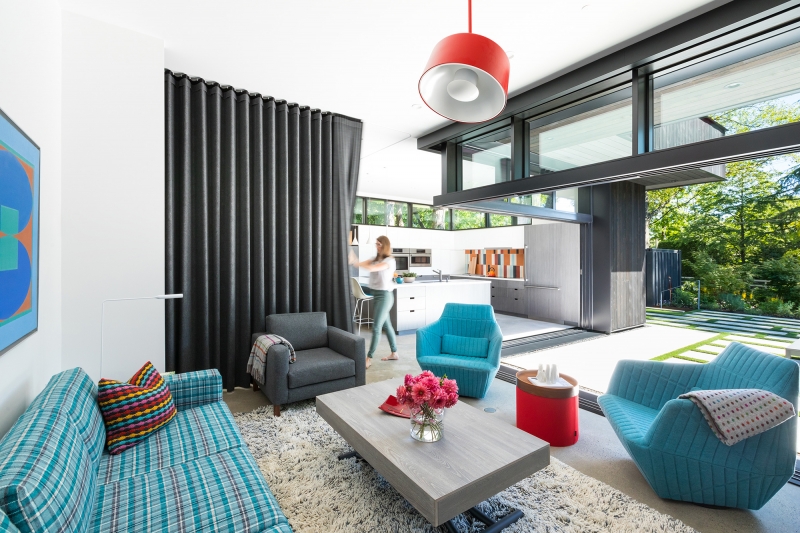 Seamlessly integrated into its semi-rural surroundings and tucked under a canopy of fir trees, the minimalist composition of Combo House—wood, glass, concrete and steel—opens to reveal a vibrant energy. The owners were downsizing and asked for a home designed to feel larger than its actual square footage while still intimate. The result is a deceptively simple space that uses volume, structure, light and colour to create both efficiency and warmth. Eleven-foot ceilings are fundamental to this approach, as is the open main-floor plan, which allows for a continuous inside-outside flow thanks to fully retractable sliders. The calm, synthesized palette of white walls and countertops, black ash cabinetry and sanded concrete floors allowed for the freedom to play with pattern and colour, best expressed by the handmade concrete tiles found throughout the building. Other highlights include ample storage space in floor-to-ceiling cabinetry along hallway walls and clerestory windows that frame the fir trees and welcome a dappled morning light. Four-foot overhangs over south-facing, full-height glass sections keep the interior in shade, while foot-thick walls help to control temperature.