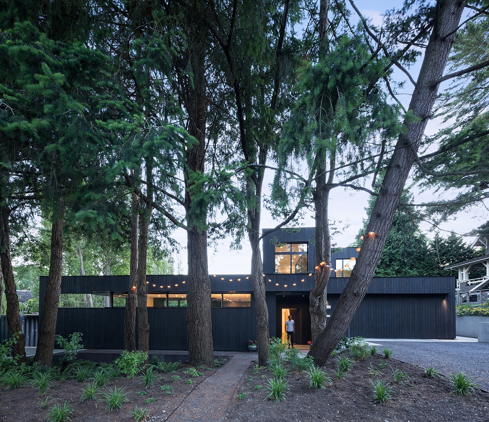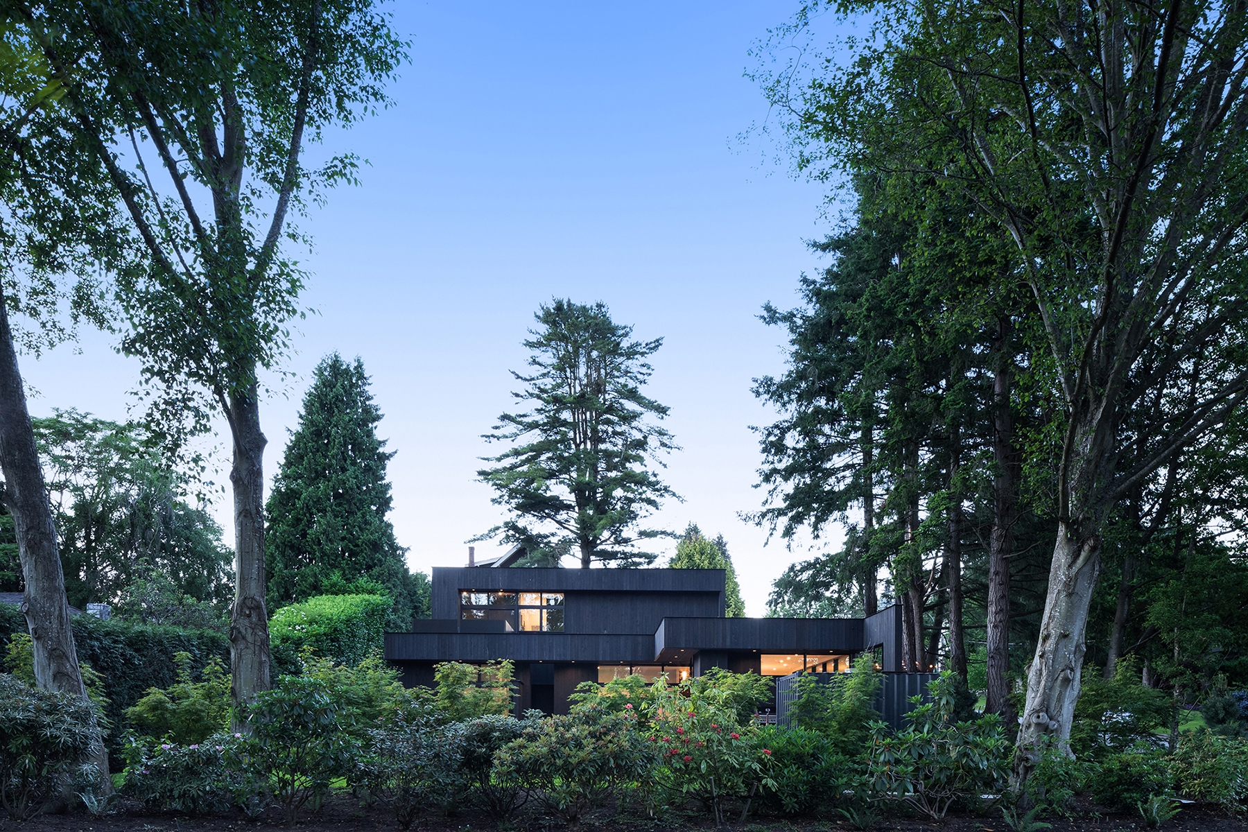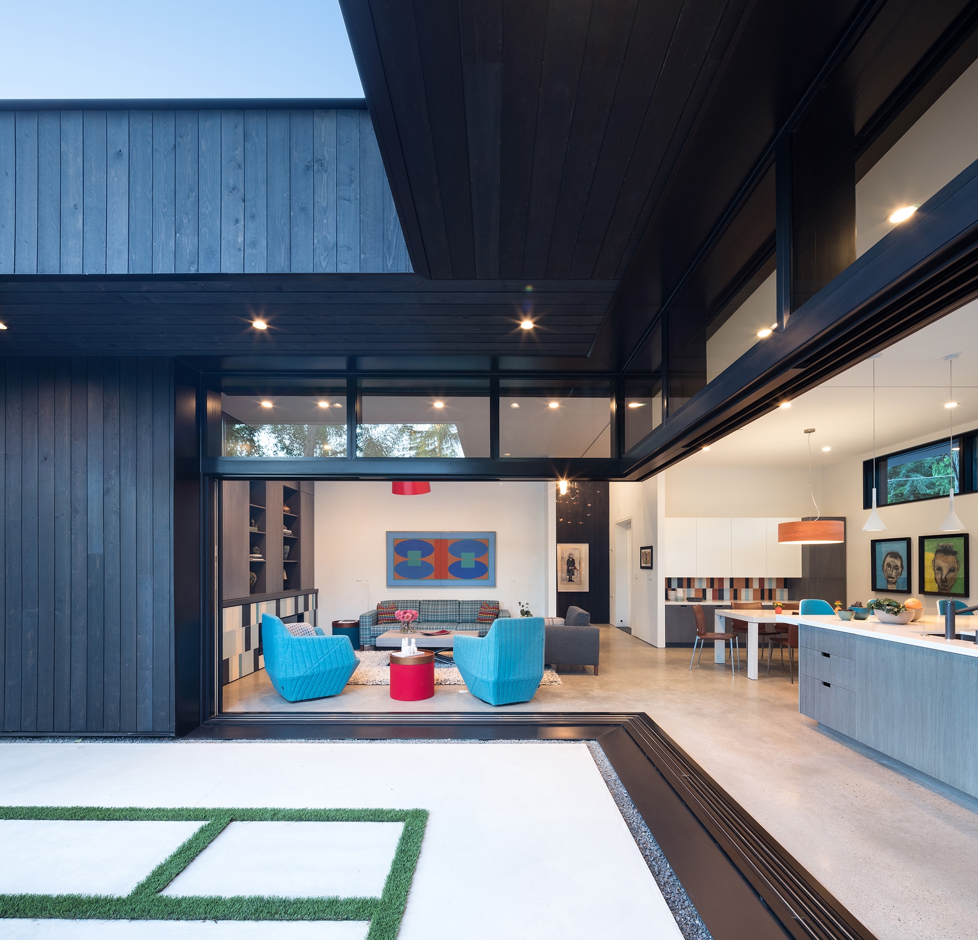 Seamlessly integrated into its semi-rural surroundings and tucked under a canopy of fir trees, the minimalist composition of Combo House—wood, glass, concrete and steel—opens to reveal a vibrant energy. The owners were downsizing and asked for a home designed to feel larger than its actual square footage while still intimate. The result is a deceptively simple space that uses volume, structure, light and colour to create both efficiency and warmth. Eleven-foot ceilings are fundamental to this approach, as is the open main-floor plan, which allows for a continuous inside-outside flow thanks to fully retractable sliders. The calm, synthesized palette of white walls and countertops, black ash cabinetry and sanded concrete floors allowed for the freedom to play with pattern and colour, best expressed by the handmade concrete tiles found throughout the building. Other highlights include ample storage space in floor-to-ceiling cabinetry along hallway walls and clerestory windows that frame the fir trees and welcome a dappled morning light. Four-foot overhangs over south-facing, full-height glass sections keep the interior in shade, while foot-thick walls help to control temperature.
