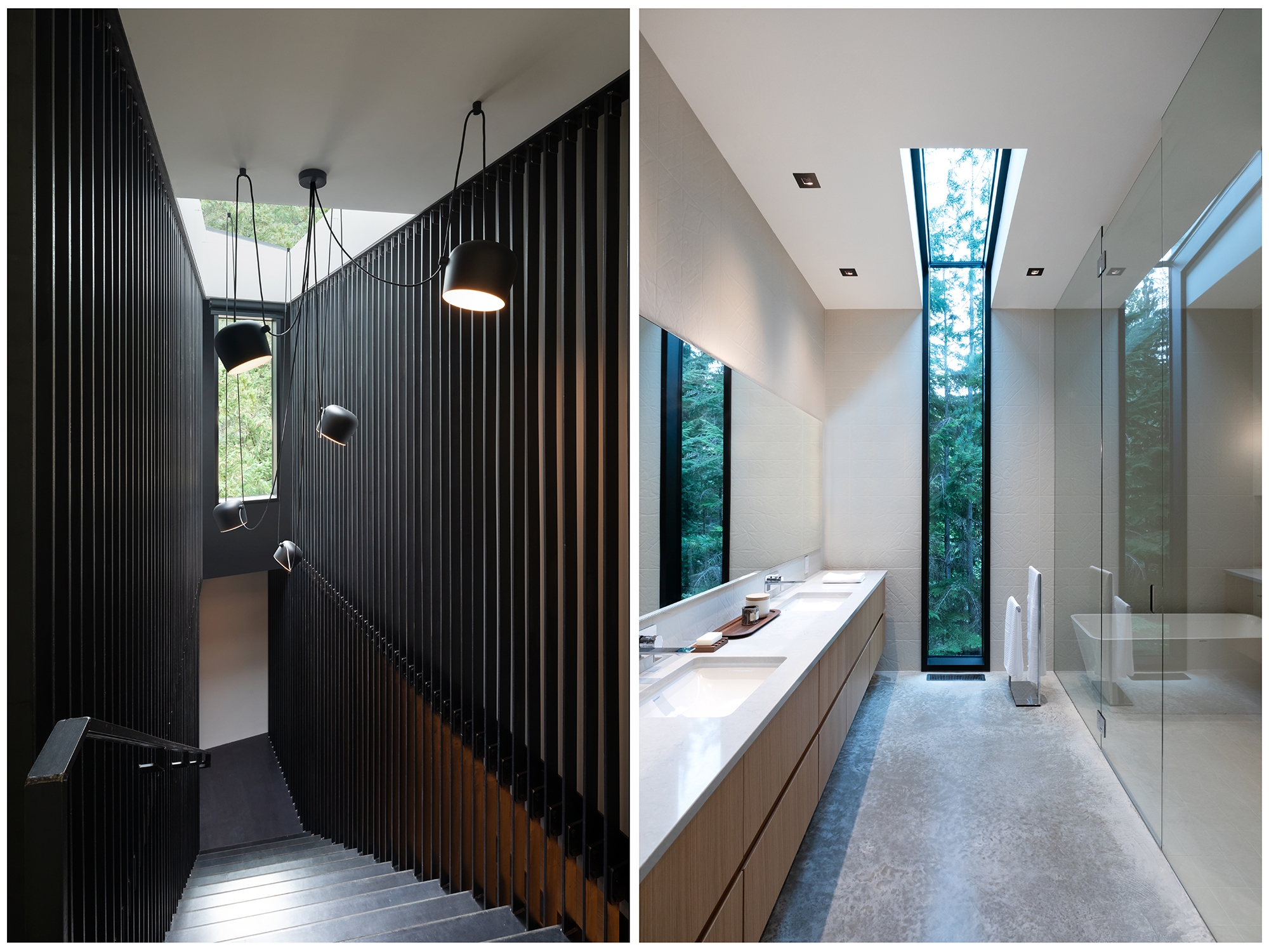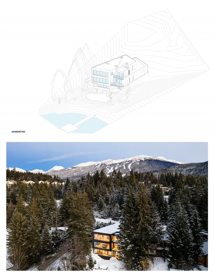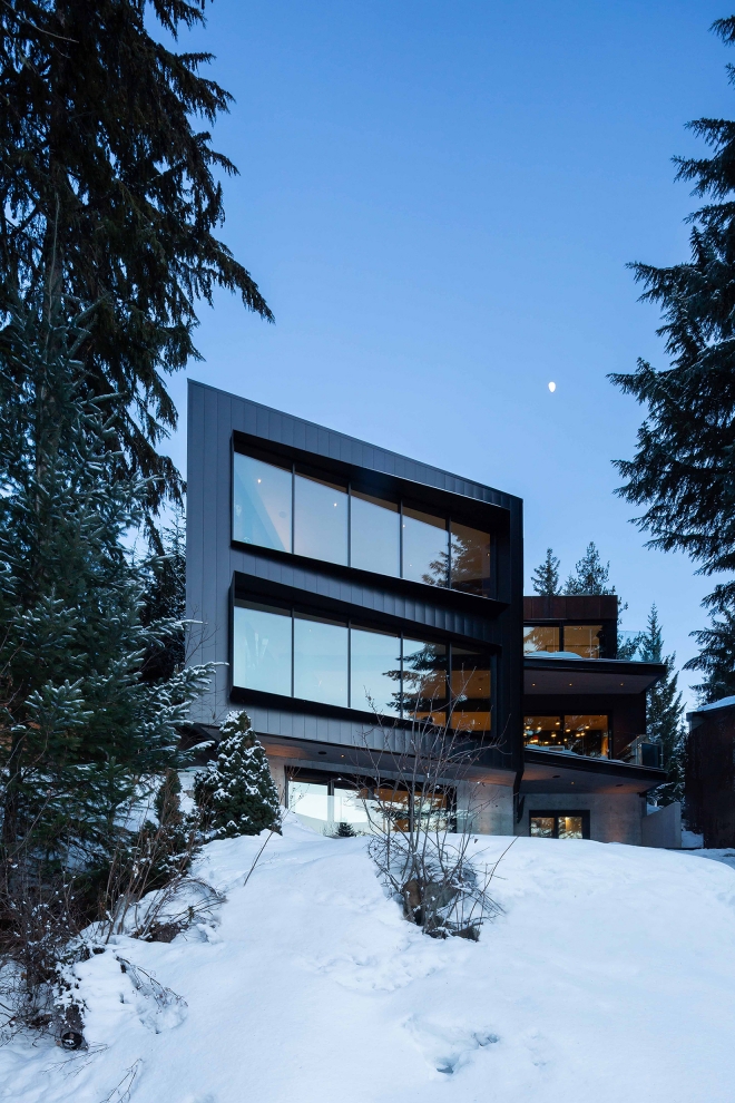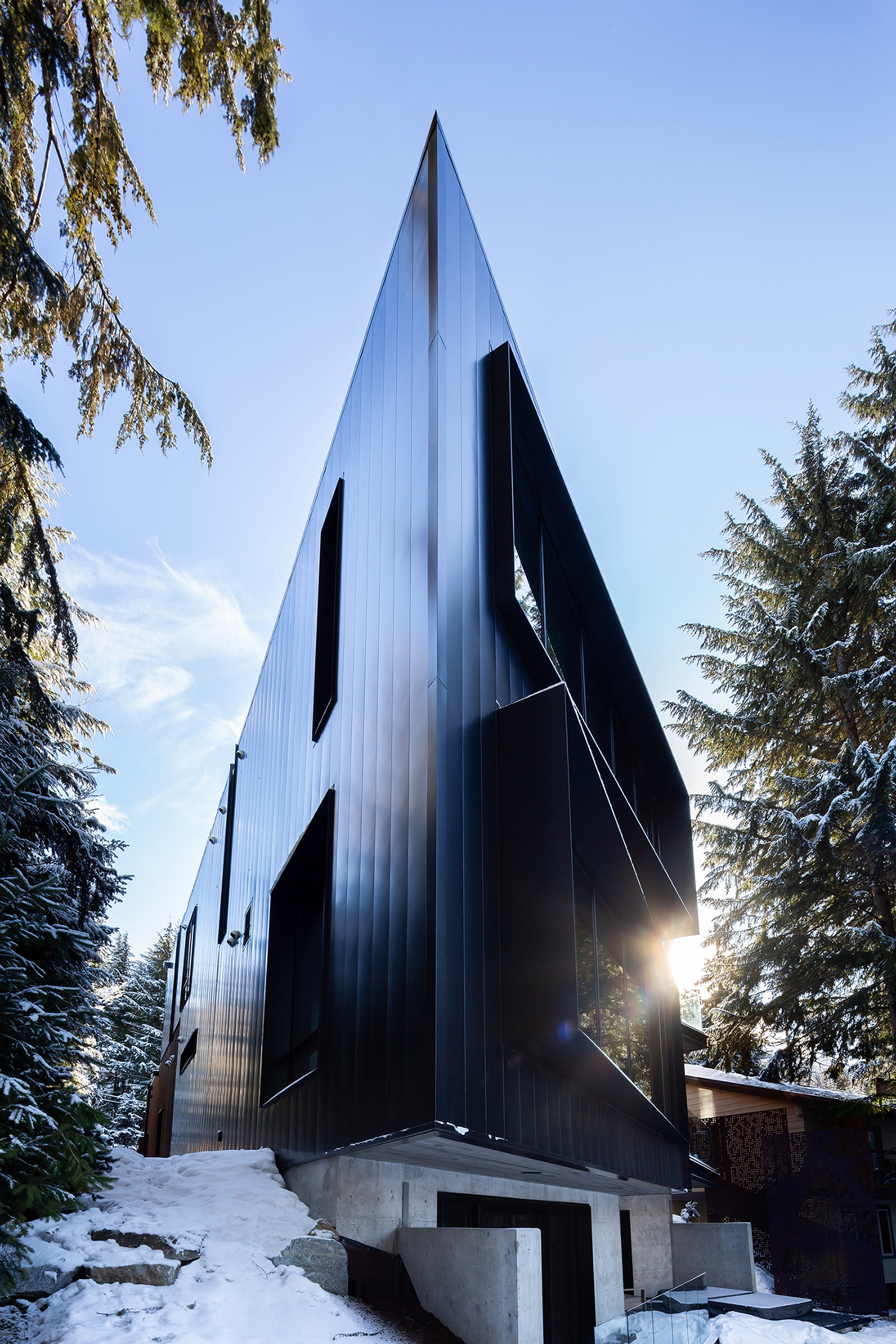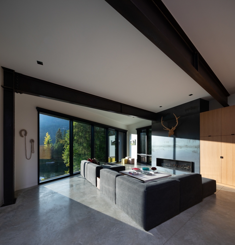 The project presented some unique site challenges as the narrow, trapezoidal lot was surrounded by a forest of towering conifers, deep-green lake waters and loamy soil, while the complicated steel structure required 3D models of every bolt and connection to work out problems prior to ordering any materials.