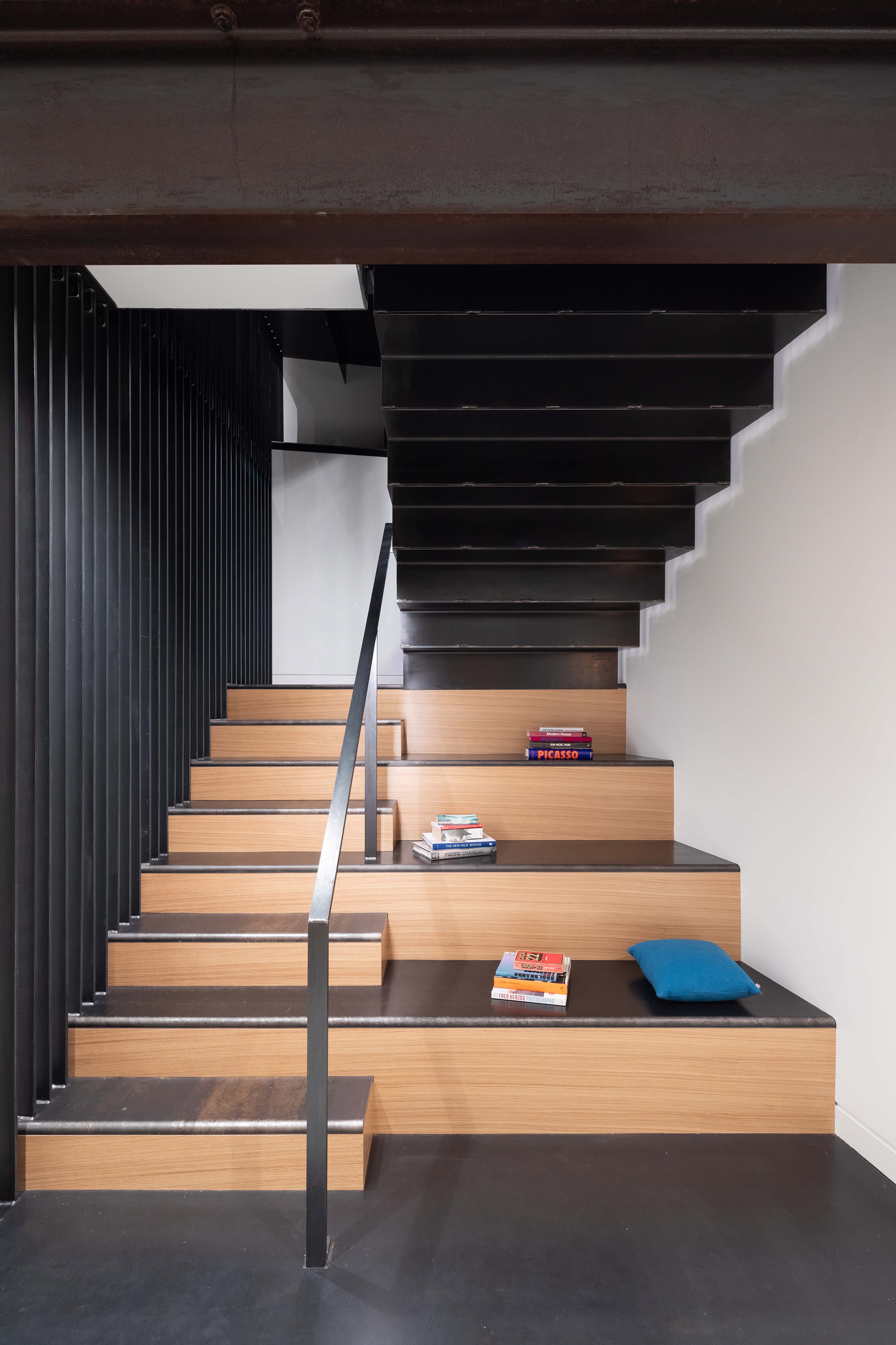 While the clients wanted a structure that could be considered a sculptural work of art, they also wanted their children to have the run of the house. The interior design reflects this: the overall mood playful and casual, its build durable and tough. The kitchen, designed to work for a family of six, easily adapts to large gatherings. The folded-plate steel staircase, a key feature, merges art with utility to connect the three stories of the house.
