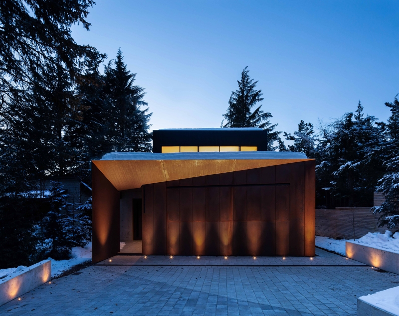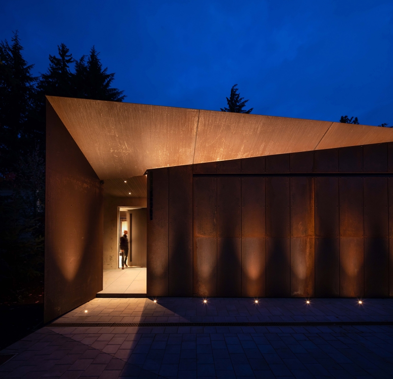 The result was a sculptural mass of angles, a contextual reflection of site and landscape. The building envelope presents as an angular composition of corten roof and cladding — a modulated surface and colouration that blends well with the soil and pine needle groundscape.