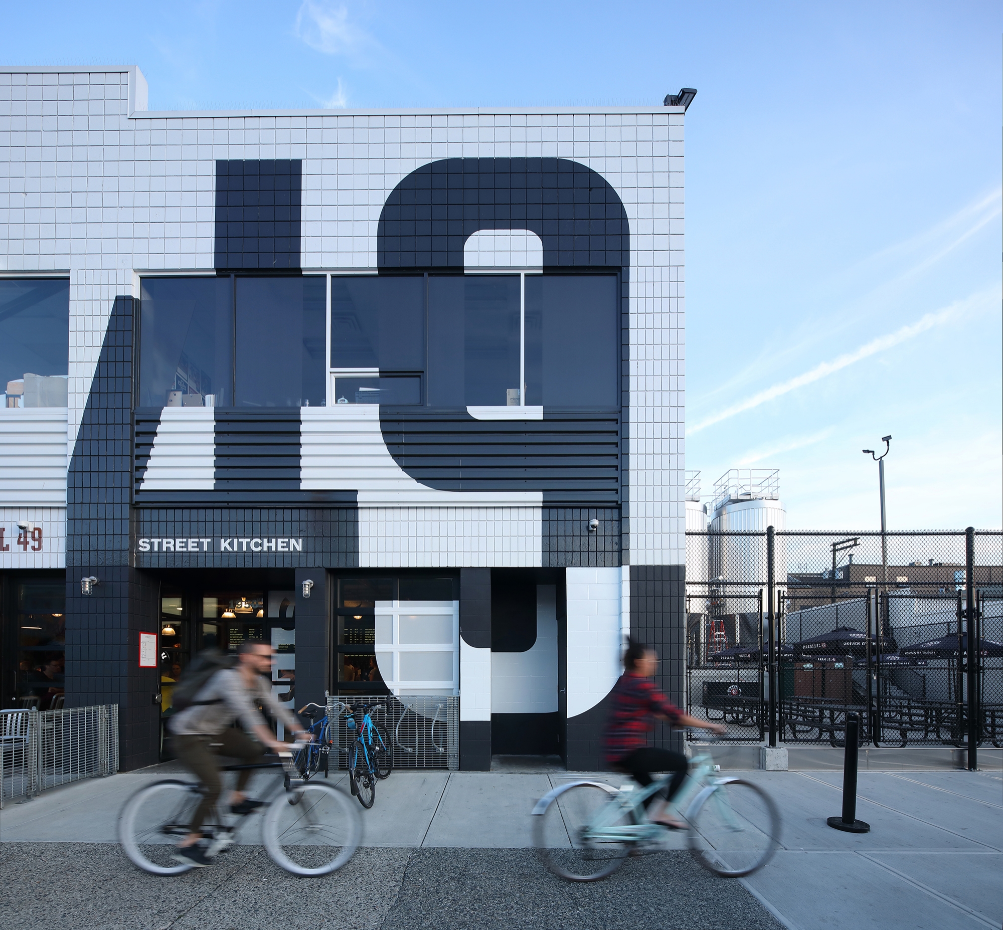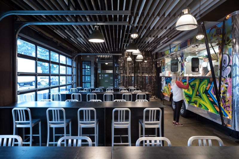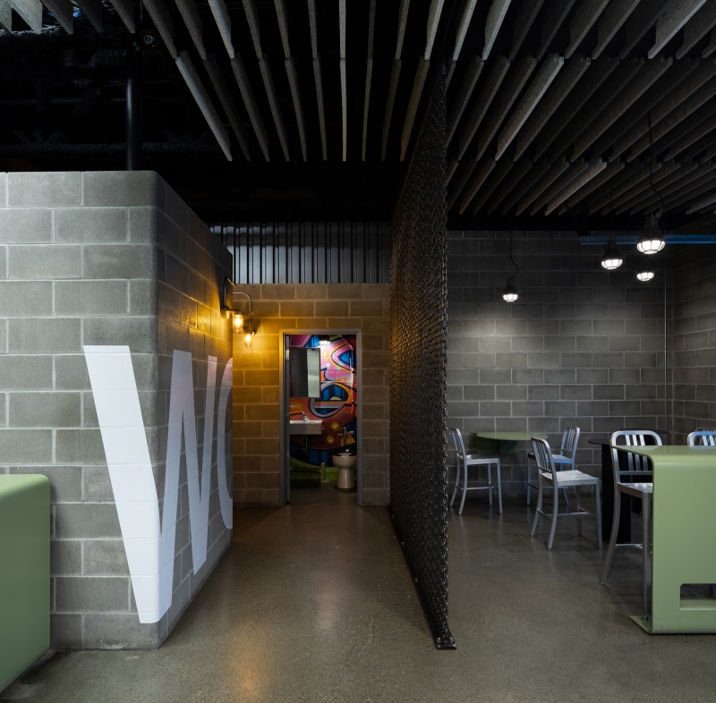 Existing patched and ground concrete floors were maintained to bring the sidewalk inside with the use of the street work line graphics. With the patio doors open, the neighborhood culture spills in from the street.