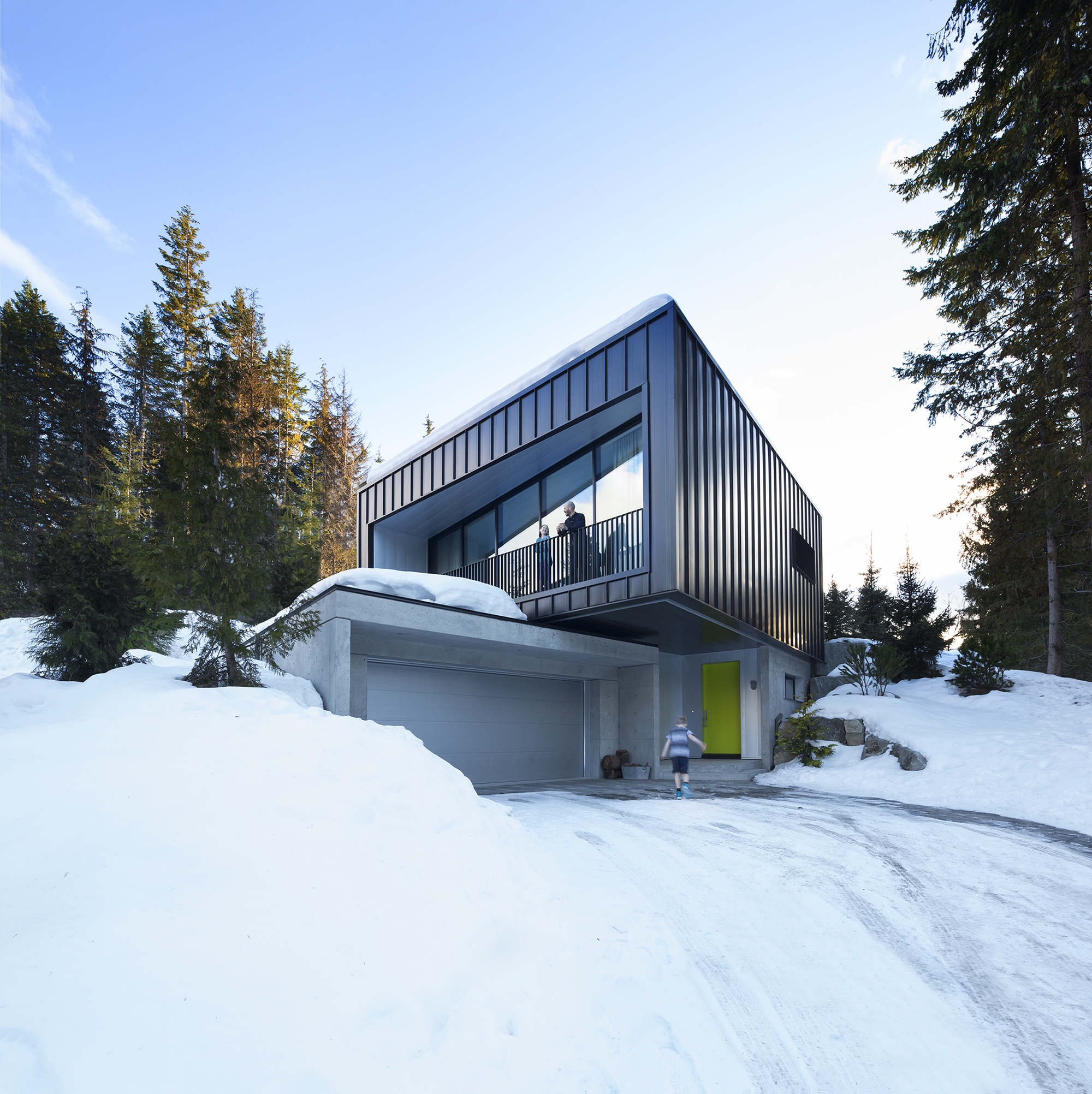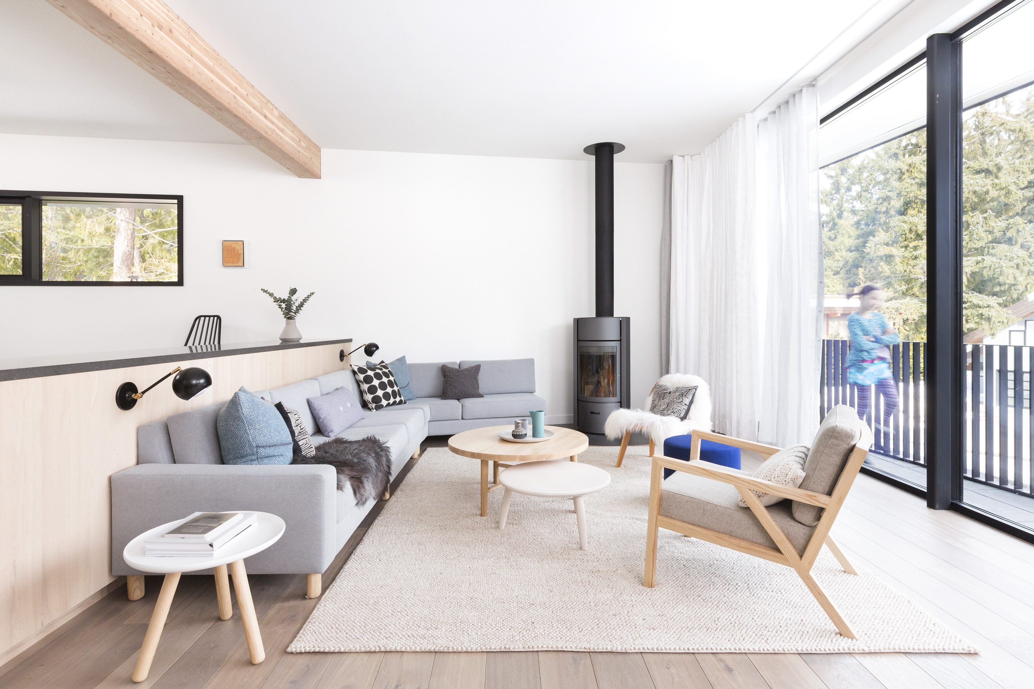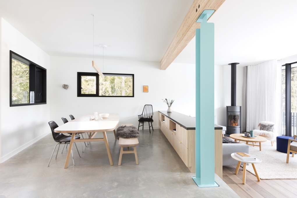 Conceived and created as a gathering space, White Lodge offers its owners and their two children a respite from the pull of their daily lives. Here, they gather with friends, share meals and play board games – reconnecting with themselves and each other. White Lodge is a confluence of form and function. The cantilevered form floats over the driveway, born from the practical need of loading and unloading vehicles under cover from the range of precipitation. Climbing from the entrance to the main level, the sky-lit glow of the stairwell guides guests to a calm, bright living space with views of the landscape beyond. Throughout the design process the focus on function was intertwined with the desire to achieve an aesthetic of a light, open space on the main level, to offset dark Coastal winters. It was also important to the clients that the structure be efficient. Building 60% of the lower level into the hill not only situates the home well within its site, but also drastically reduces heating requirements. Environmental design keeps to the brief, enhancing the family’s connection to the natural elements of the site.