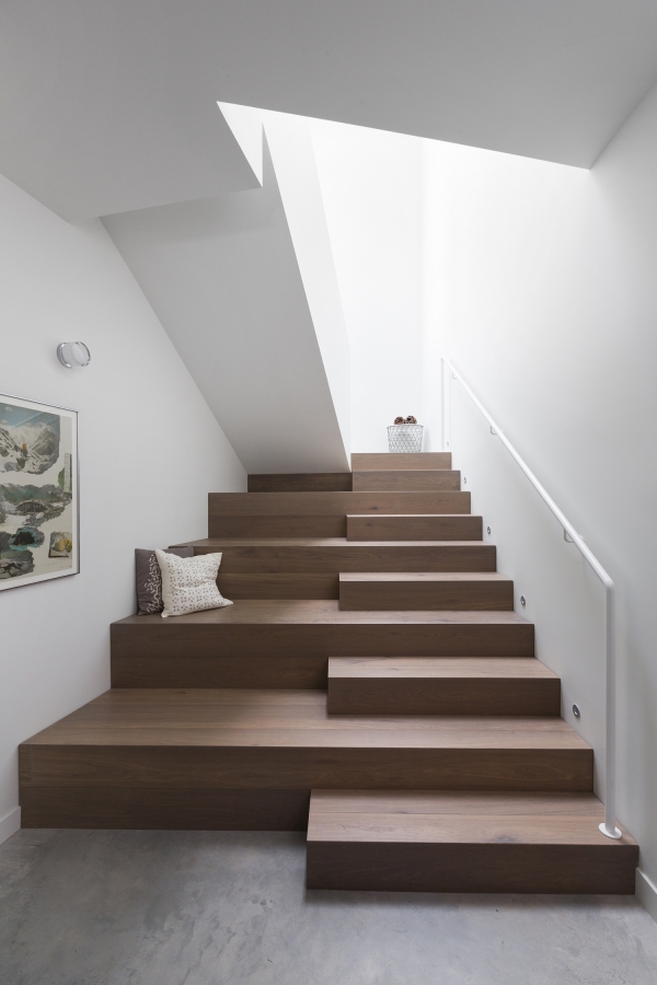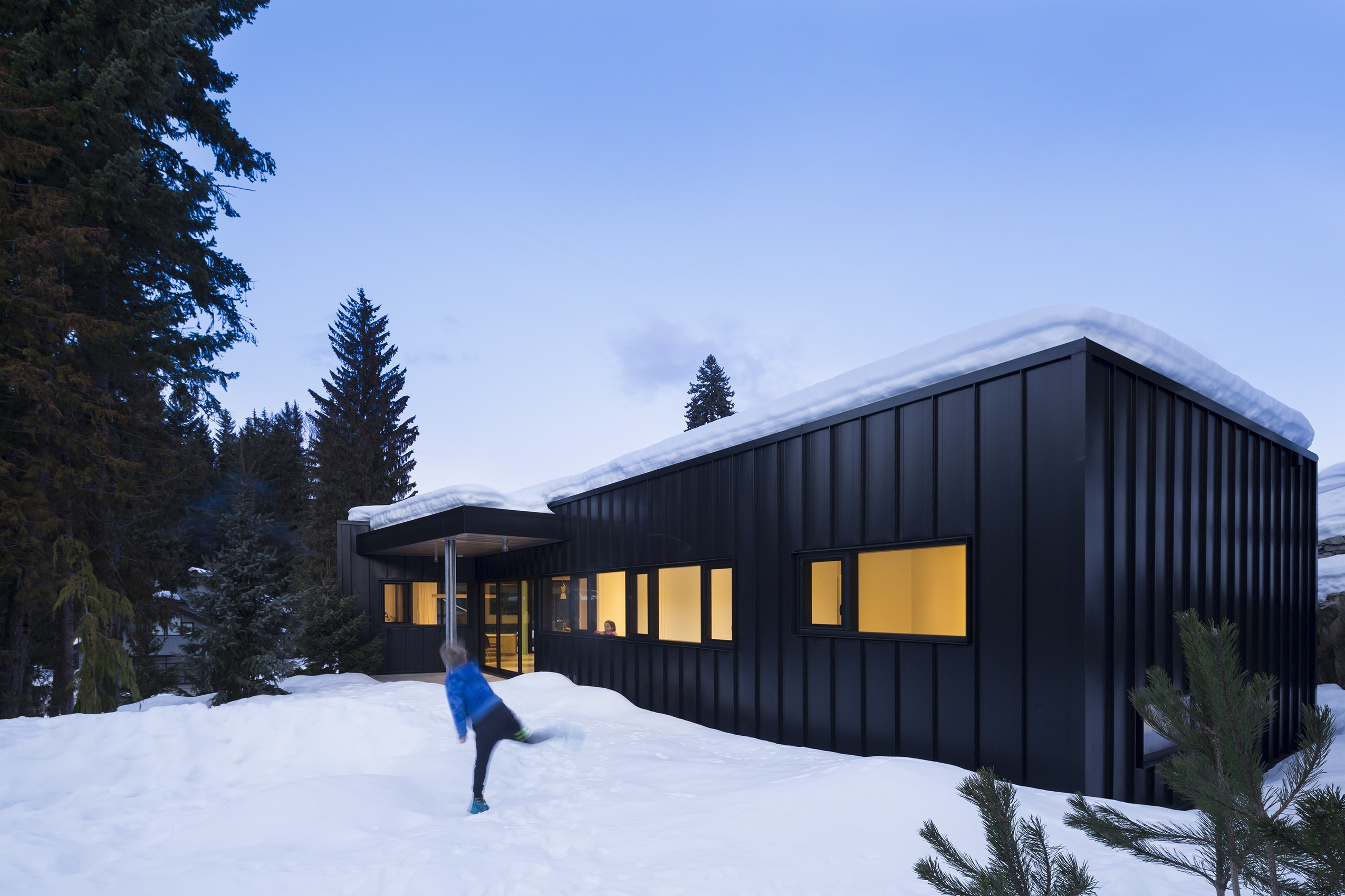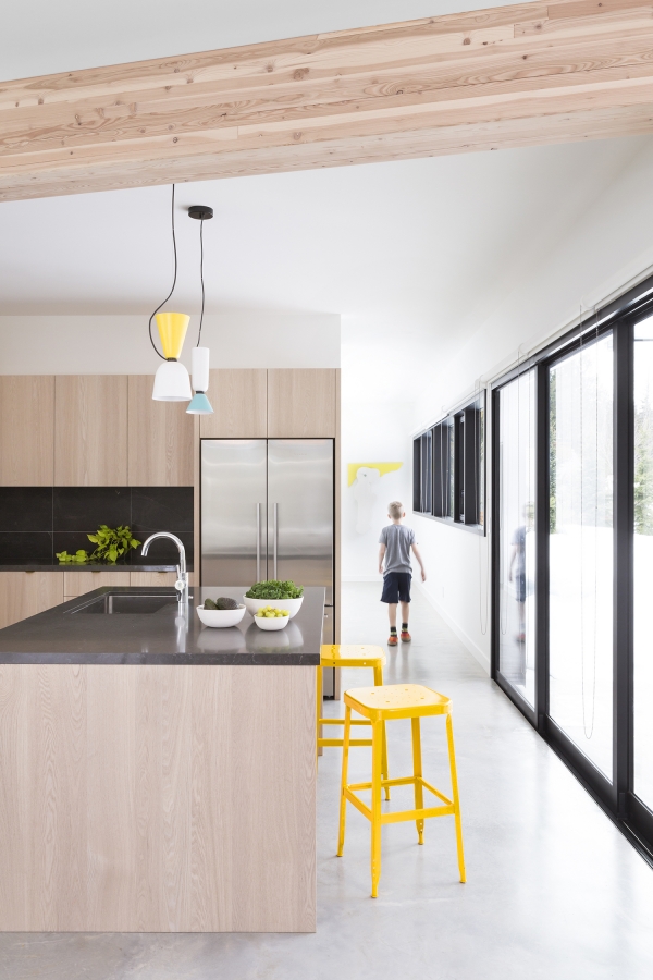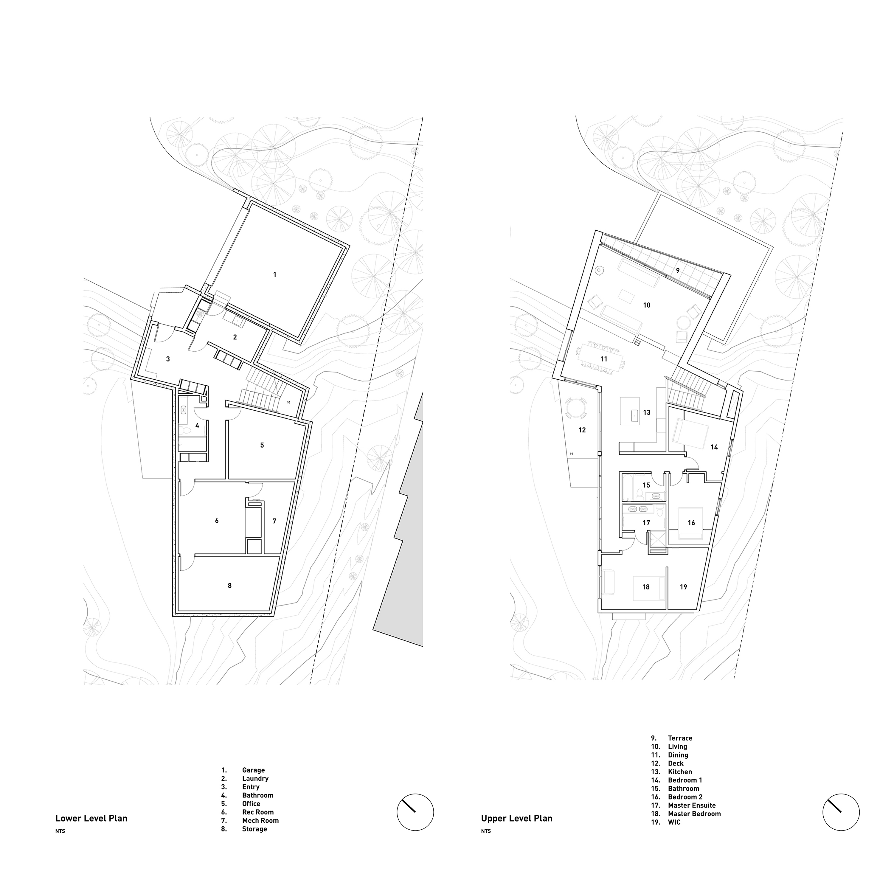 Conceived and created as a gathering space, White Lodge offers its owners and their two children a respite from the pull of their daily lives. Here, they gather with friends, share meals and play board games – reconnecting with themselves and each other. White Lodge is a confluence of form and function. The cantilevered form floats over the driveway, born from the practical need of loading and unloading vehicles under cover from the range of precipitation. Climbing from the entrance to the main level, the sky-lit glow of the stairwell guides guests to a calm, bright living space with views of the landscape beyond. Throughout the design process the focus on function was intertwined with the desire to achieve an aesthetic of a light, open space on the main level, to offset dark Coastal winters. It was also important to the clients that the structure be efficient. Building 60% of the lower level into the hill not only situates the home well within its site, but also drastically reduces heating requirements. Environmental design keeps to the brief, enhancing the family’s connection to the natural elements of the site.