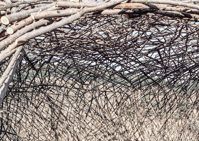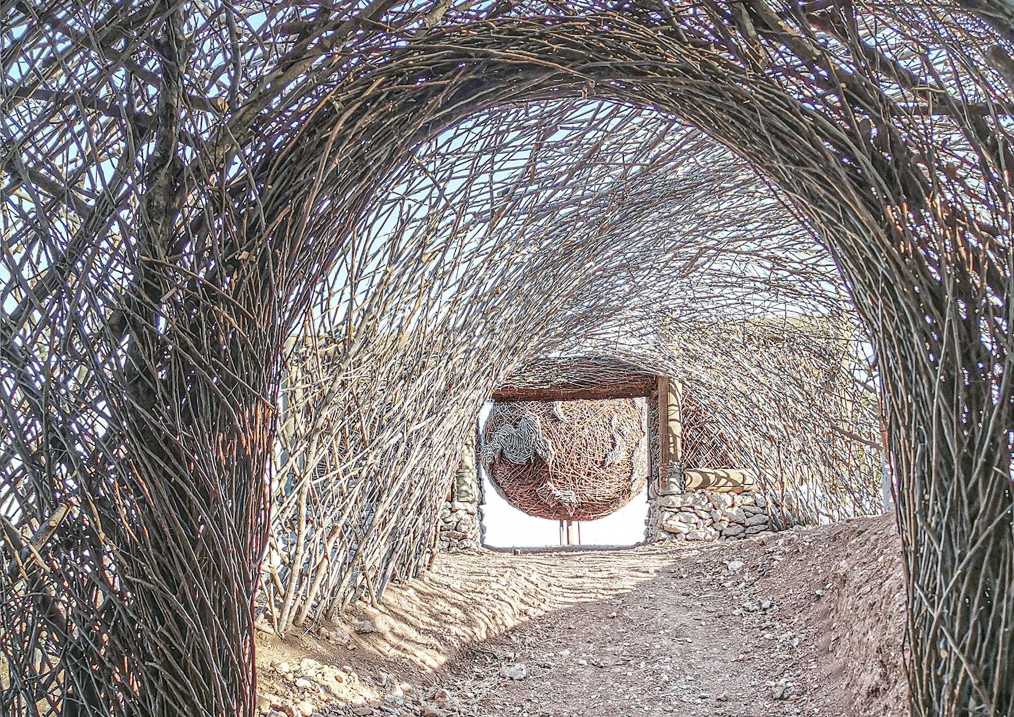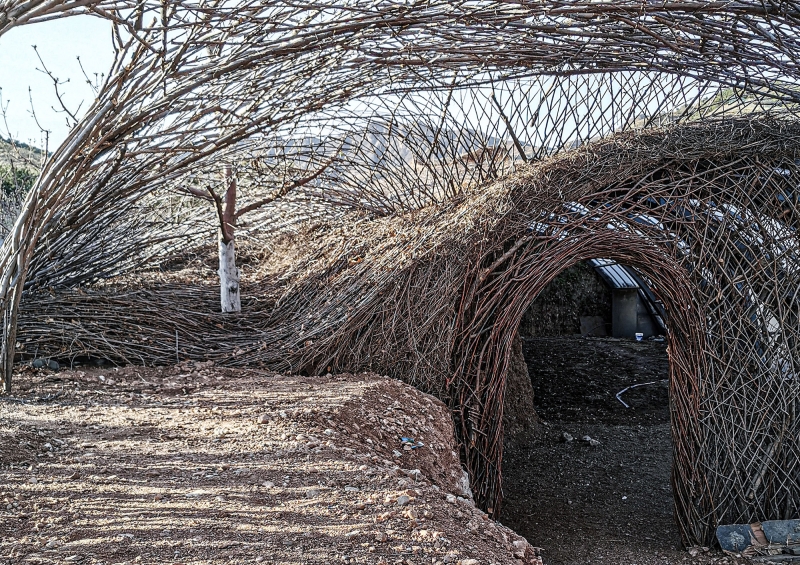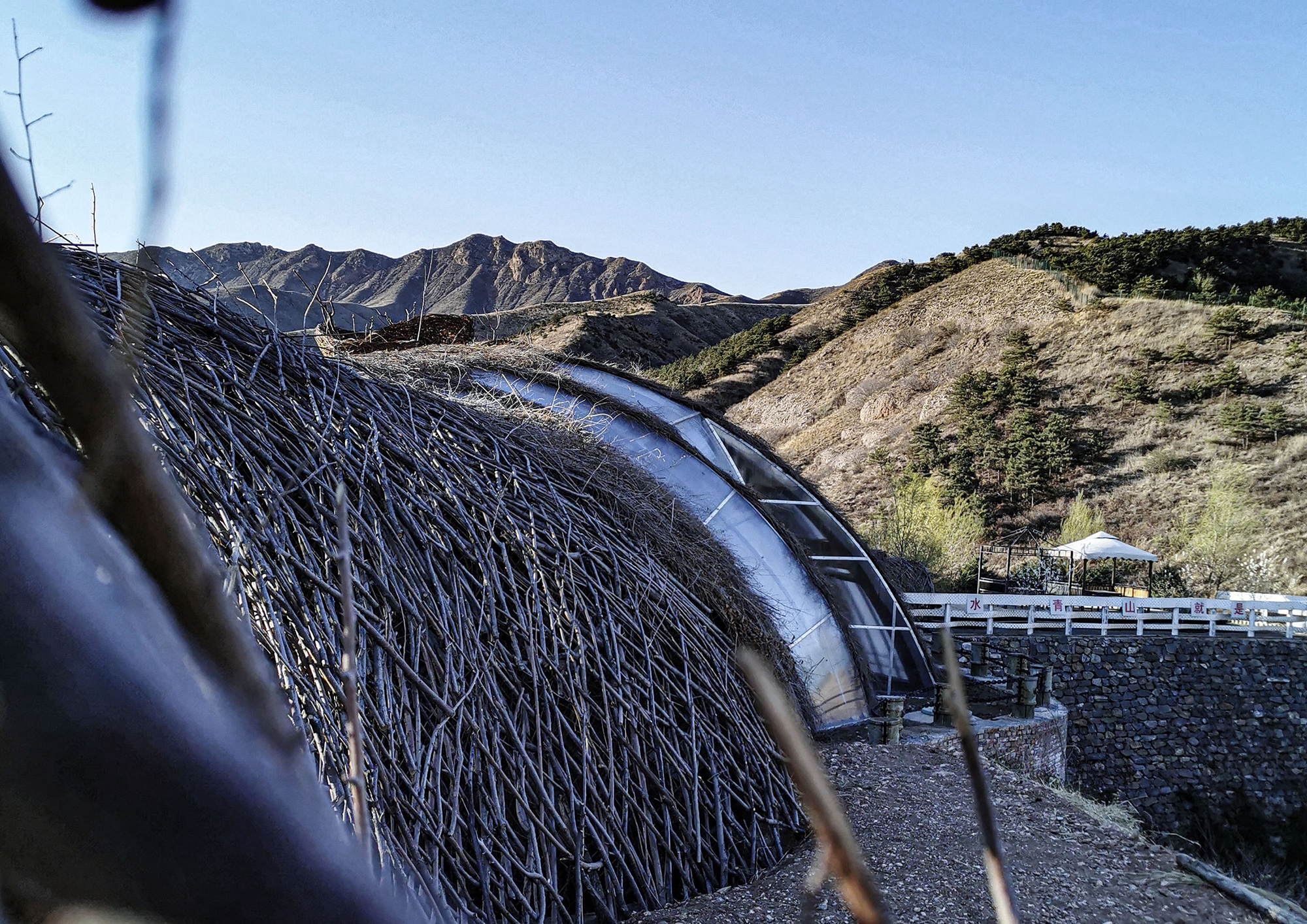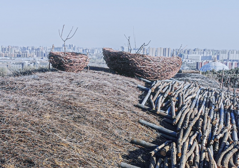 We hope to awaken people’s inner sensitivity to nature. The whole building uses the birch branches collected from the surrounding area as the main material, enclosing a set of free curved spaces in a rough way. The light and shadow on a sunny day are diffuse, and the reflection in the rainy season is distinct. Relying on the mountain to follow the trend, and produce a shape that complements the mountains.