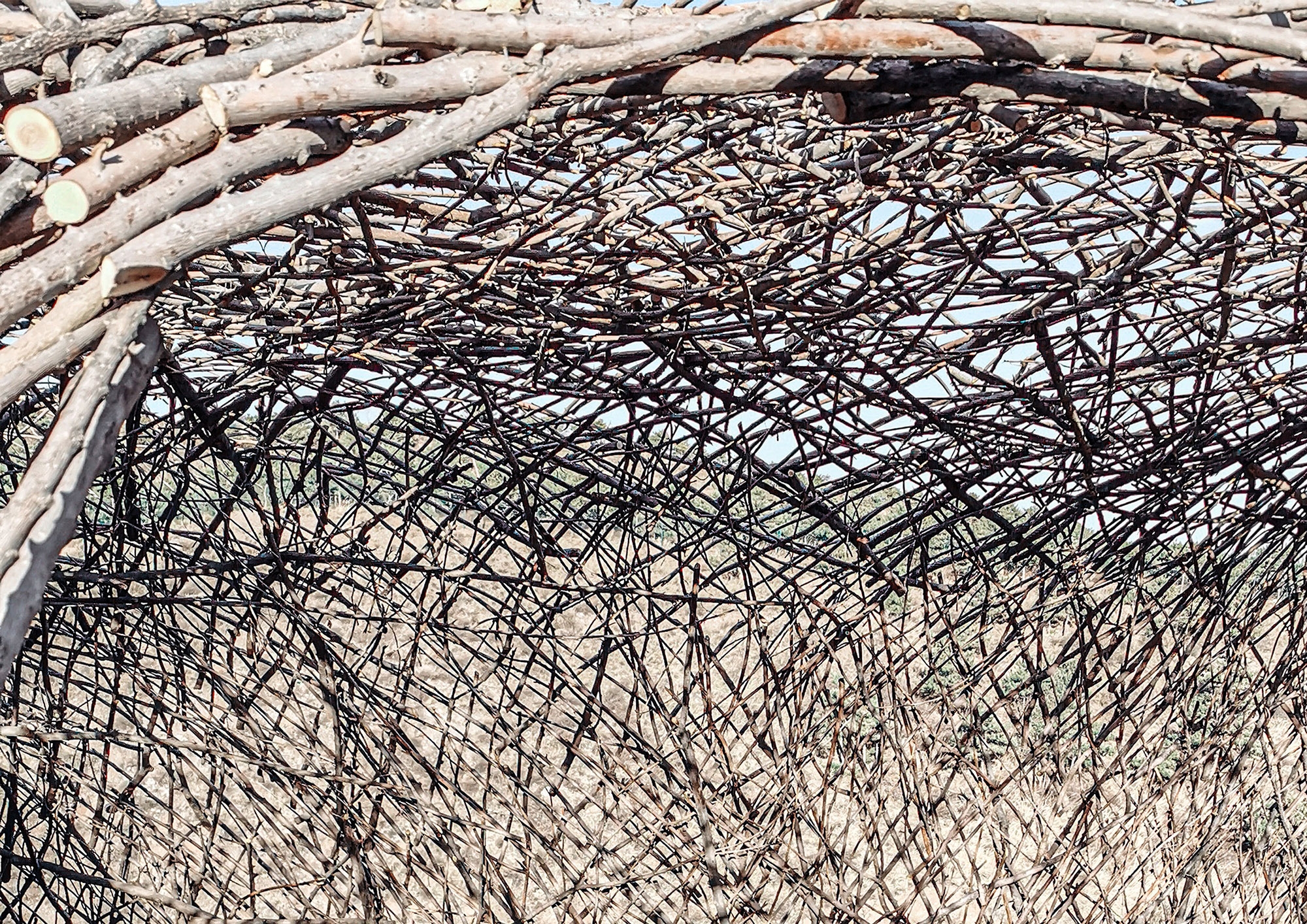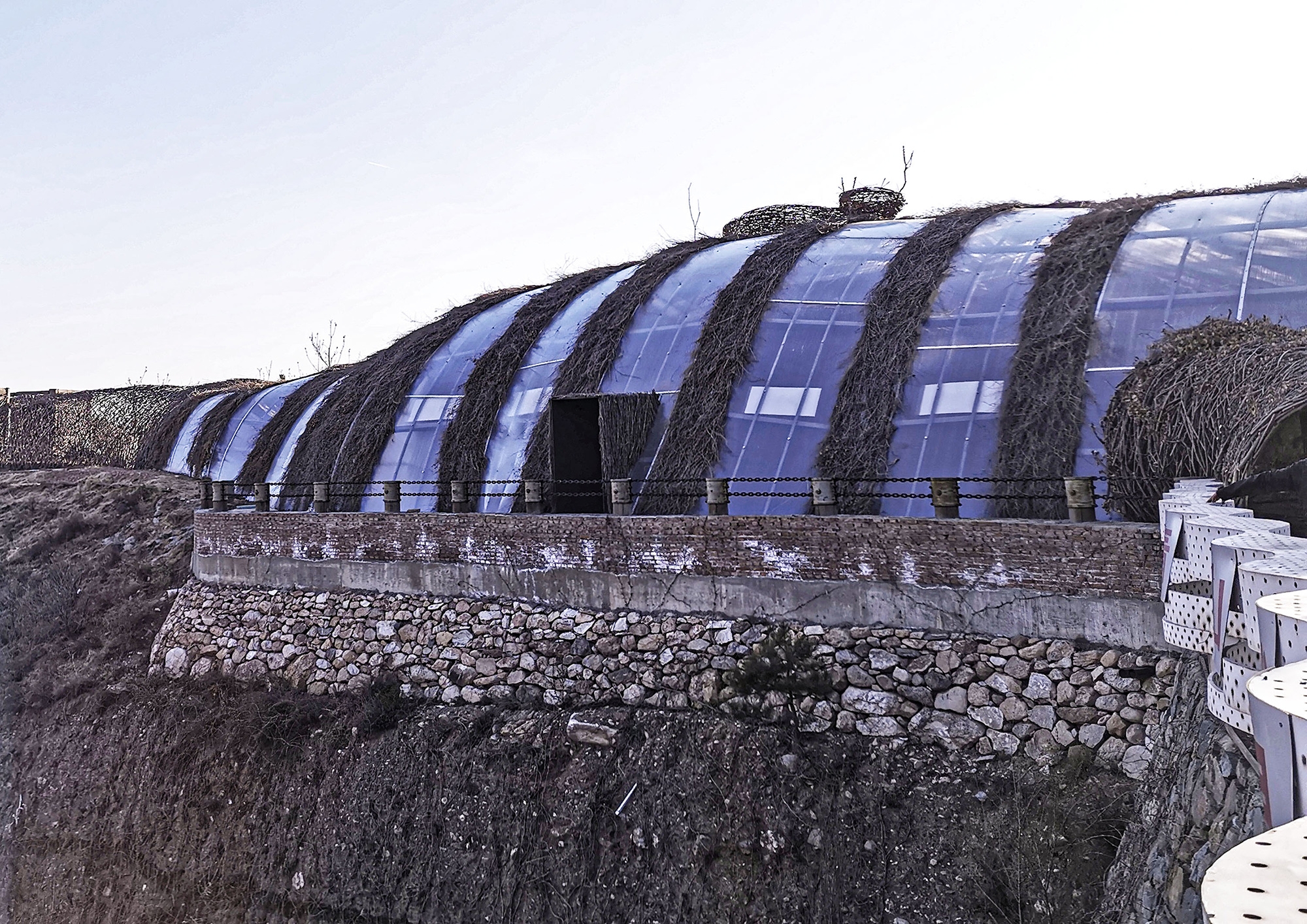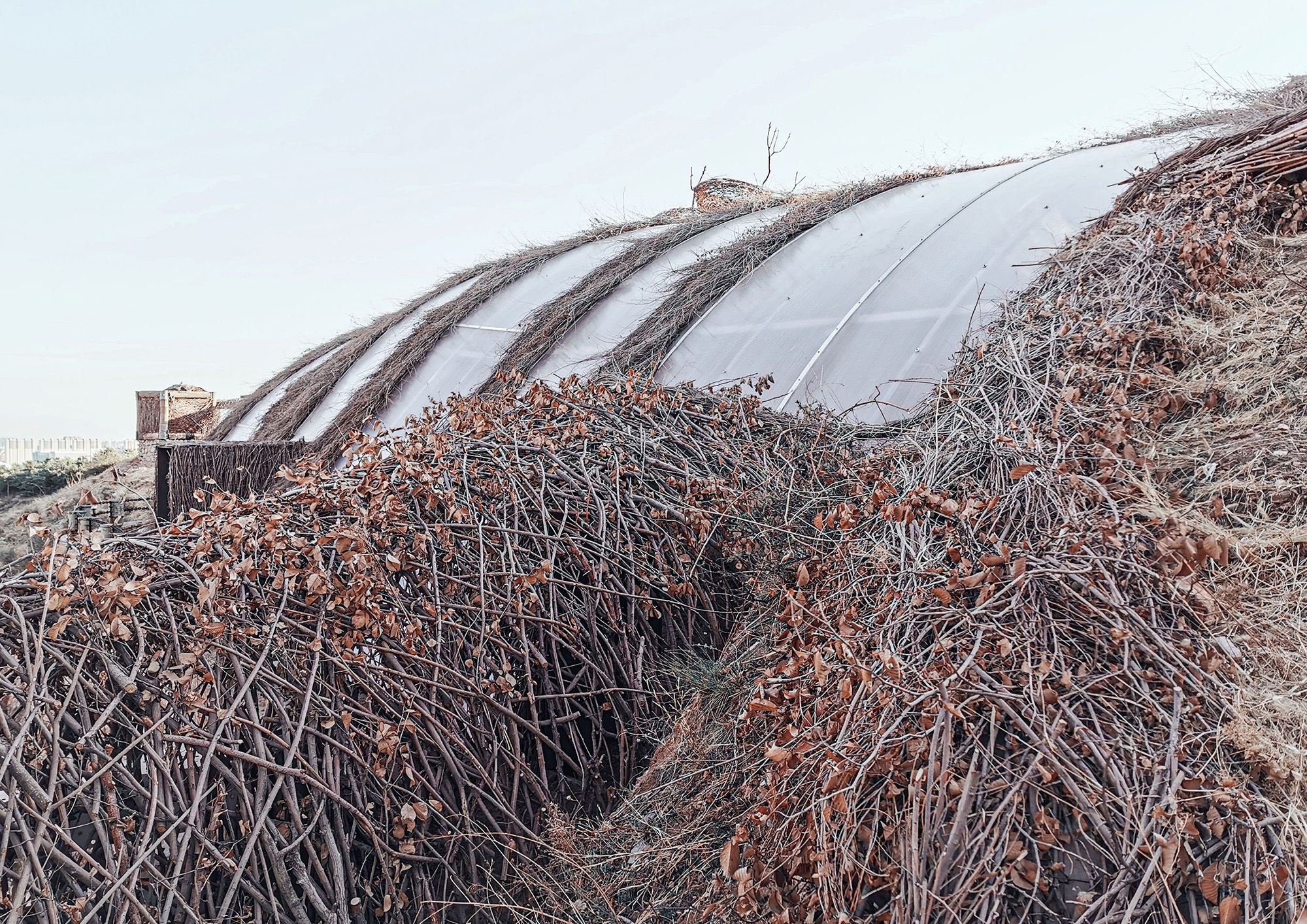 We hope to awaken people’s inner sensitivity to nature. The whole building uses the birch branches collected from the surrounding area as the main material, enclosing a set of free curved spaces in a rough way. The light and shadow on a sunny day are diffuse, and the reflection in the rainy season is distinct. Relying on the mountain to follow the trend, and produce a shape that complements the mountains.