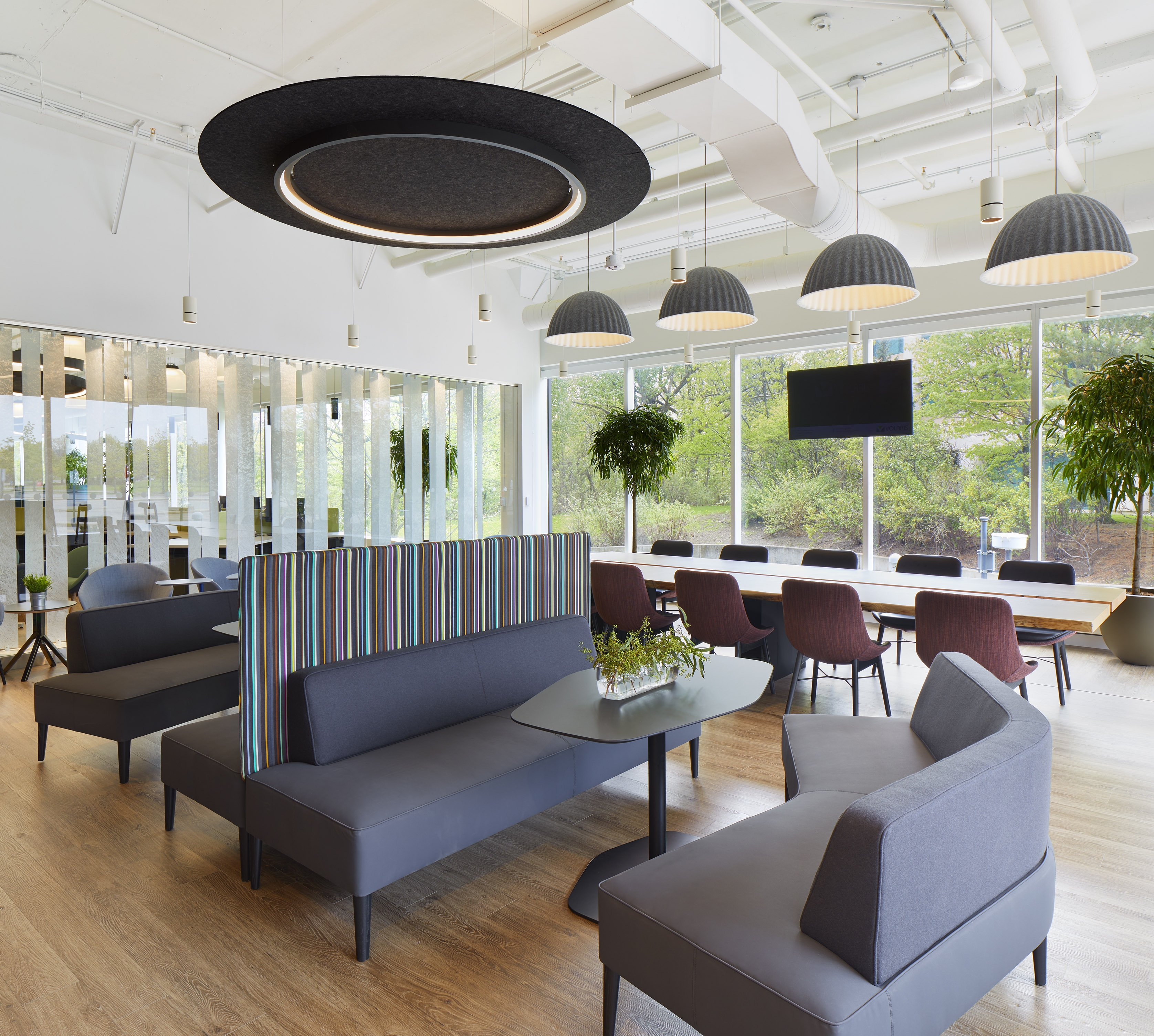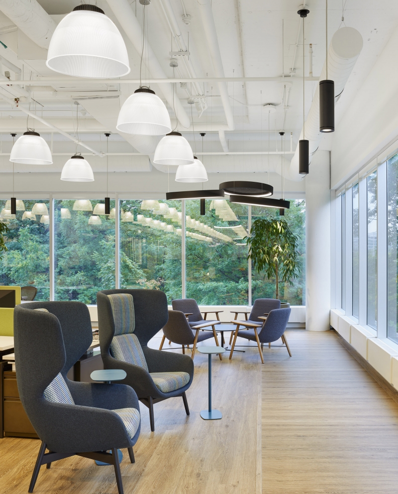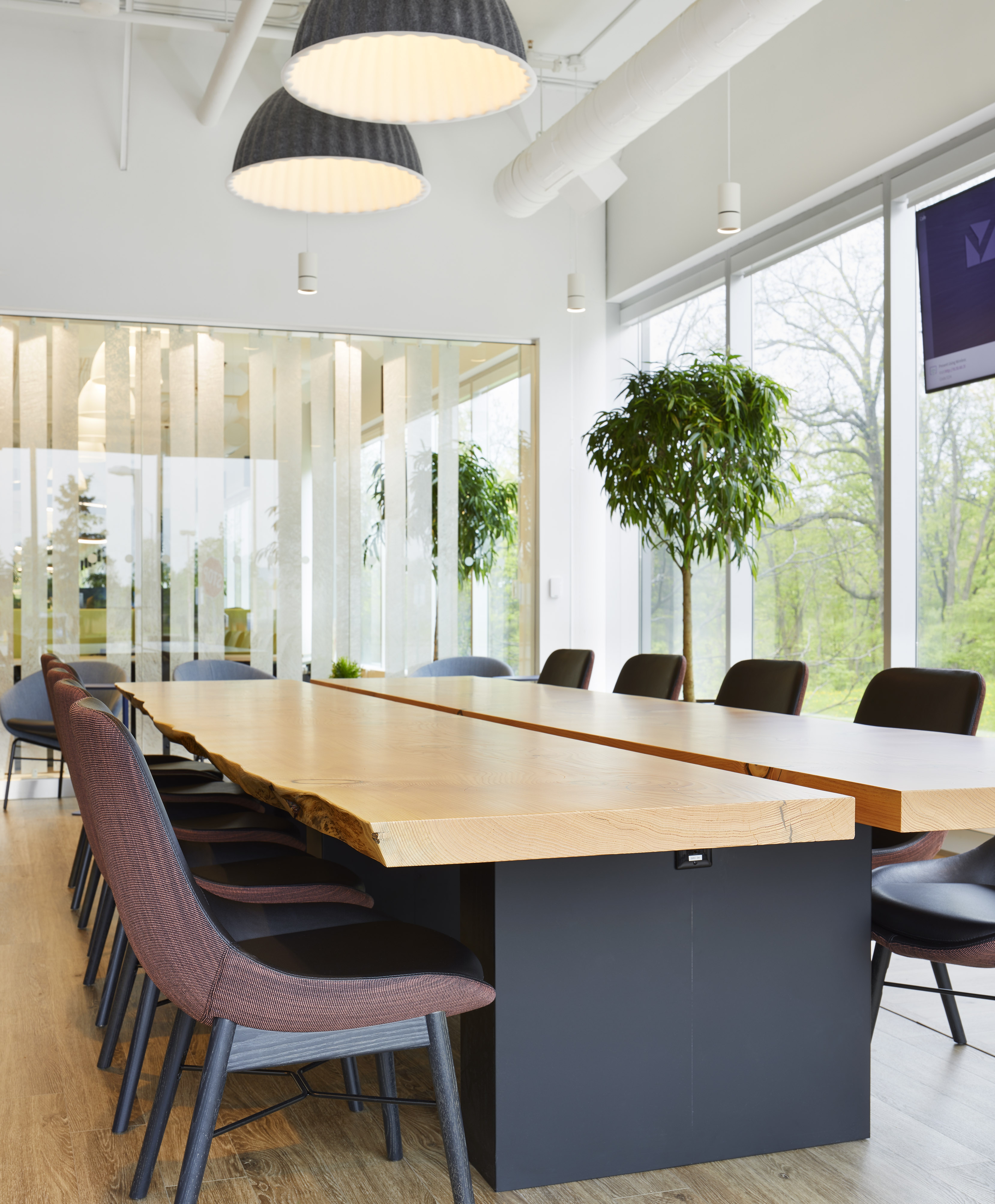 Rather than contrast the forest view with a rigid workstation layout, we swapped standard right angles for 120-degree desks, grouping them in winding formations that appear cellular in their configuration. The plan's organic movement and flow is complemented by such natural materials as felt and wood. Devised to stimulate conversation, the project also incorporates a spacious café, multiple breakout zones, and a custom harvest table.