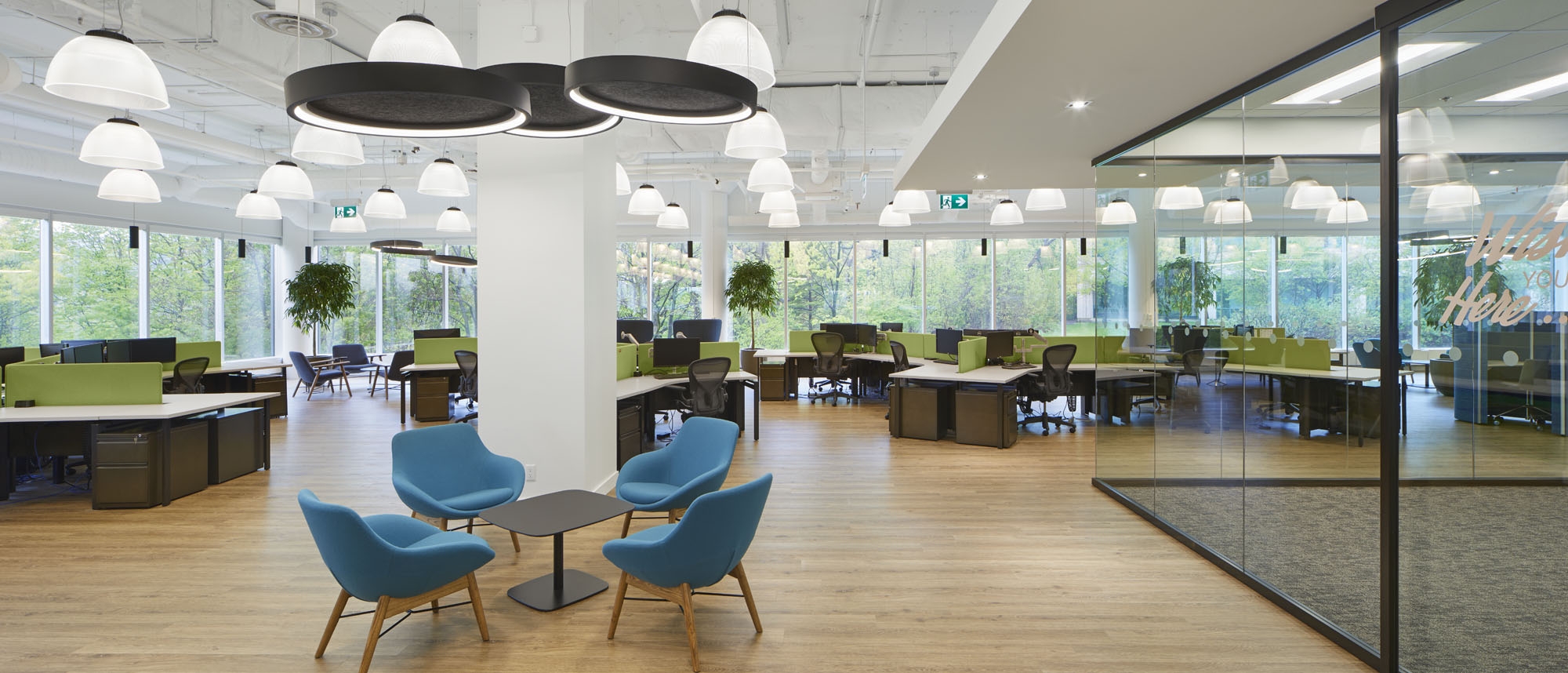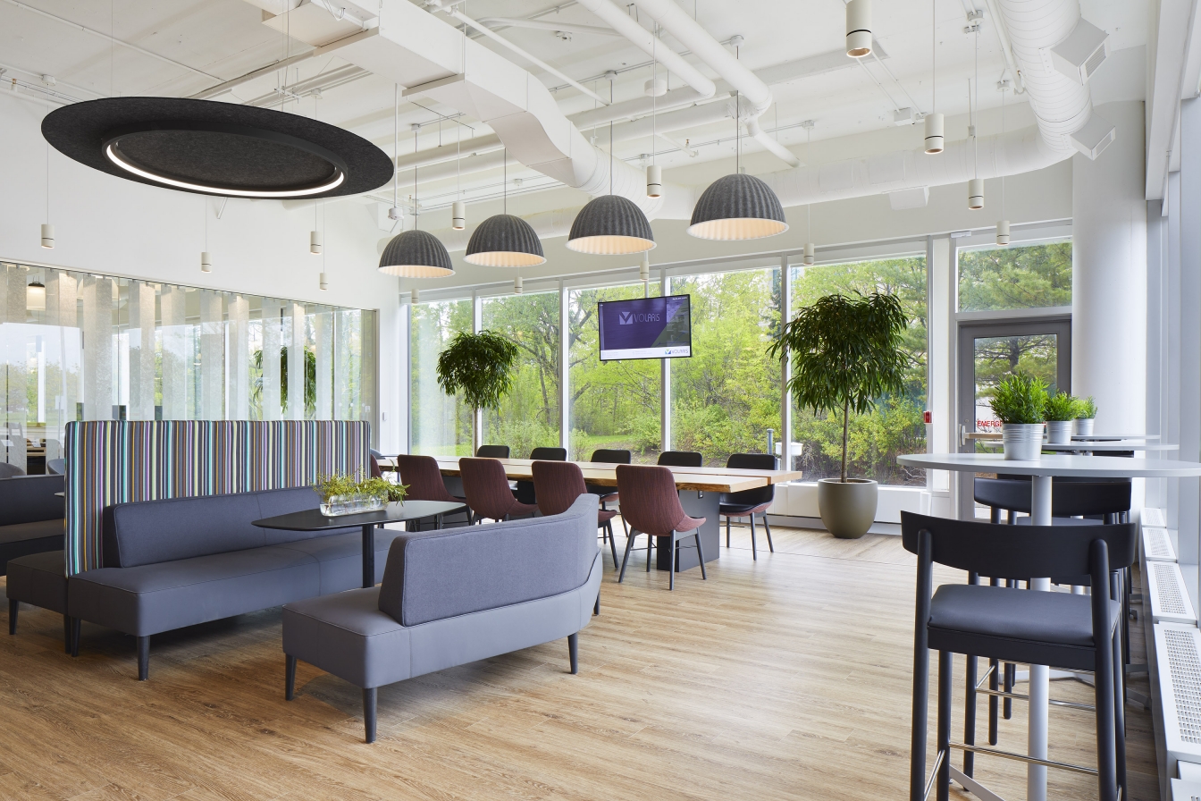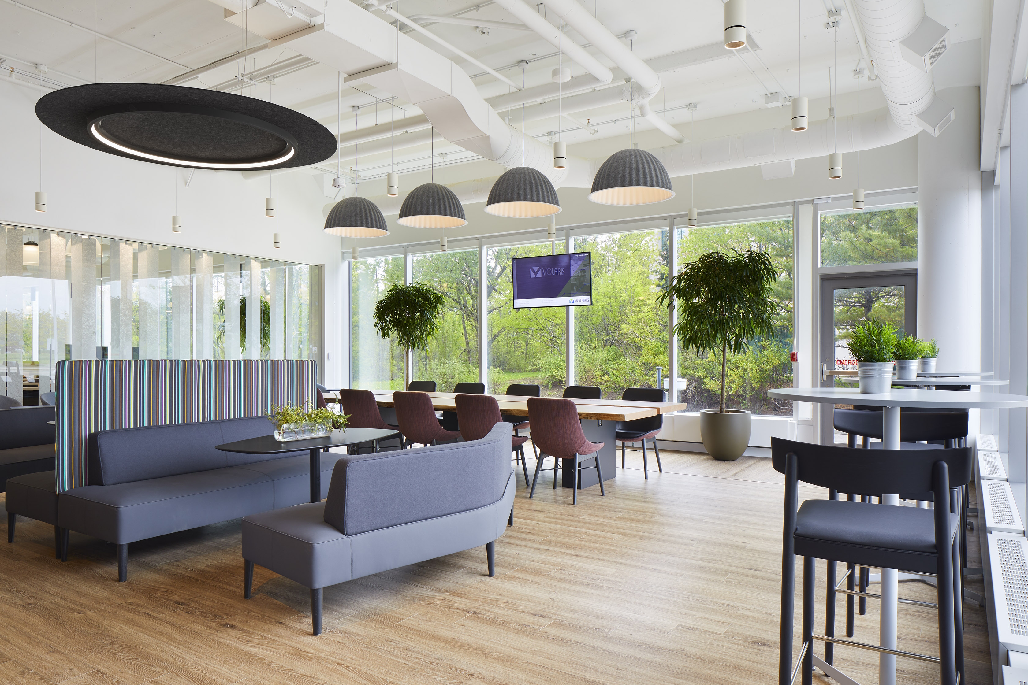Located next to a conservation area in Toronto, the new HQ of tech firm Volaris looks into a lush green forest. Inspired by this setting, the client asked for a space where they could relax, focus, and collaborate. To bring the calming effects of the woods into the office, the design team worked to blur the lines between inside and out.