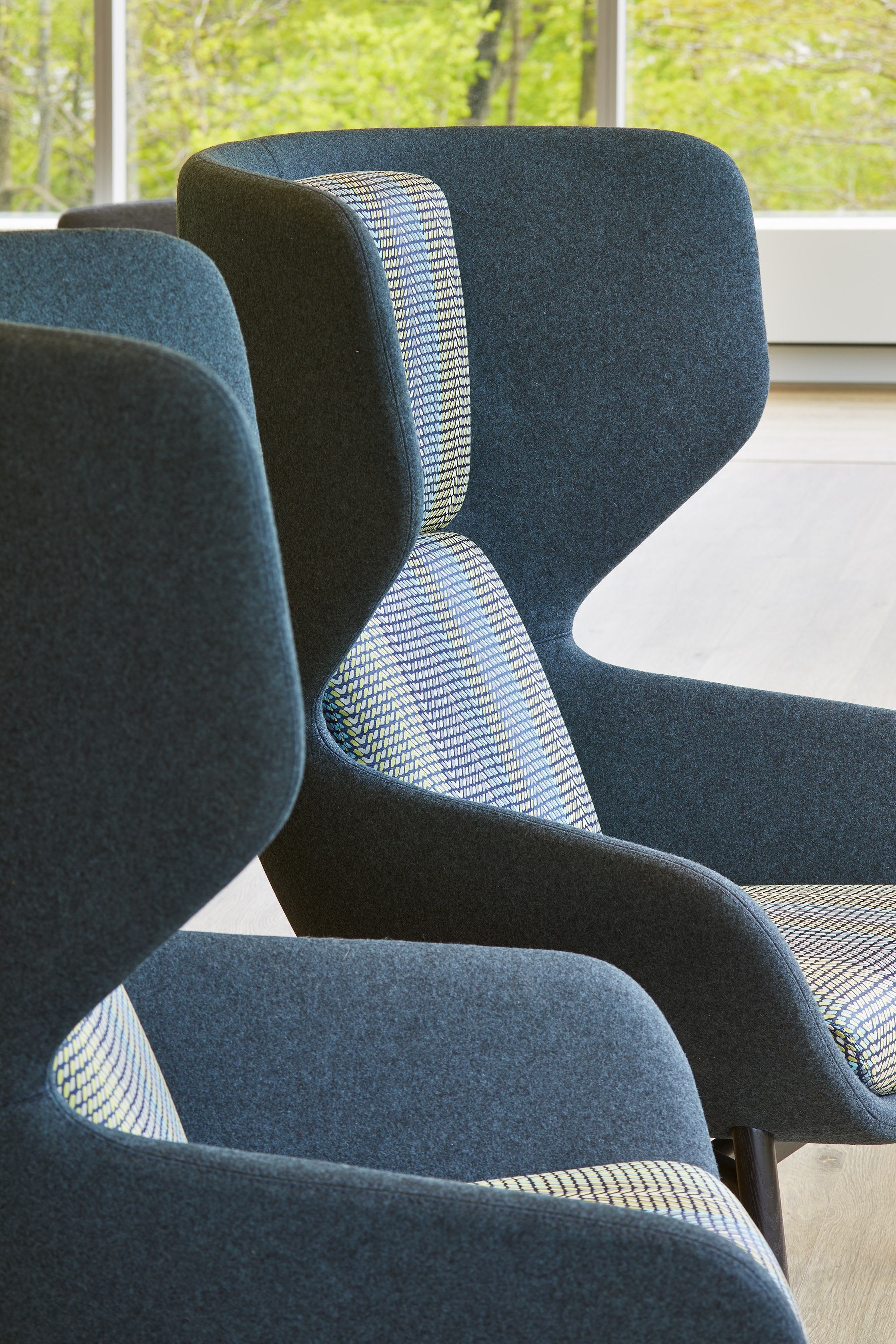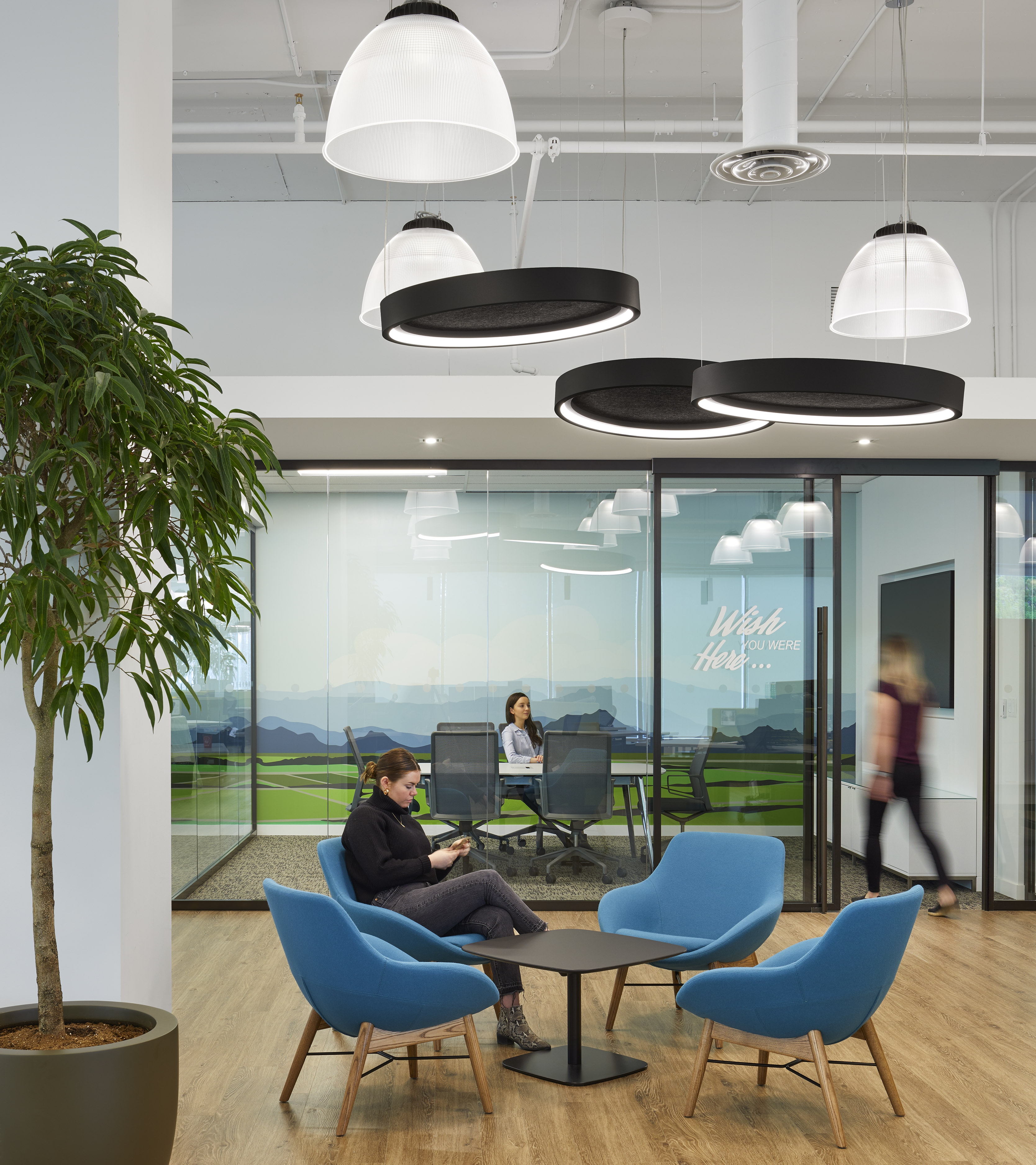 The project’s pièce de résistance is the Boardwalk – a six-foot-wide pathway that runs the full length of the windows. Delineated by a change in the direction of the wood floor planks, this indoor trail is scattered with pairs of mid-century modern wingback chairs and a series of eight-foot-tall Ficus trees. It’s an inviting amenity from which anyone in the office can unwind and enjoy the natural beauty of the site.