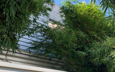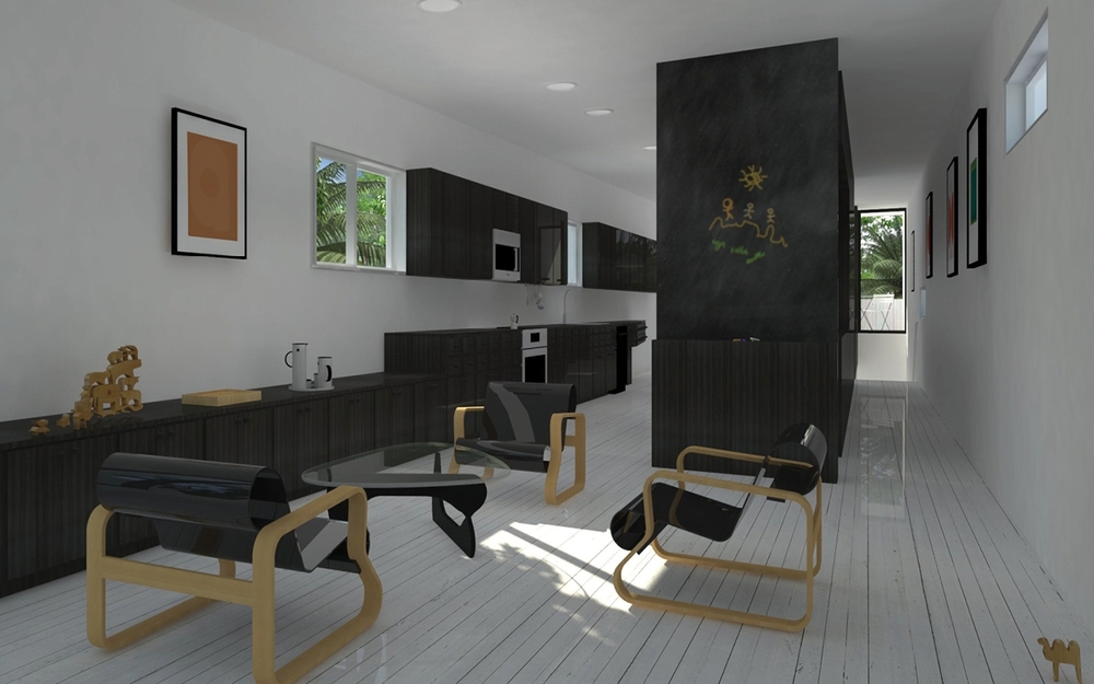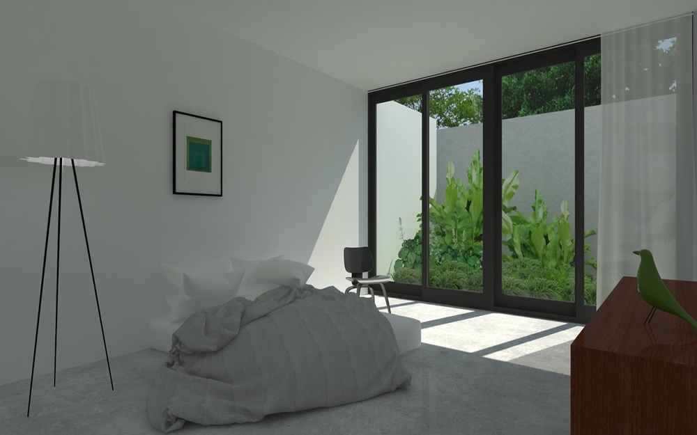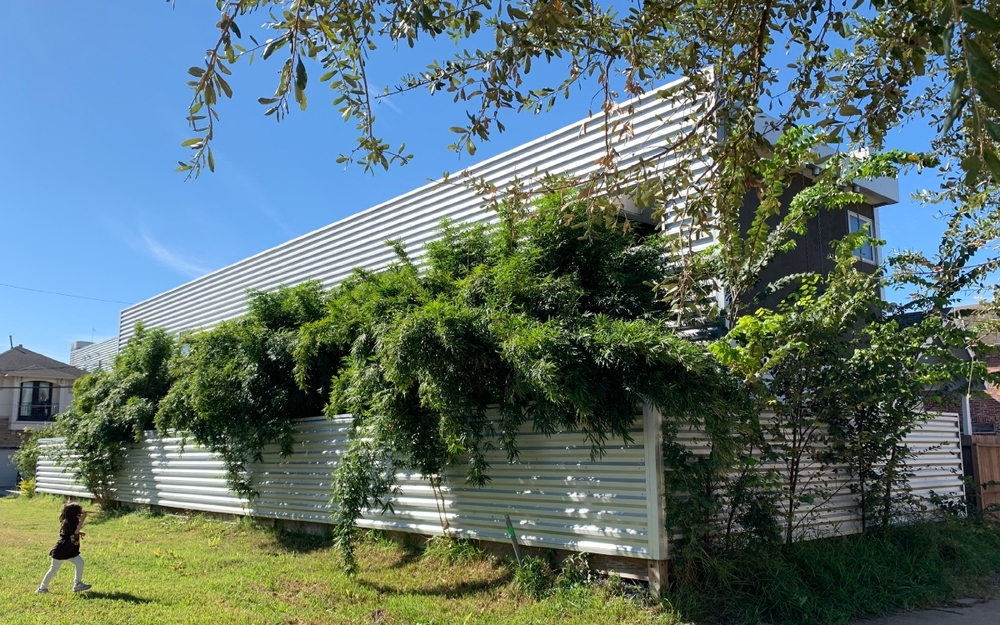Shotgun House - Over and Under is a house type conceived as two Shotgun houses, stacked atop one another. With this variation, access to natural light, ventilation, flora, fauna, and economization of wood framing materials are maintained. The ground floor houses all functions related to sleeping. It is enclosed and partitioned by a series of walls that move from interior to exterior to create an extension of the private gardens into the sleeping spaces. The second floor houses all public functions and is an open floor plan with vegetated micro-climates at either end.