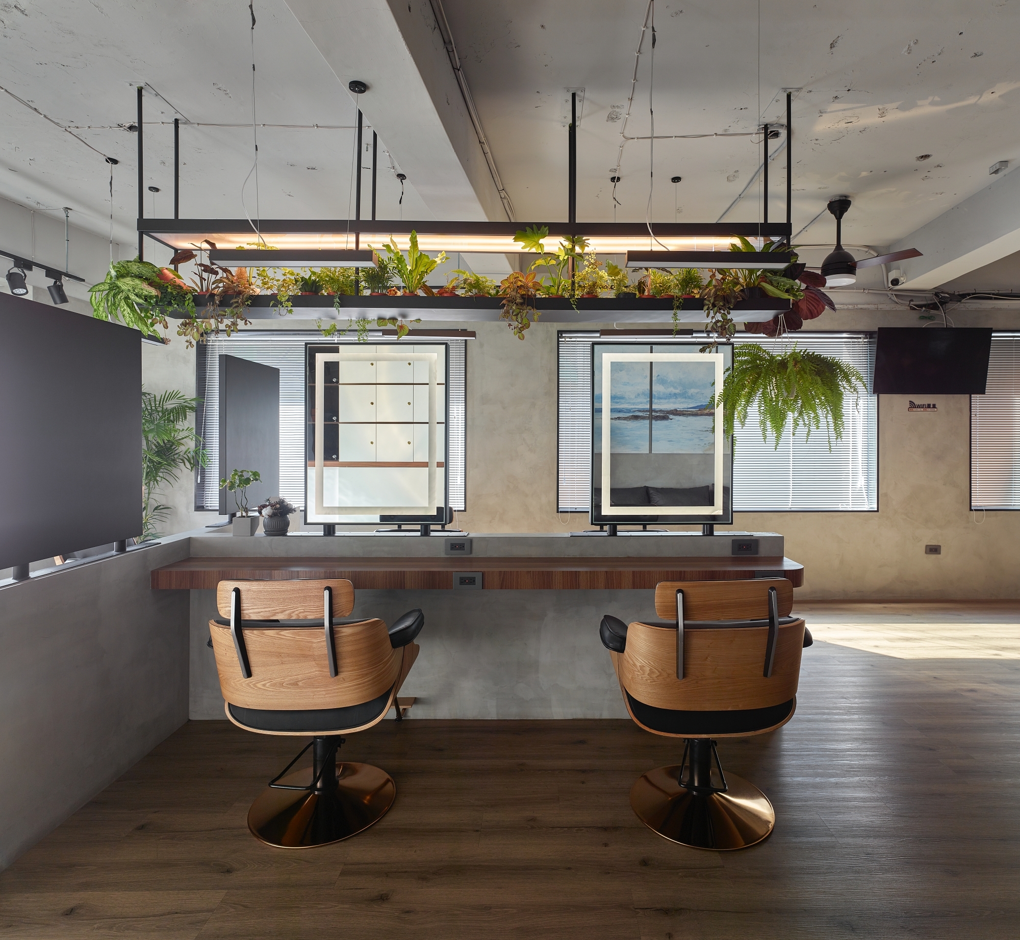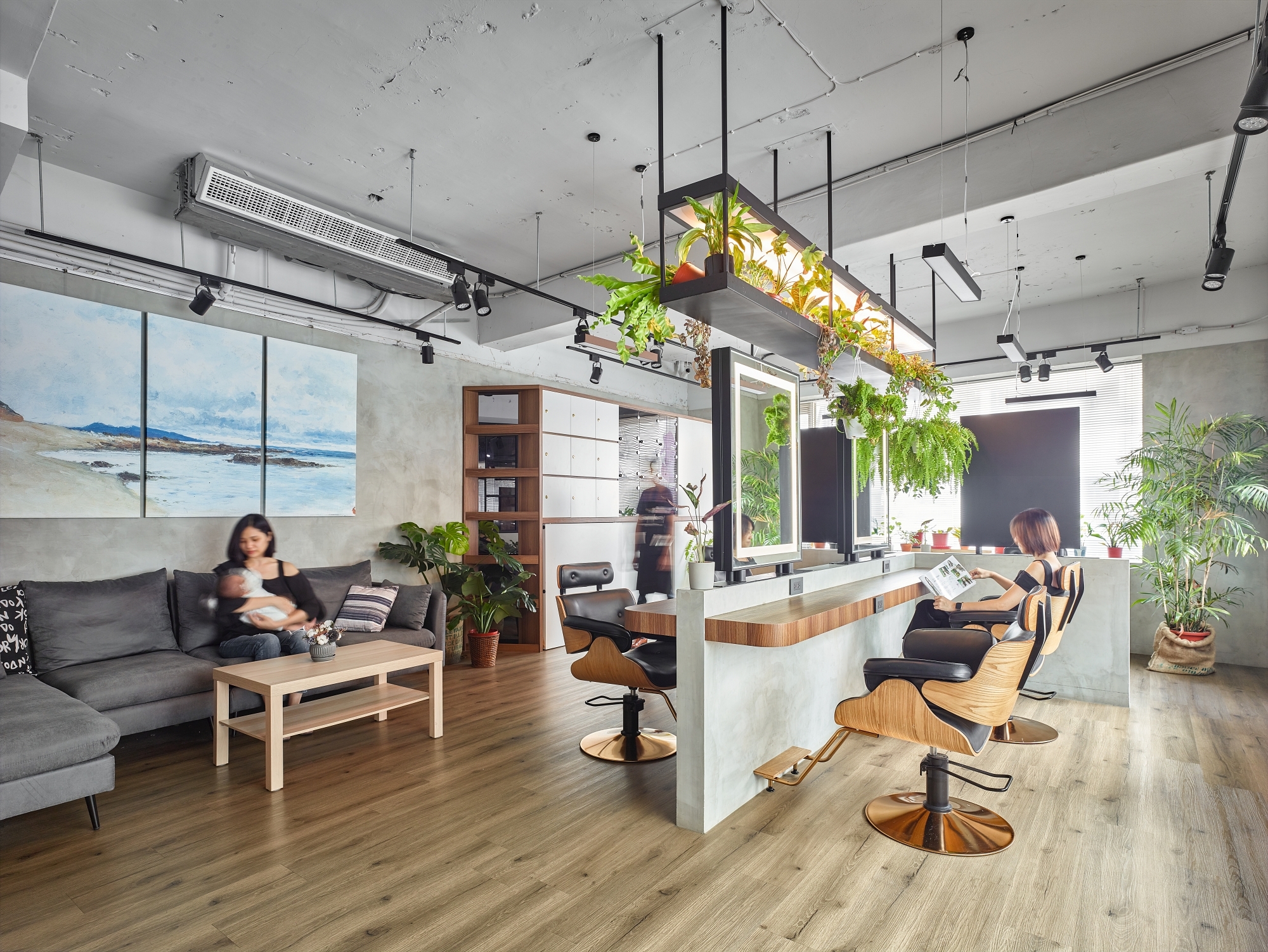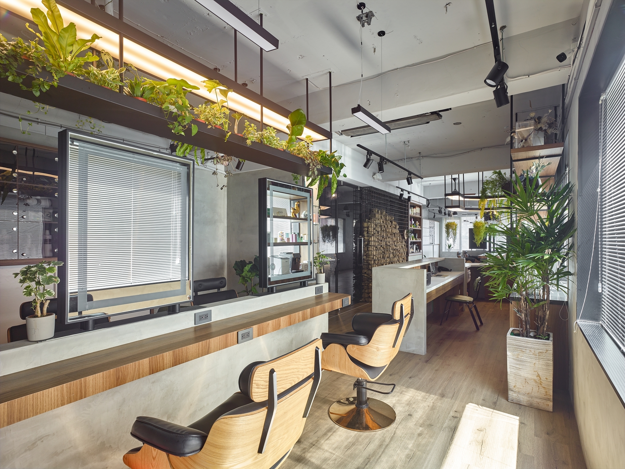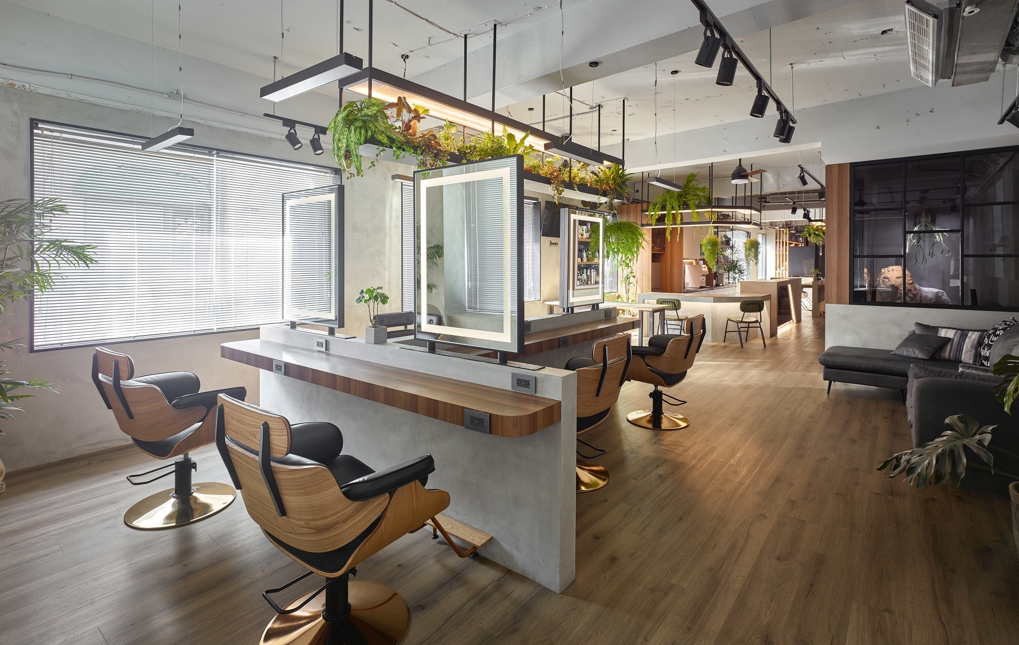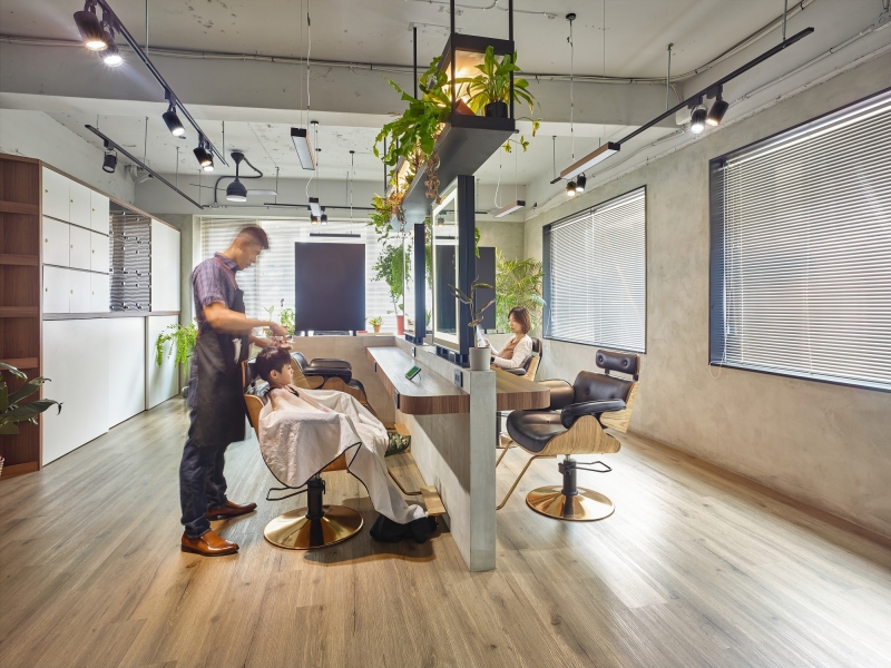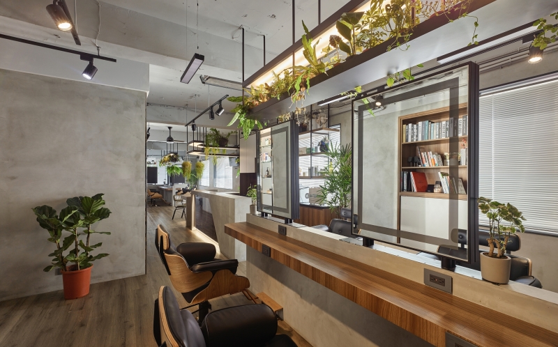 To make it stand out and deliver this second-floor space a unique new look, we use wood grain and plants to bring the bare concrete interior alive. The life-sized lion lamp and hanging greenery create a hideaway vibe in this midtown salon while mixing a sense of the wild with clean modern lines. Spaces are arranged with functions defined, as a T-shaped island seating area and tool storage cabinets are designed considering natural light and customer privacy, making hairdressers’ work flow smooth.