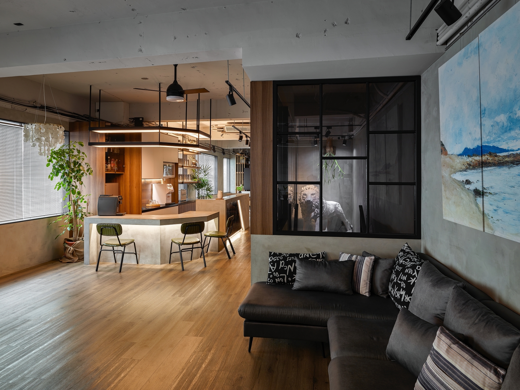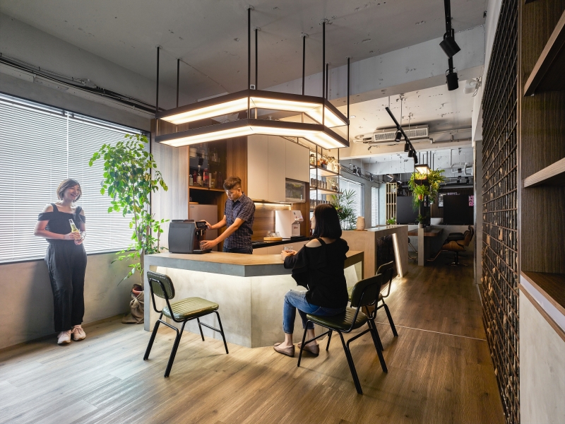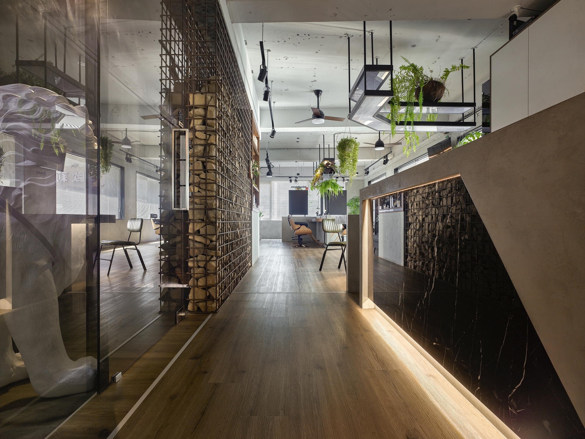 We remove the ceiling layer to reduce visual oppression and use the hanging shelvings with light fixtures and plants above the reception and seating area to render a calm ambience.
