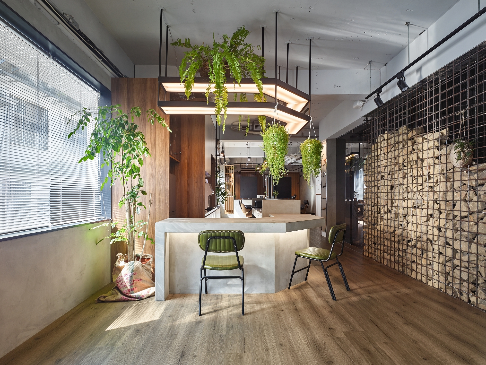 Inspired by the owner’s love of the lion-shaped lamp while utilizing the privacy of the second-floor space, our design brings the jungle flair into this urban space through natural elements such as green plants, wooden floor and tables, allowing customers to enjoy an experience of “secret adventure.” Extending the masculine imagery of the king of beasts, the gabion wall with exposed steel bars and concrete present a raw natural vibe, creating a secluded retreat contrasting with a bustling area.