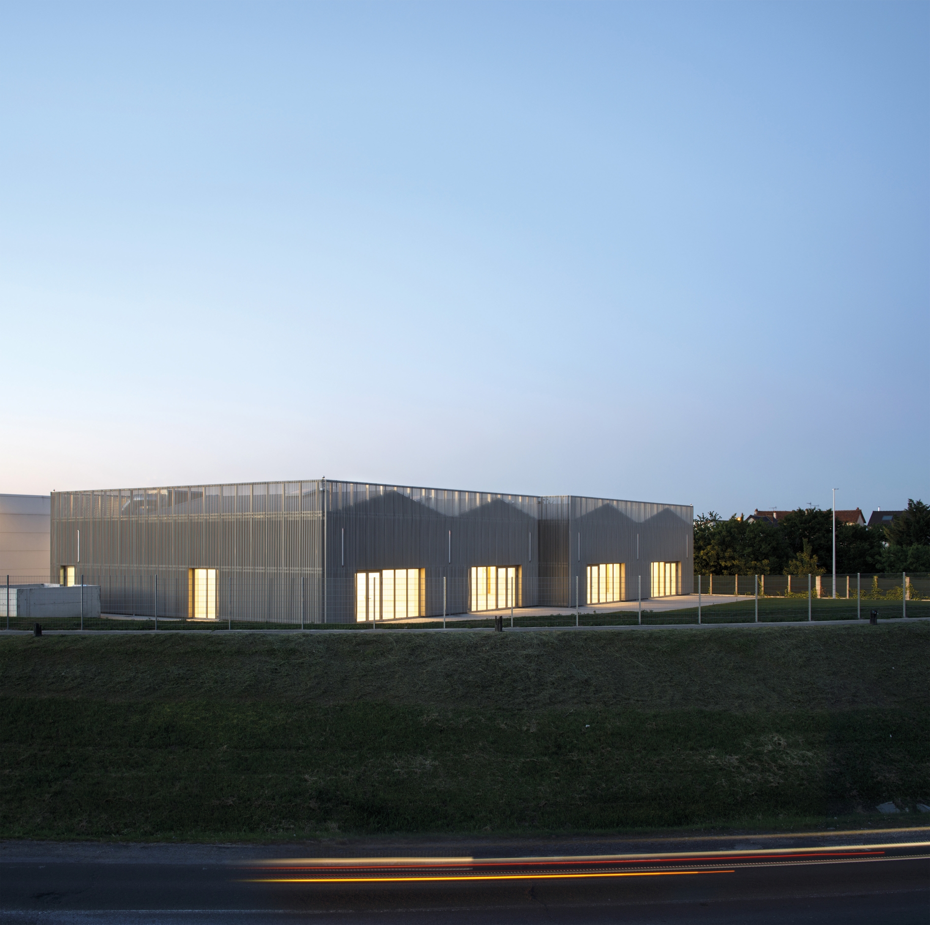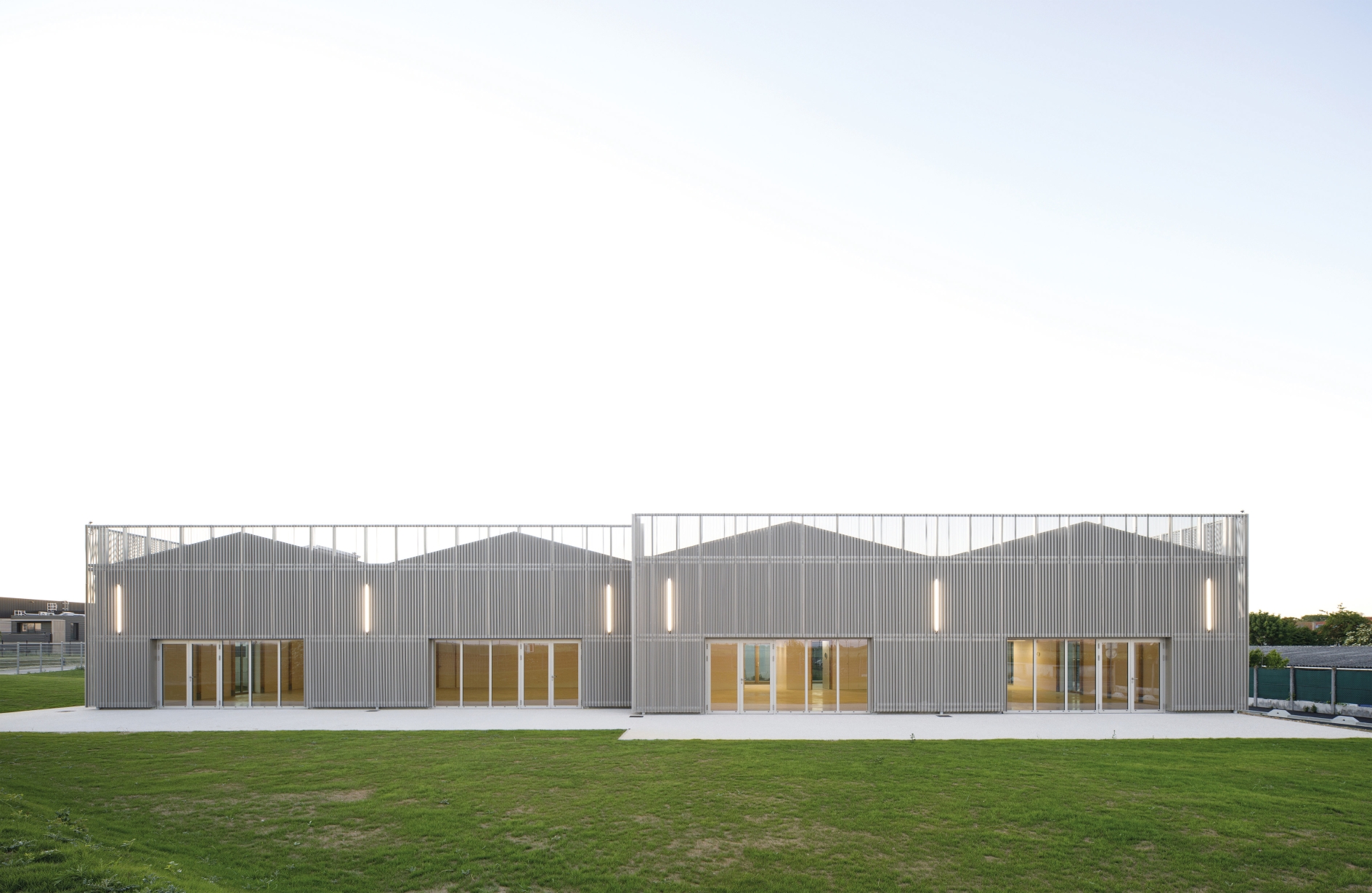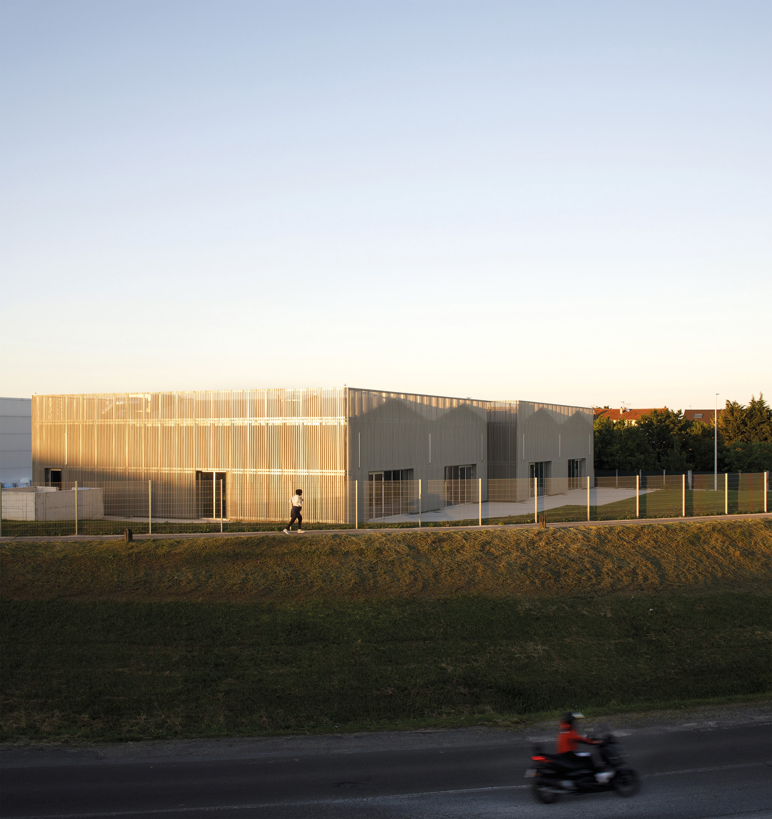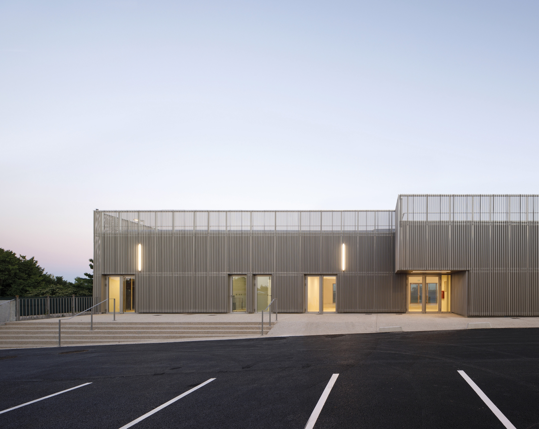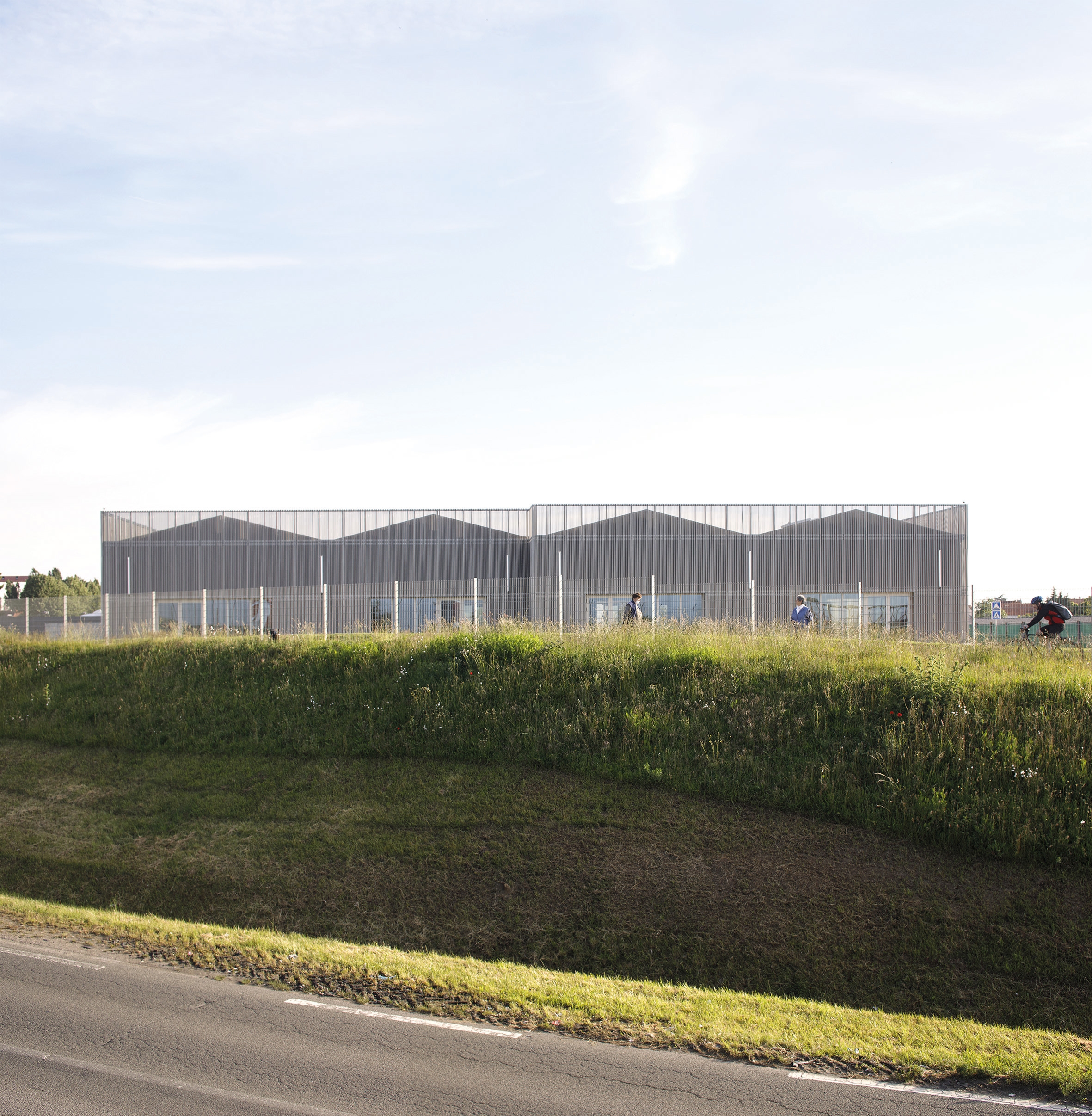 The perforated corrugated cladding of the façade gives the whole its public and institutional dimension, allowing the hall to reinforce its presence in this peri-urban landscape and to offer a changing and renewed image of the facility through the play of reflections and transparency.