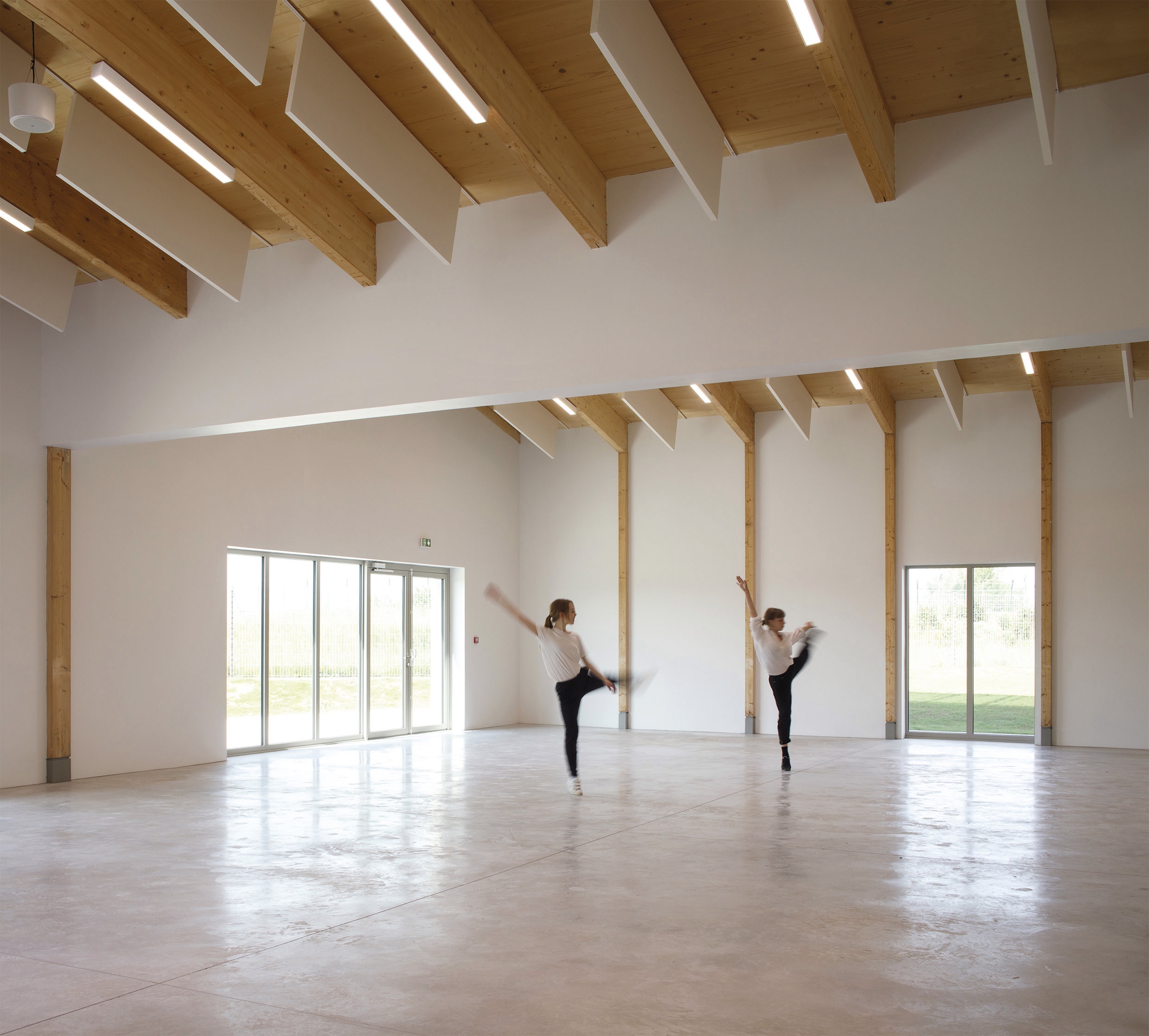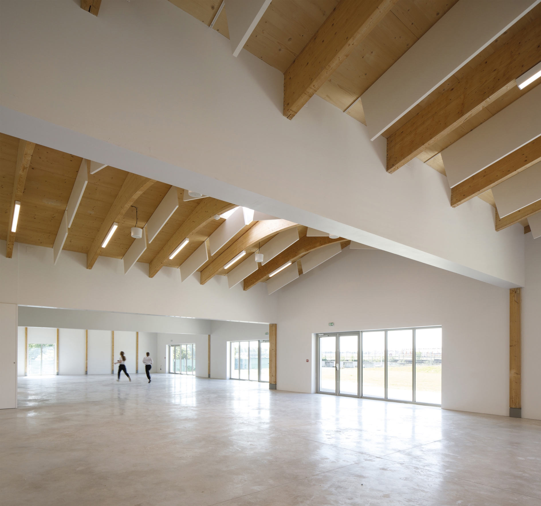The building's structure, designed entirely in timber frame, houses a large convivial space that can be divided into two or three rooms, the deep beam drops of which form acoustic alcoves. The alternation of porticos and wooden beams imparts rhythm to the interior of the rooms, revealing the building's constructive system and giving it a domestic atmosphere.