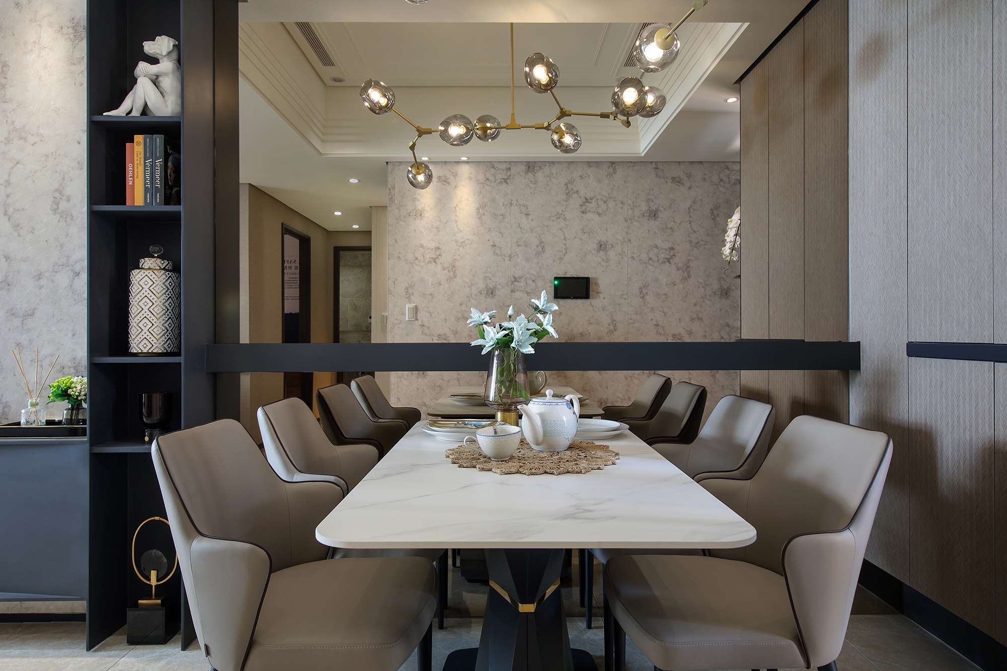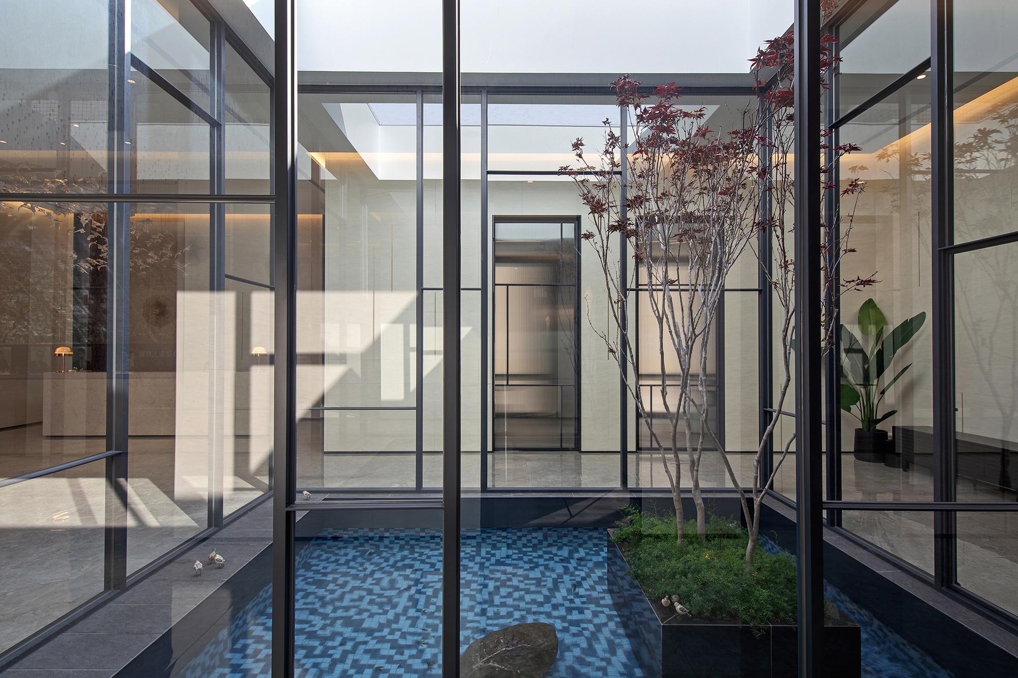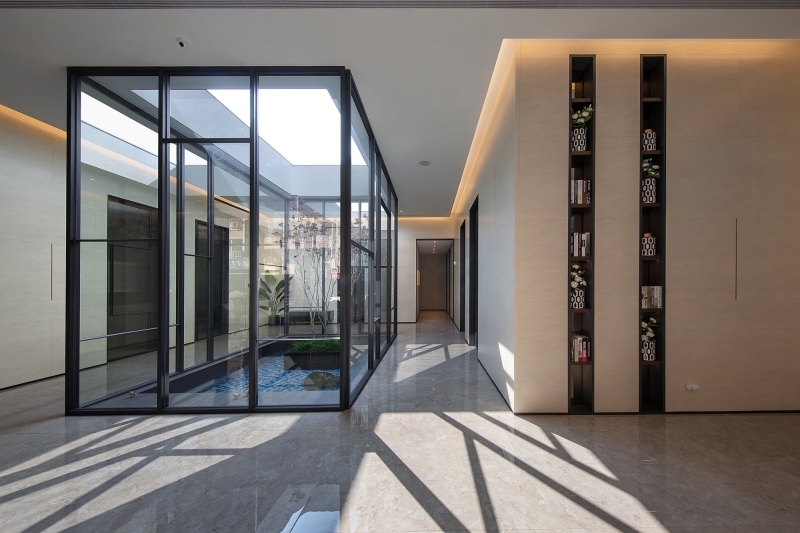 To expand the spatial perception and strengthen the translucency, the designer applies semi-transparent glass panels and black hardware to build the door and the atrium.